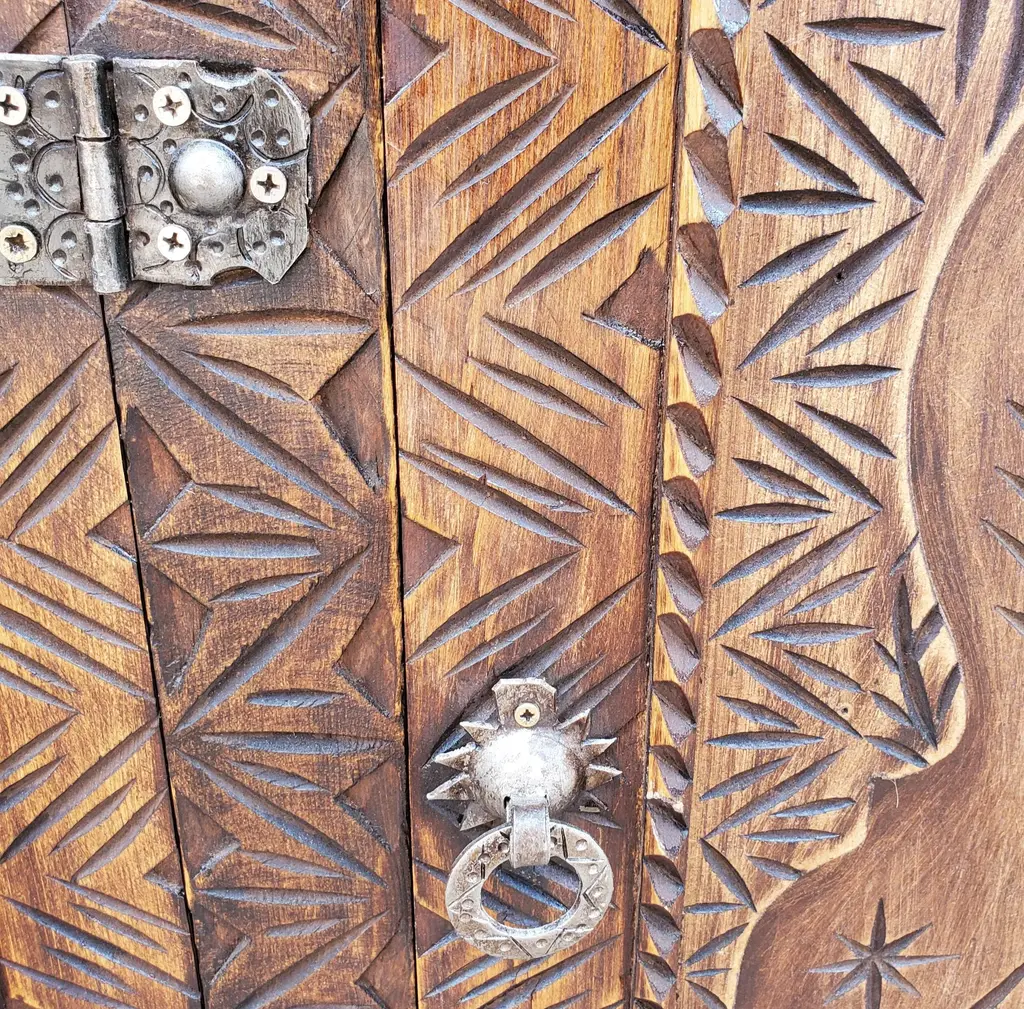 Just arrive!! Handmade in Rabat, Morocco. Beautifully carved cedar wood cabinet. With plenty of storage space, and can be used as a TV stand, aquarium support base, small blanket chest, or just stand alone as a show piece. Lots of Berber style carvings throughout as you can see in the pictures. The stand measures approximately 67" in length, 38" in height, and 19" in depth