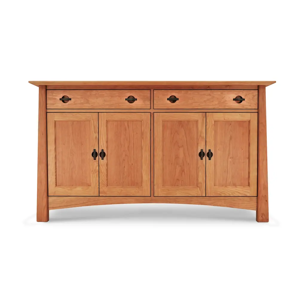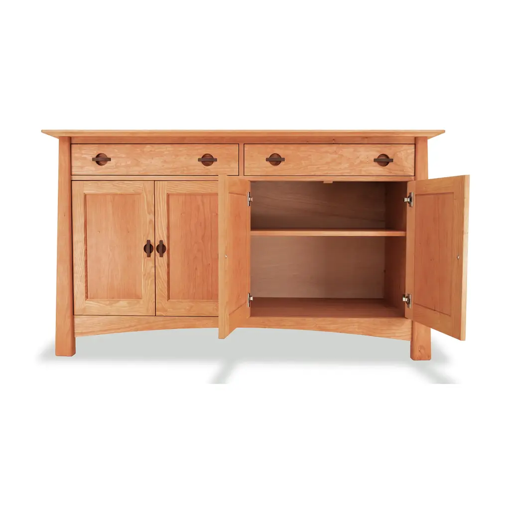 Our high-quality Large Cherry Moon Sideboard-Buffet is 63" wide, giving you tons of style and storage in your upscale kitchen or dining room. We use solid, sustainably harvested hardwoods and an eco-friendly oil finish. Adds modern flair combined with traditional, durable craftsmanship to your high-end dining room.Walnut pulls are standard, regardless of hardwood selection for the overall piece.This sideboard has 2 sections with 1 adjustable shelf behind each set of doors. (2 adjustable shelves total).Base price represents sideboard in natural cherry with natural walnut pullsShown in natural cherry with natural walnut pullsMatching furniture available in our Cherry Moon Furniture Collection