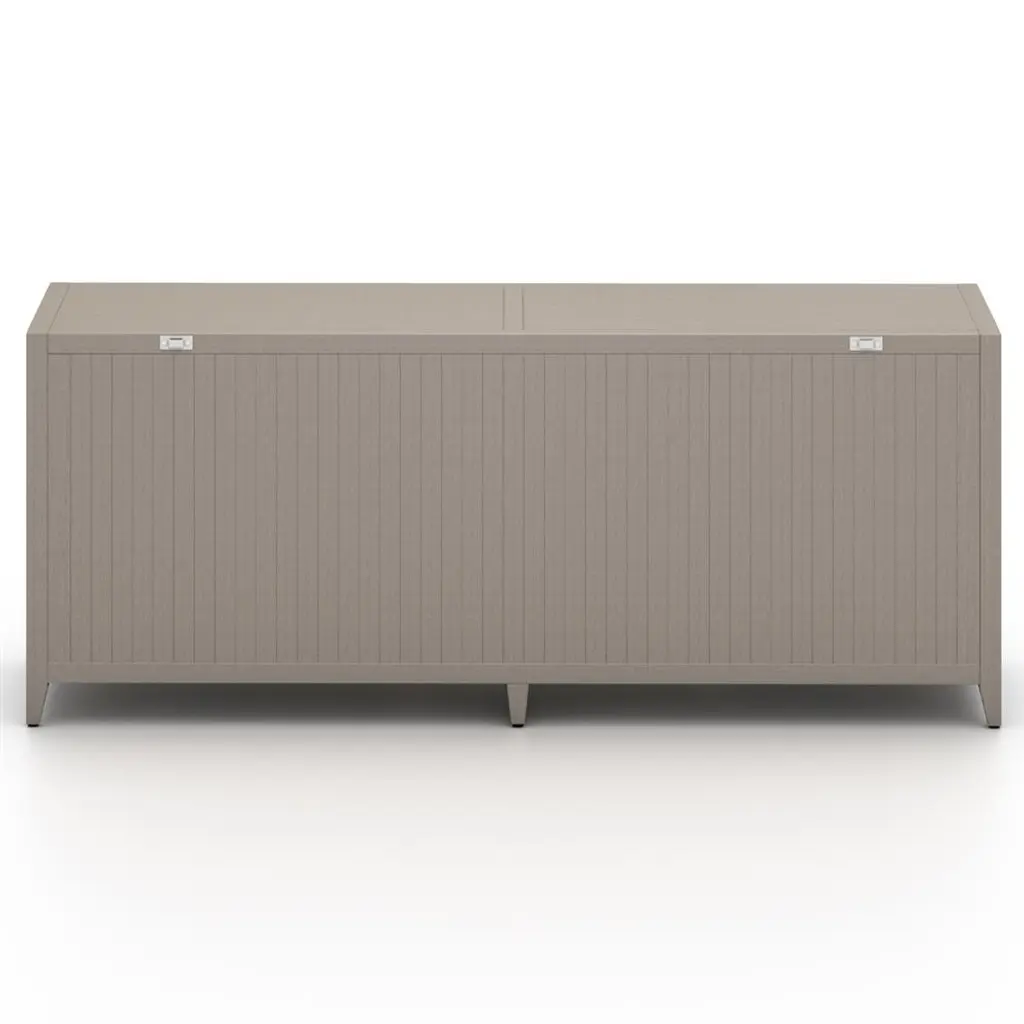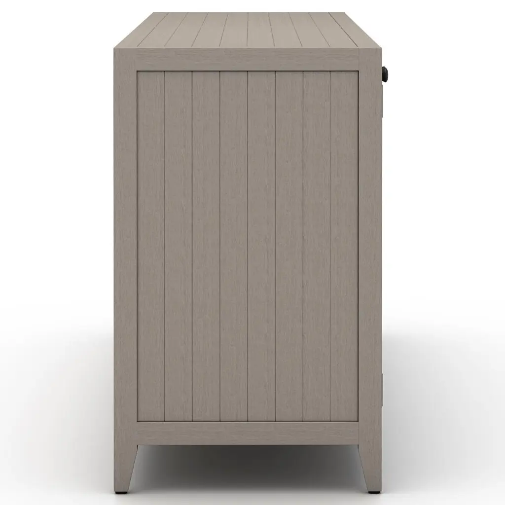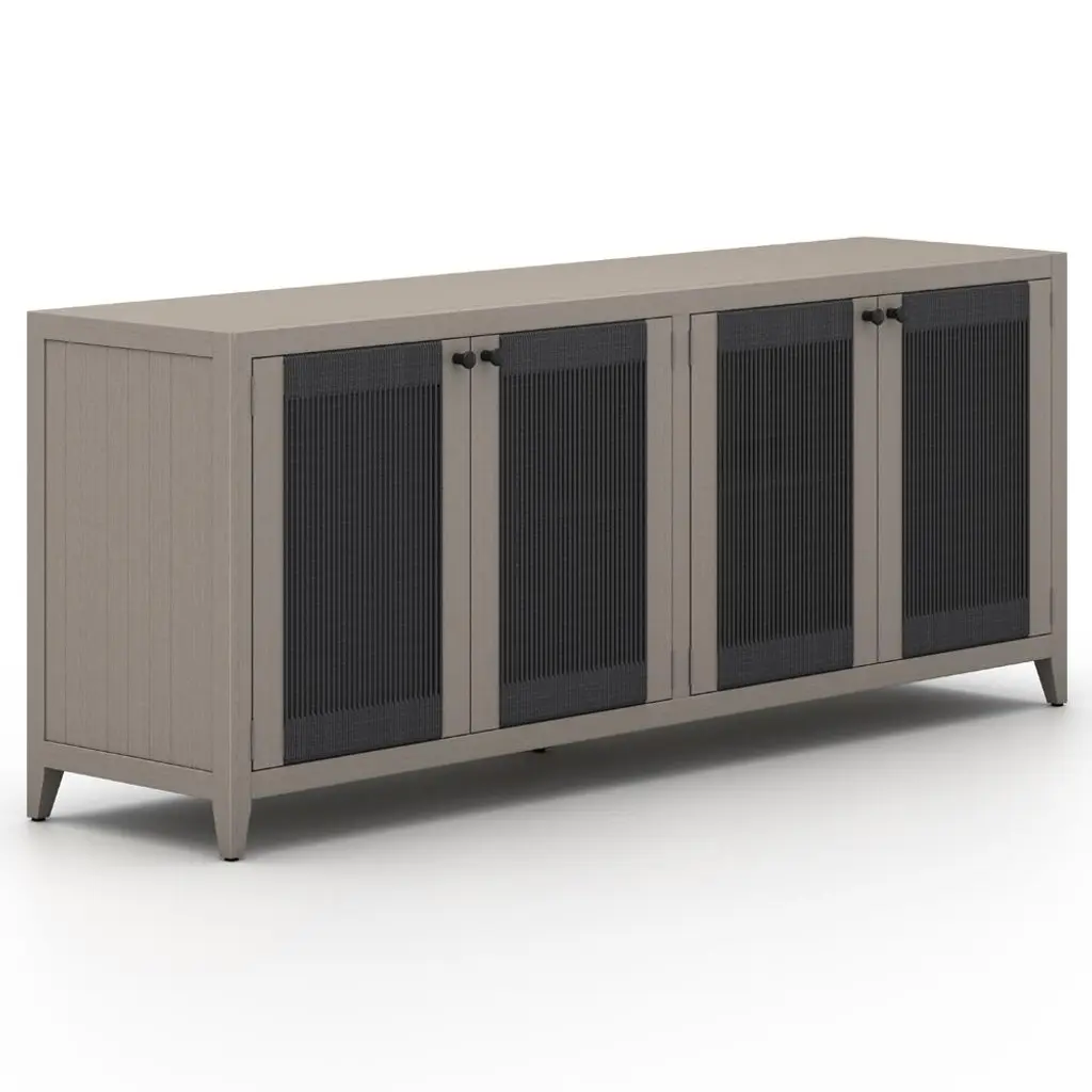 Made from FSC-certified teak in a weathered grey finish, the Cheryl sideboard elevates any indoor or outdoor space with its stylish and functional silhouette. Accented with dark grey rope detailing, four doors open to spacious interior compartments with plenty of room for storage.