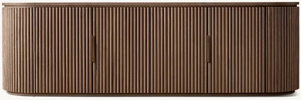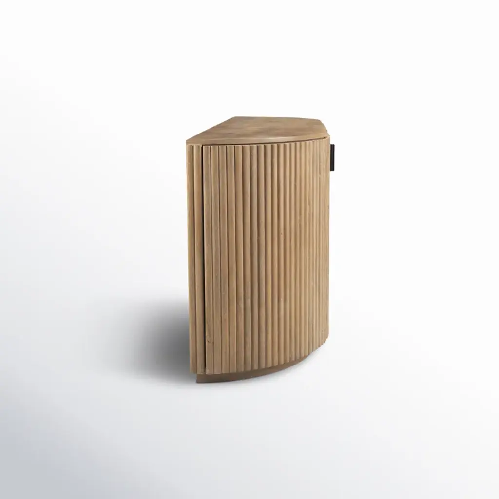 This sideboard is a statement piece that marries form and function with its curving silhouette and rustic vibe. Crafted from kiln-dried solid Mango wood, it showcases a sandblasted texture that highlights the natural wood grain variations. The four doors, adorned with a fluted design and gold-finished hardware, open to reveal ample storage with six interior shelves. For added stability, consider using a wall anchor (sold separately).