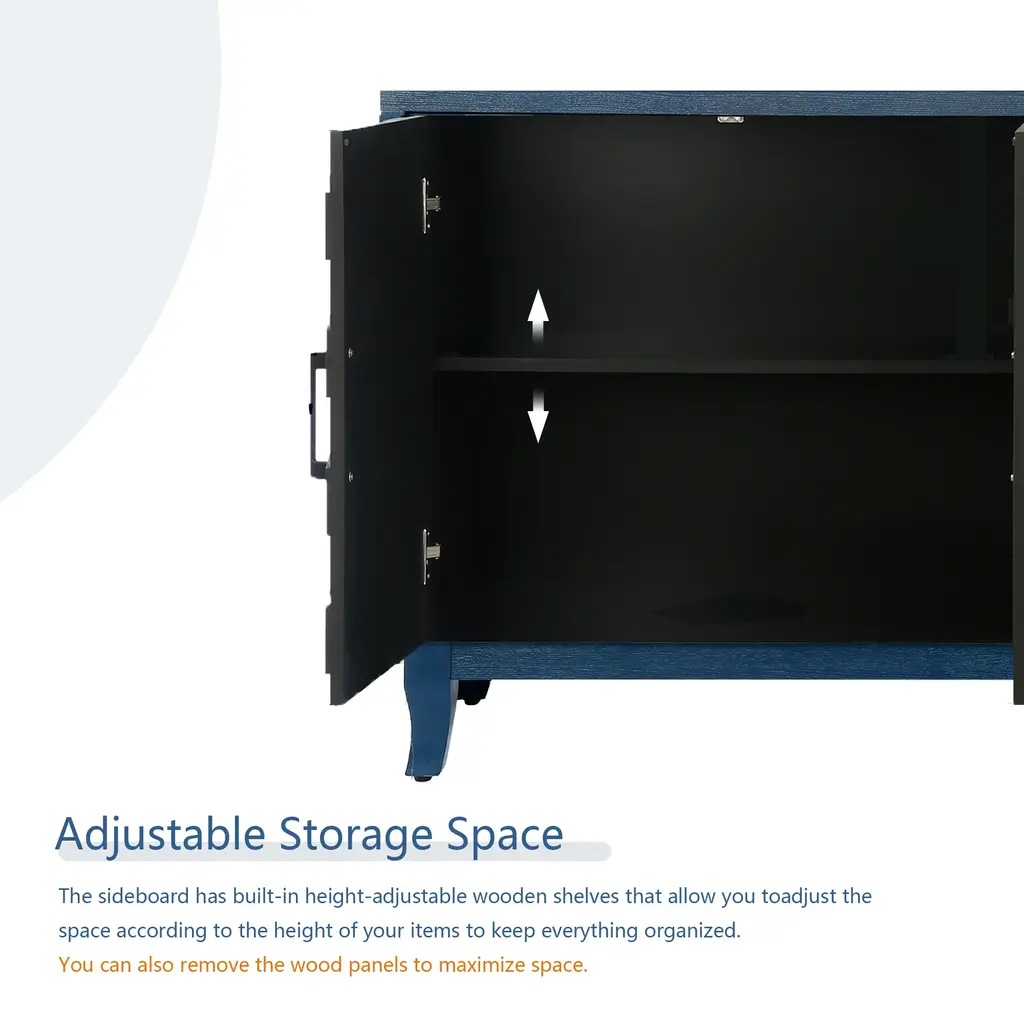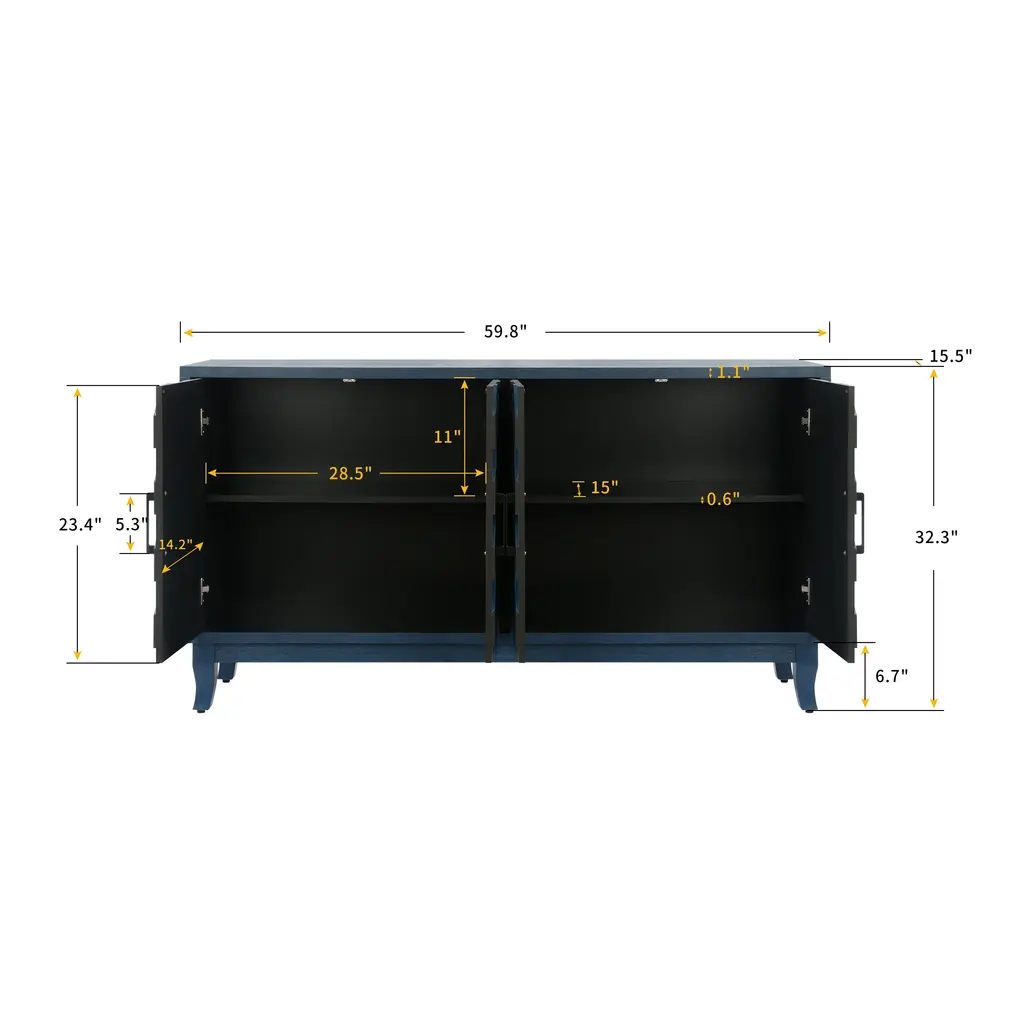 We've upgraded this sideboard compared to other similar products on the market. It uses higher quality MDF as the frame material with a friendly lacquered finish and a thickened solid pine wood stand, which enhances the safety and durability of this buffet; Our designers have combined aesthetics and practicality with a neat and smooth line as the main body with a unique striped door design to meet the aesthetic standards of every era. Perfectly match any home decor. It can be used as a console cabinet, a sideboard self-service server, or as an elegant storage cabinet; The wide four-door design divides the interior into two separate spaces. This multifunctional storage cabinet has two shelves that provide enough storage space for your clothes, everyday items and books. The shelves can be adjusted at two different heights to meet your needs. The legs are 6.3 inches high designed to make it easy for you to clean up without leaving dead ends; The locker measures 59.84''W x 15.55''D x 31.50''H . We come with all the parts and detailed installation instructions, assemble as shown in the instructions and you will have a perfect storage cabinet in no time.; Thank you for choosing us. Our warehouse is in USA, when you place an order we will pack the product to your home as soon as possible