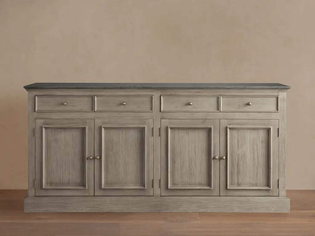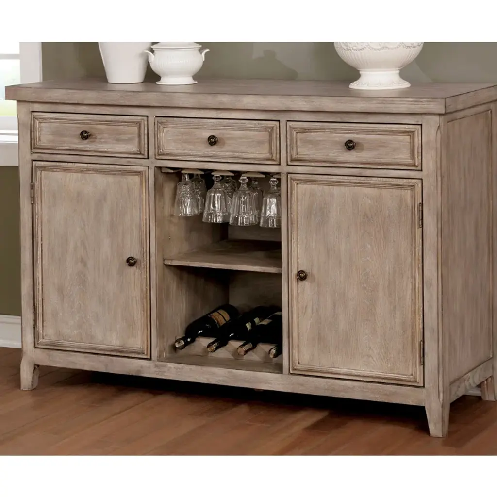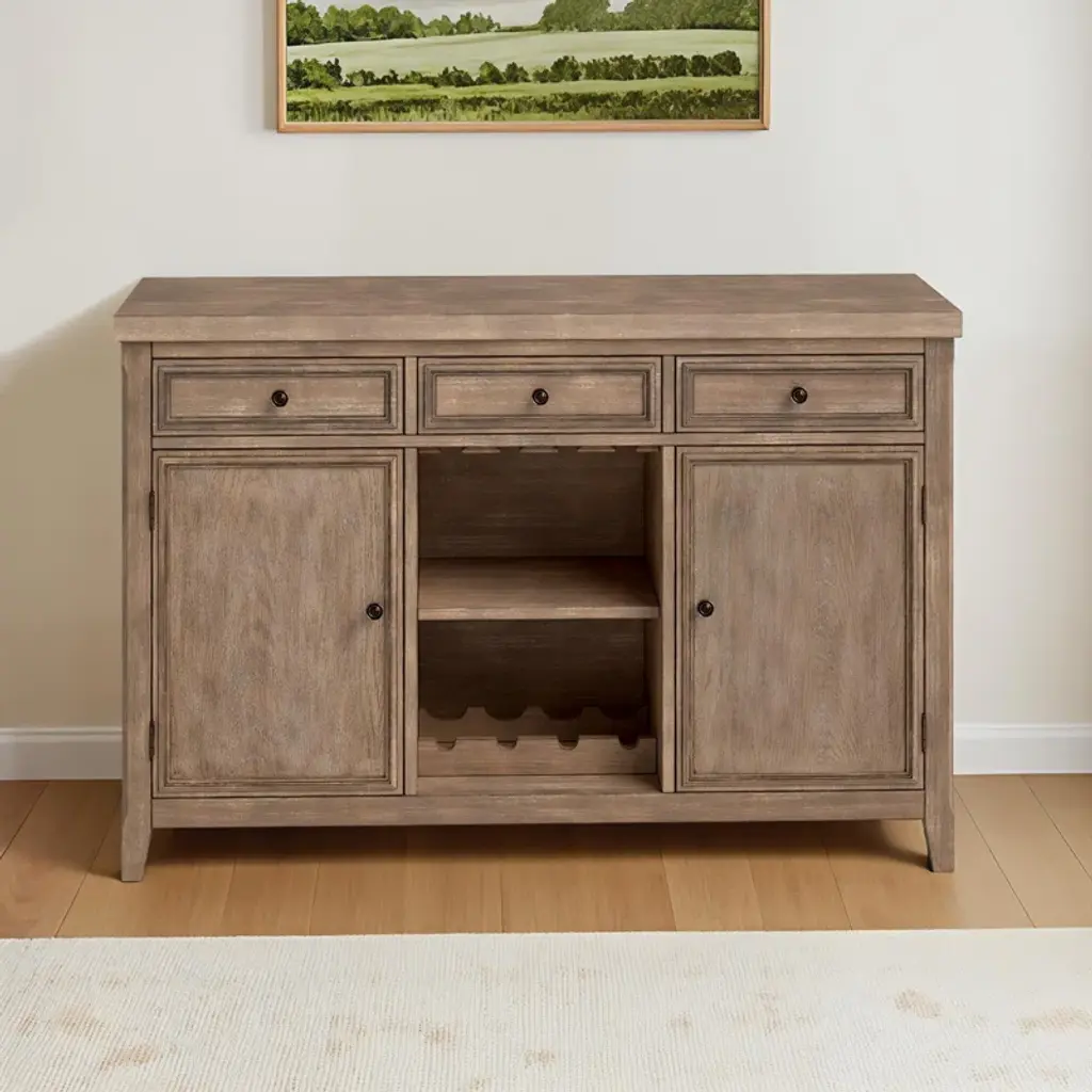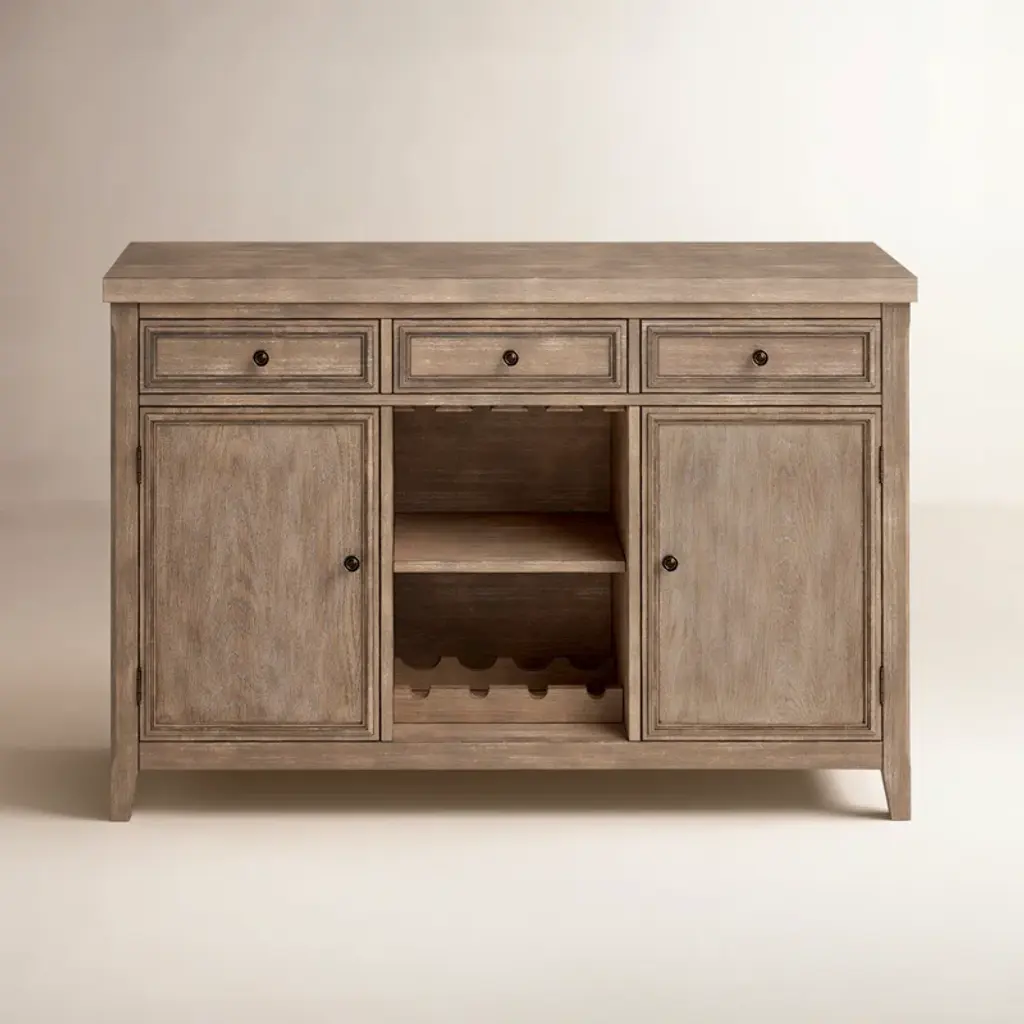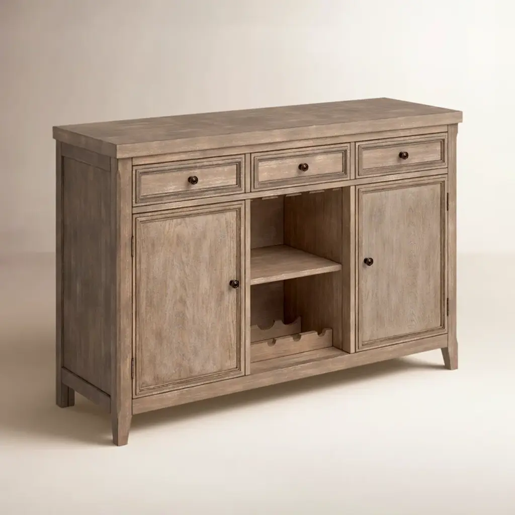 Elevate your dining space with this rustic sideboard, offering ample storage and a touch of farmhouse charm. Crafted from a blend of solid and engineered wood, it showcases natural wood grain variations and purposeful distressing for a well-loved look. Three drawers and two cabinets with adjustable shelves provide space for your tableware, while an exterior shelf and built-in wine rack keep your favorite bottles and glasses within reach. Just remember to keep it clean with a simple spot treatment. Enjoy the warmth and functionality it brings to your home.