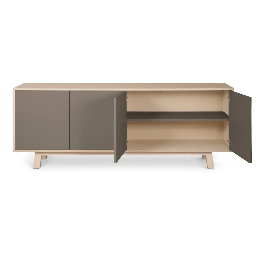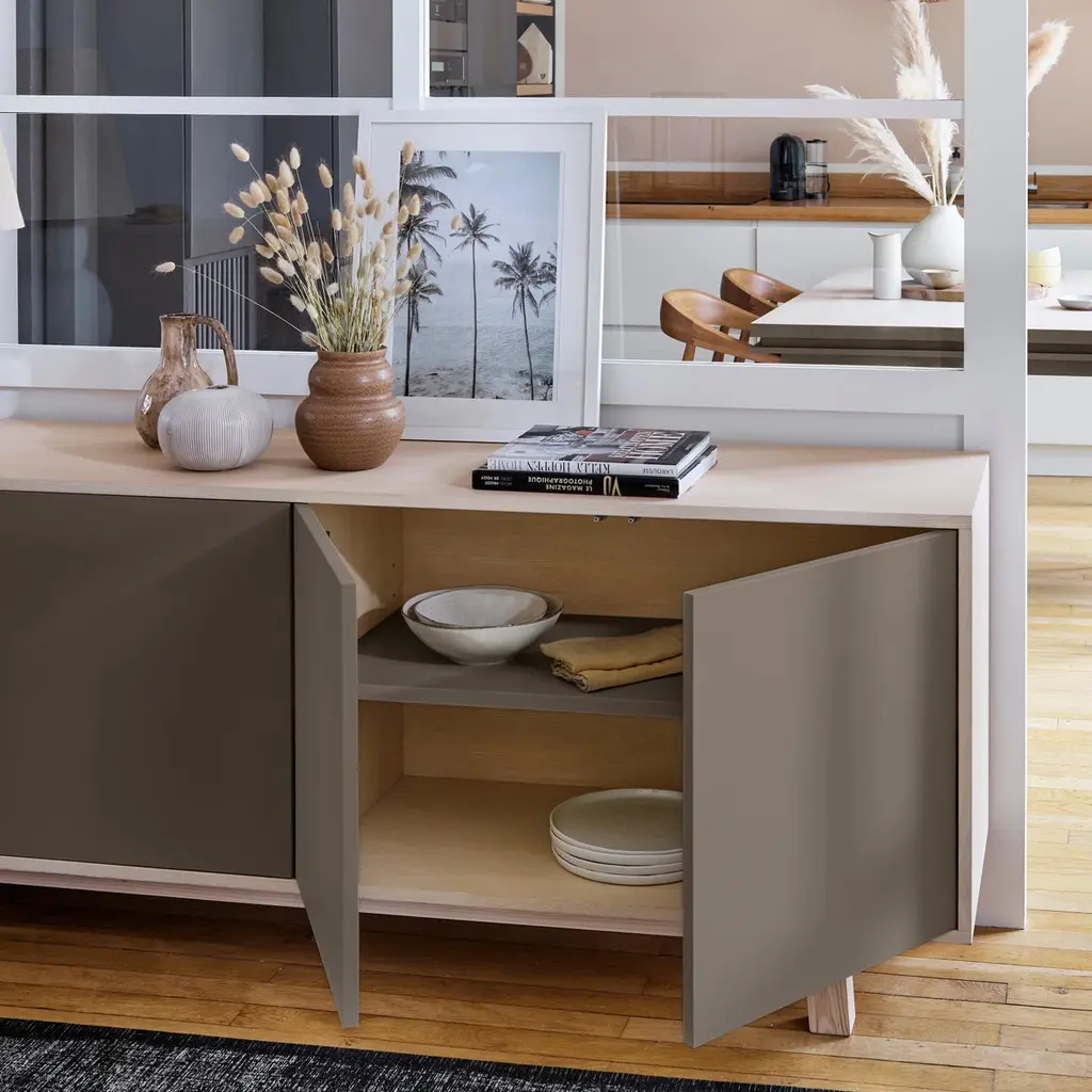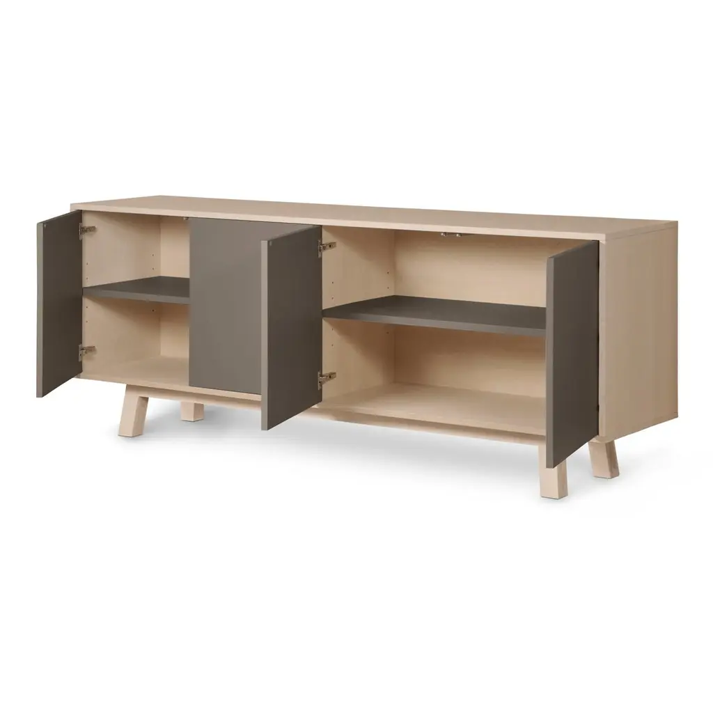 This 4-door sideboard is presented here in ash wood and is also available in French oak. No assembly is required from your side, our furniture is fully mounted in our workshop. 2 height-adjustable shelves are supplied with the buffet. To prevent damage during transport, they are positioned at the bottom of the buffet. All you have to do is place them on the cleats (supplied) at the desired height upon delivery.The 4 doors open with a « push & release » pressure on front.11 standard colors are available. Have a look at our color chart on the last picture.5 standard lengths are available from 160 cm / 63.0" to 240 cm / 94.5". ÉGÉE COLLECTIONThis low large sideboard is part of the ÉGÉE collection, designed by the Parisian designer Eric GIZARD who here adopts the refined codes of Scandinavian design. combining natural materials, elegance and sobriety of lines by adding very beautiful muted and "trendy" colors.Inside the ÉGÉE collection, the KUBE concept is designed to offer an optimized and aesthetically pleasing storage concept.MON PETIT MEUBLE FRANÇAISoffers you 100% French products. The solid wood comes exclusively from sustainably managed French forests.The manufacture and finishes are of very high quality, carried out in French workshops in Mayenne, France.
