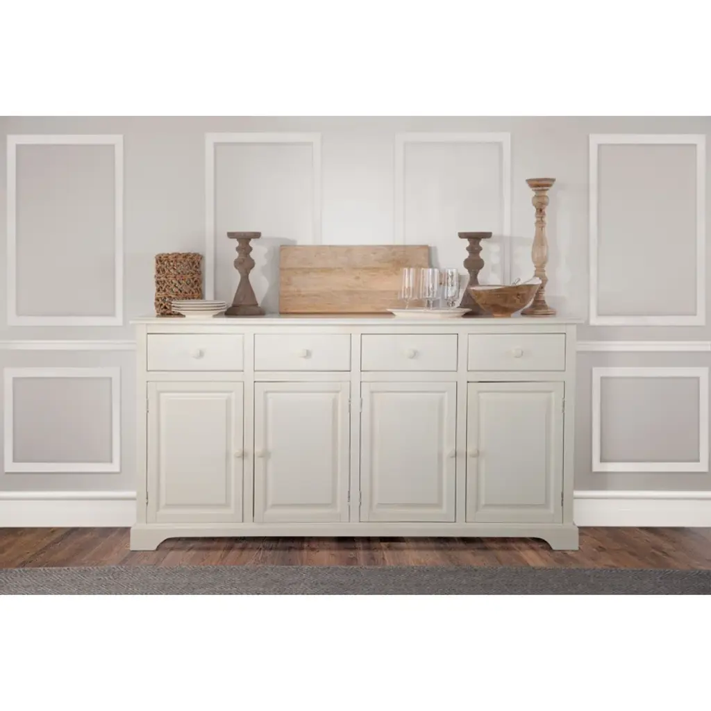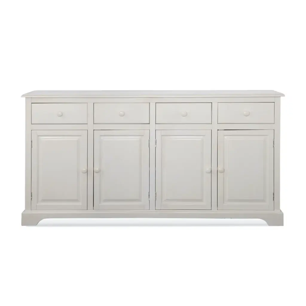 This sideboard is chock-full of rustic charm and modern farmhouse vibes. It's crafted from solid wood with a distinctively weathered two-tone finish of limestone and natural driftwood brown. This server's lower section features two sets of paneled double doors that open to reveal a spacious interior for dinnerware and living room essentials. Three upper drawers corral all of your odds and ends. Plus the table top stretches just under 71" wide, so it's the perfect spot for a coffee station or your appetizer spread. For extra stability, we recommend using a wall anchor (sold separately).