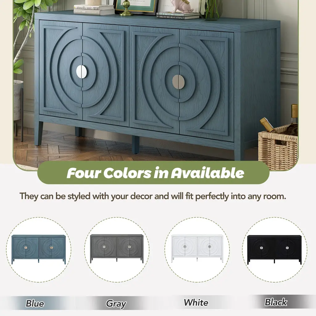 This retro sideboard has four doors with rounded lines on the doors to create a three-dimensional look. You can put it in the kitchen, entryway or living room, the country style cabinet adds a warm atmosphere to your home. This cabinet is made of rubber wood + acacia wood + MDF, which enhances the stability and durability. The surface of the cabinet body is painted and distressed, and the door has a round metal handle, which makes the cabinet more textured. Two large cabinets can meet your storage needs, and you can put home appliances, bowls, glassware and plates in it to make your home more tidy. The cabinet has built-in adjustable shelves, which you can adjust according to the size of the items. There are three adjustable heights. You can choose from four colors, antique blue, gray, white and black. Each color presents a different style. Gray and black are more classic, and white and antique blue are brighter and more prominent. They can be styled with your decor and will fit perfectly into any room. Full assembly required. This product comes with detailed instructions, and it can be installed step by step following the instructions, which can help you complete the assembly as soon as possible.