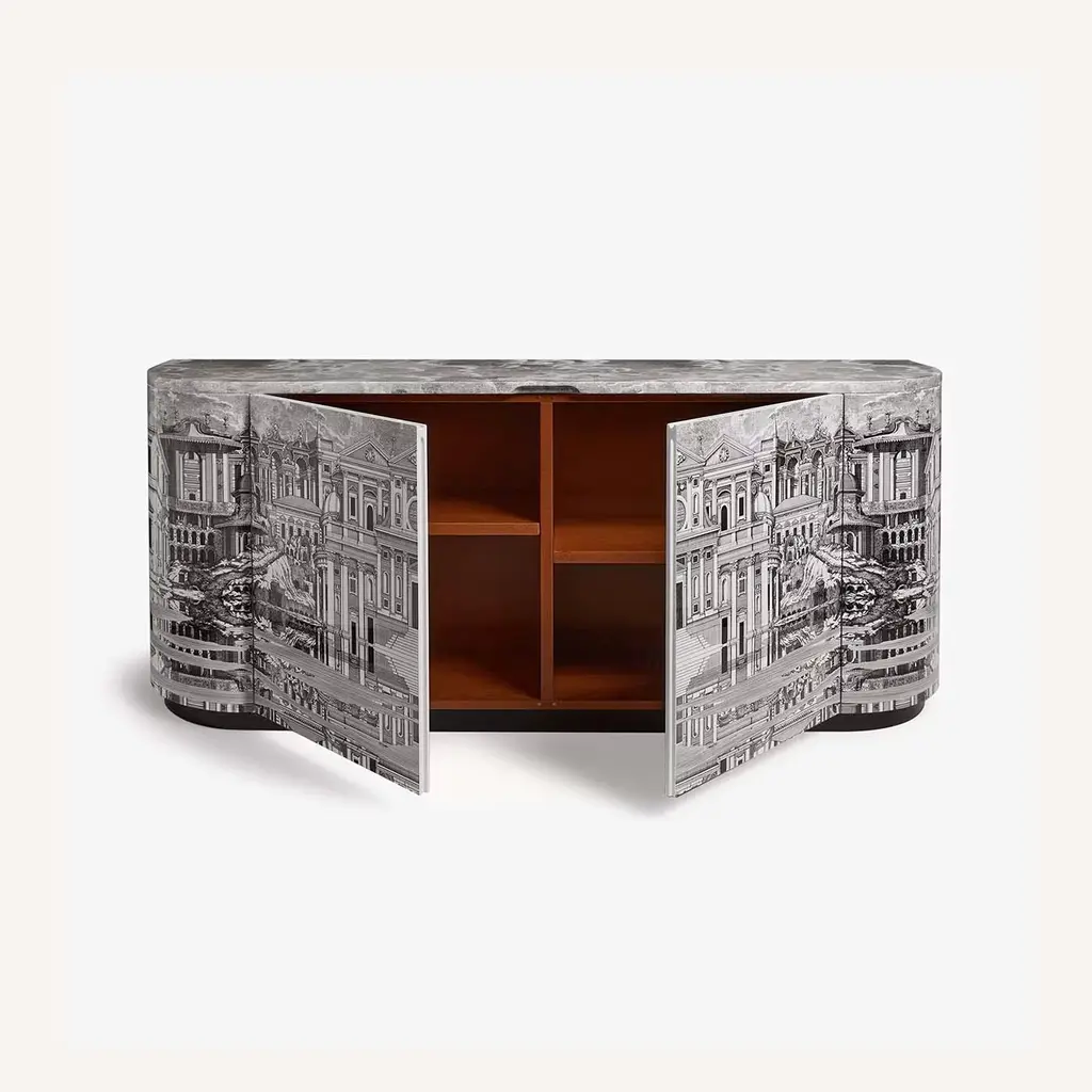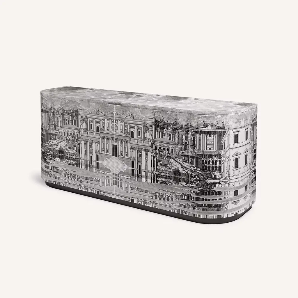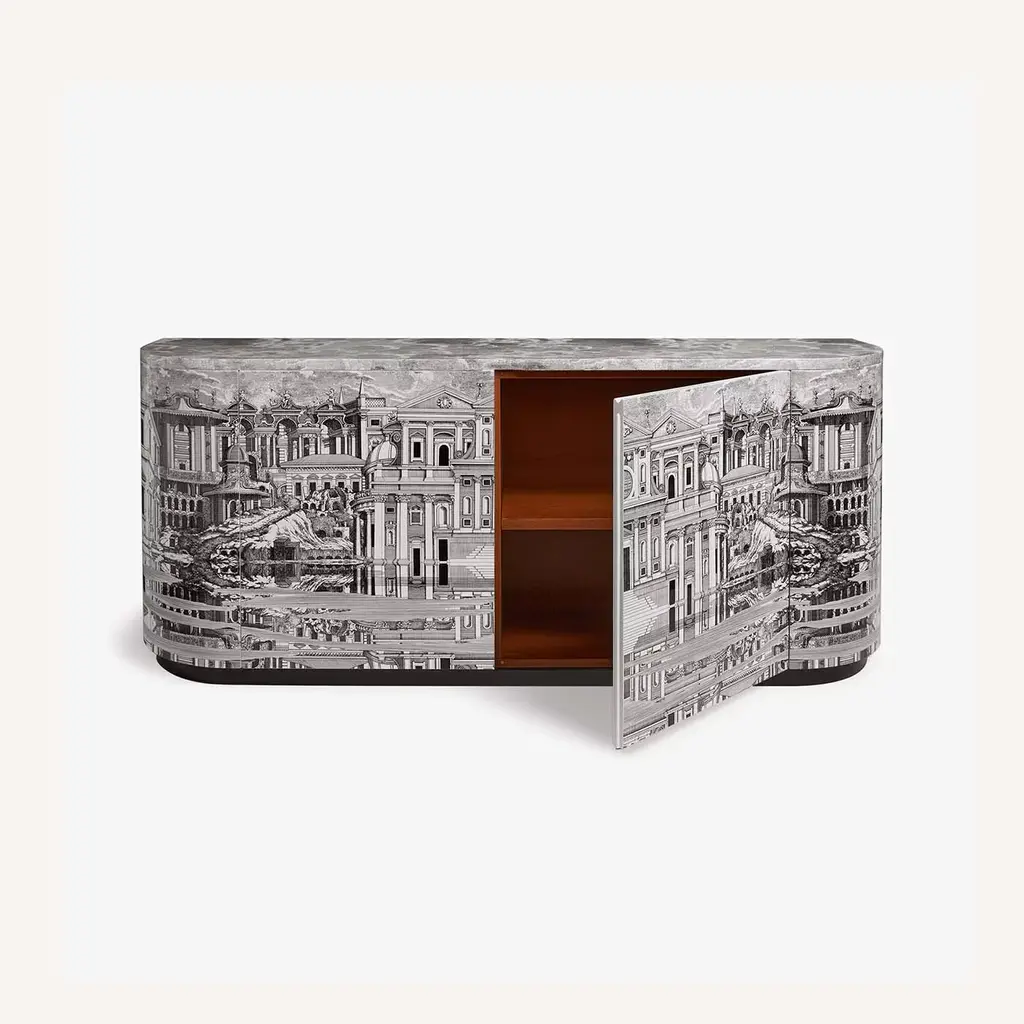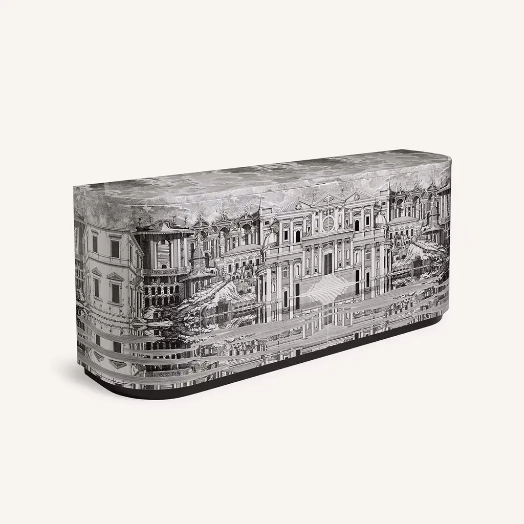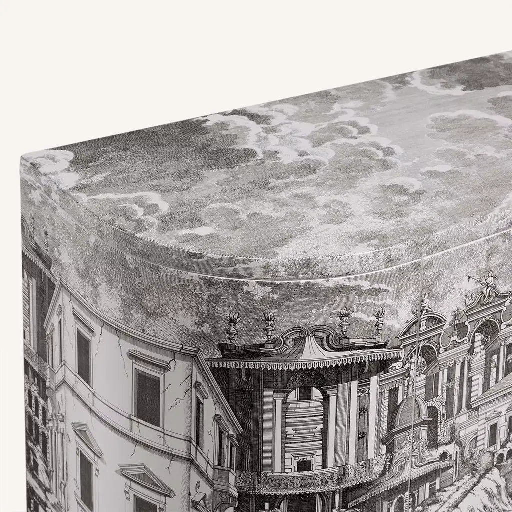 This piece of furniture, screen-printed and lacquered by hand, is embellished by one of Fornasetti's most famous architectural decorations, designed to associate its practical function as a container with an aesthetic value that makes it a talking point in any space. Any minor discrepancies between similar creations are the result of craftsmanship and attest to the uniqueness of each product.
