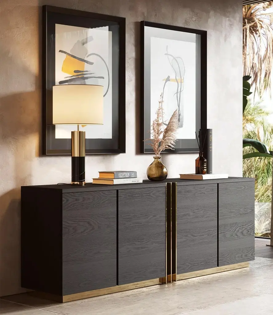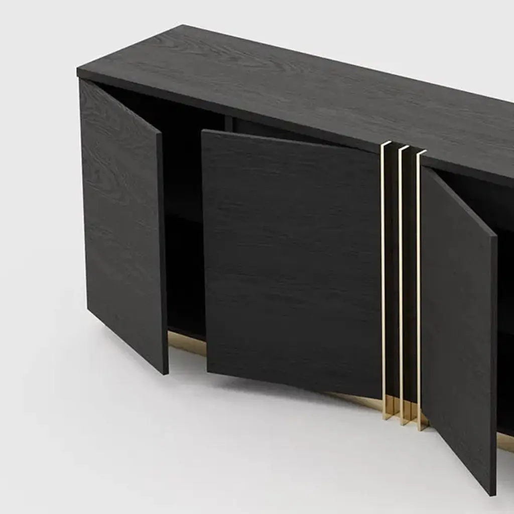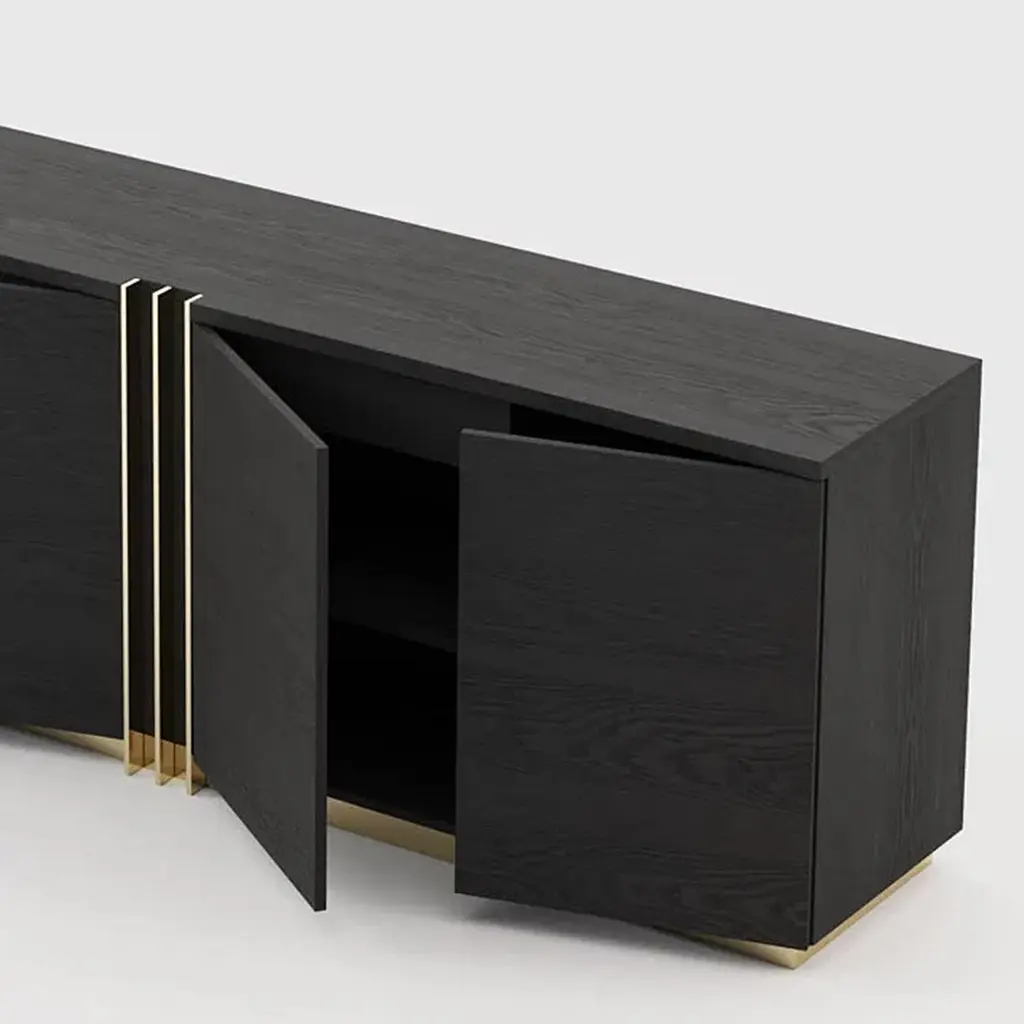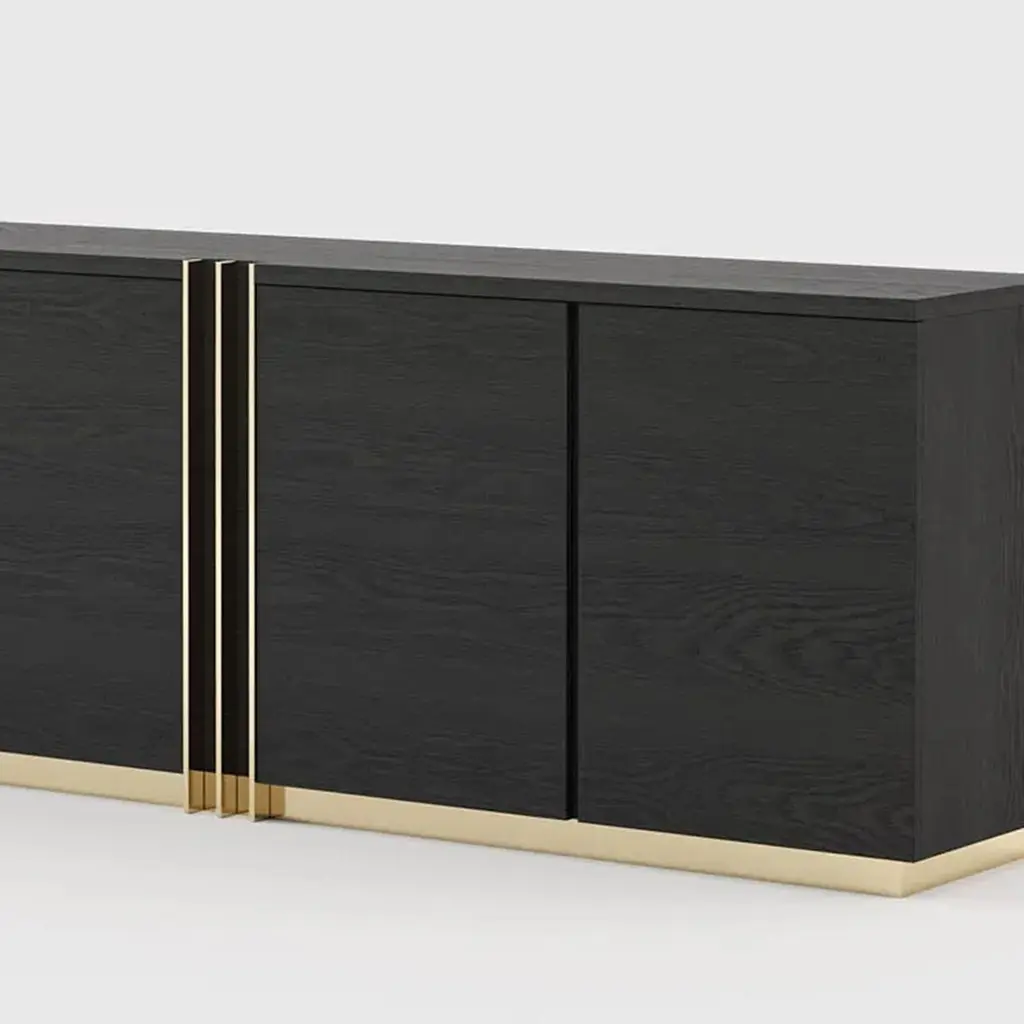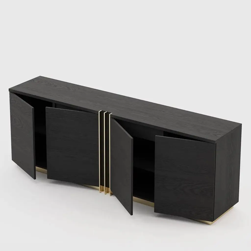 Sideboard Clark black ash with structure in ash woodin blackened matte finish. with polished stainless steeltrims in gold finish, sideboard with 4 doors with shelvesinside. Also available in other finishes on request.