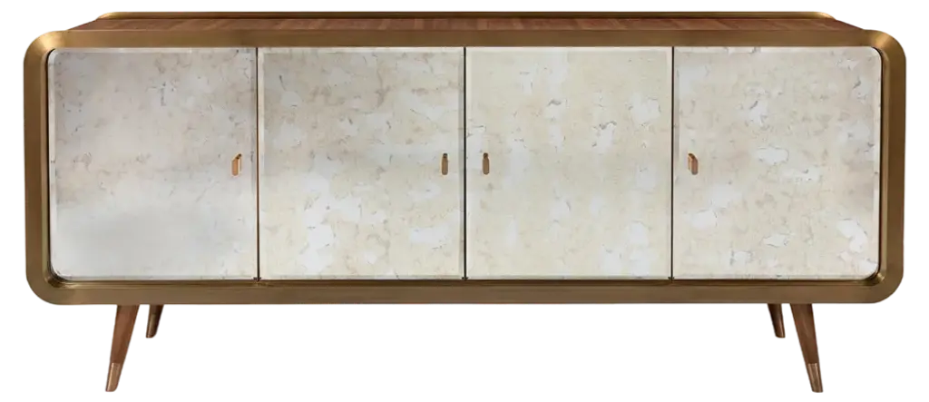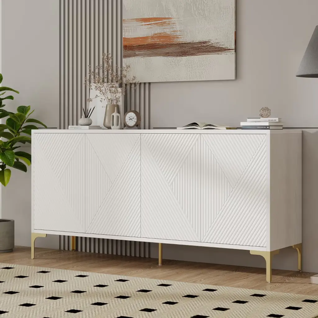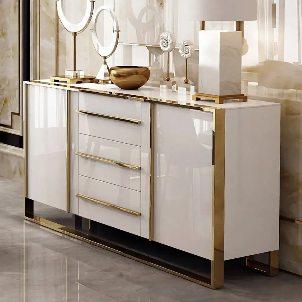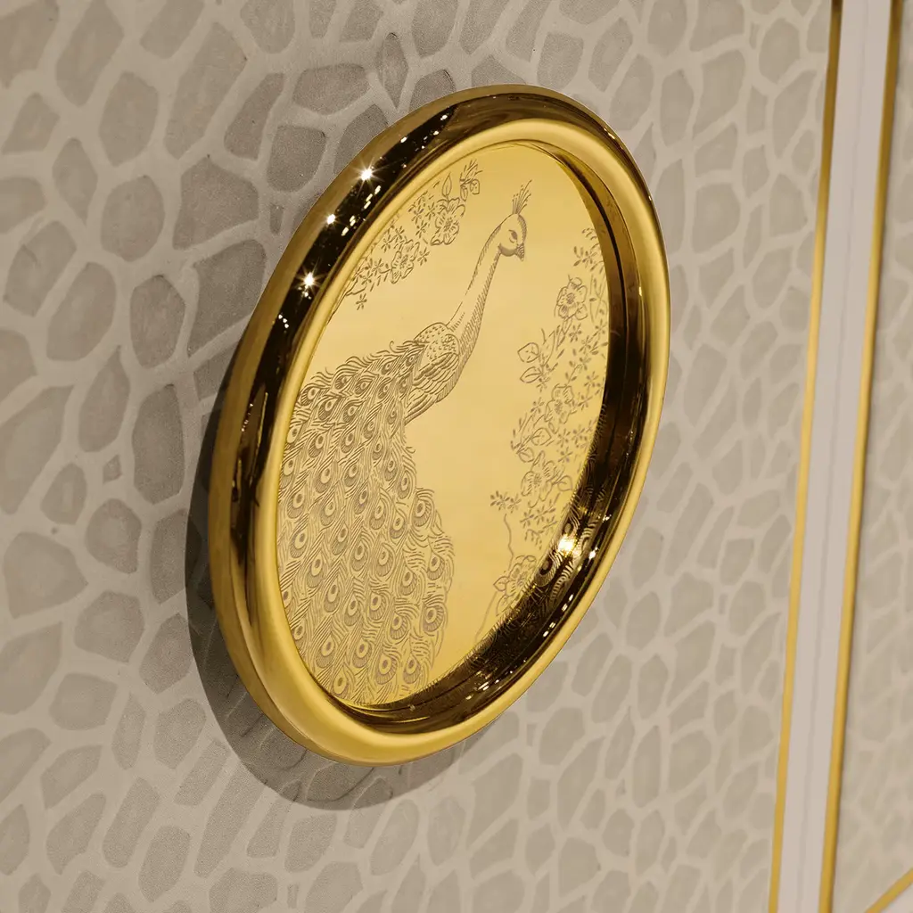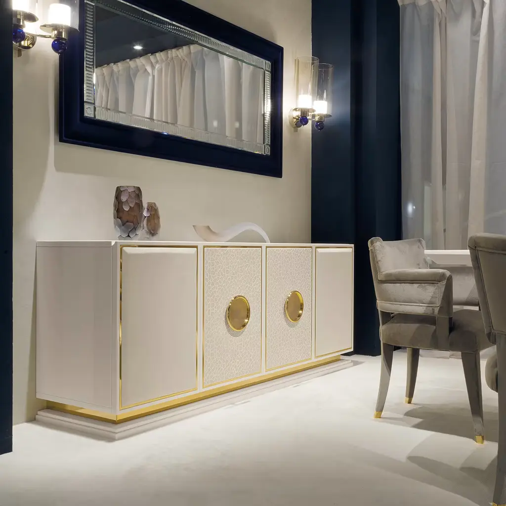 The minimalist shape of this sideboard is highlighted by gilded profiles and two medallions on the central doors embellished with an exquisite peacock design engraved completely by hand. Adding glamour and charm to a modern home, this sideboard's ivory-lacquered wooden frame rests on a plinth base and the door panels are covered with white nubuck leather, the two in the center display an exclusive print.