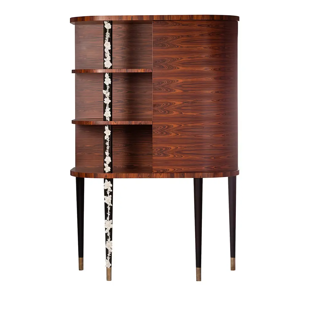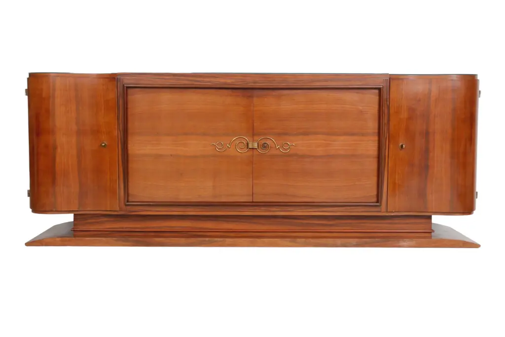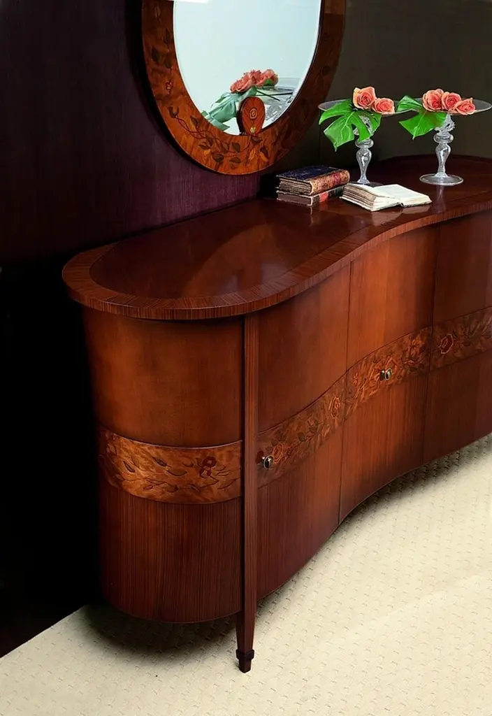 The truly distinctive feature is the curved godet-types sides. The structure is made of slabs of solid wood with Zebrano and Walnut veneer, with central band of briarwood embellished with brightly colored inlay work in various types of wood. With secret compartment.