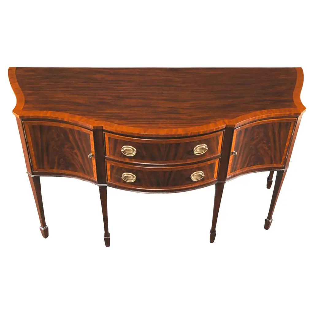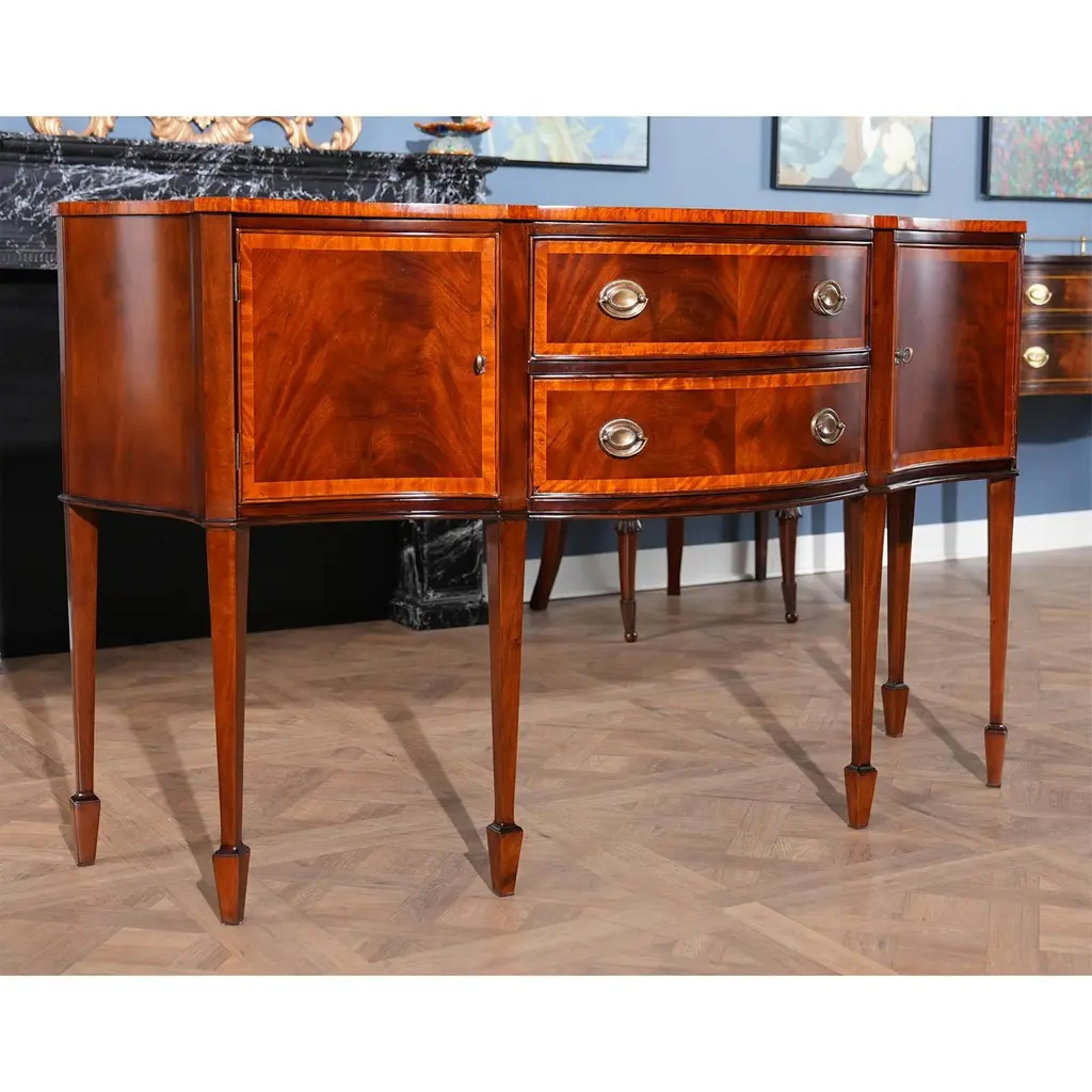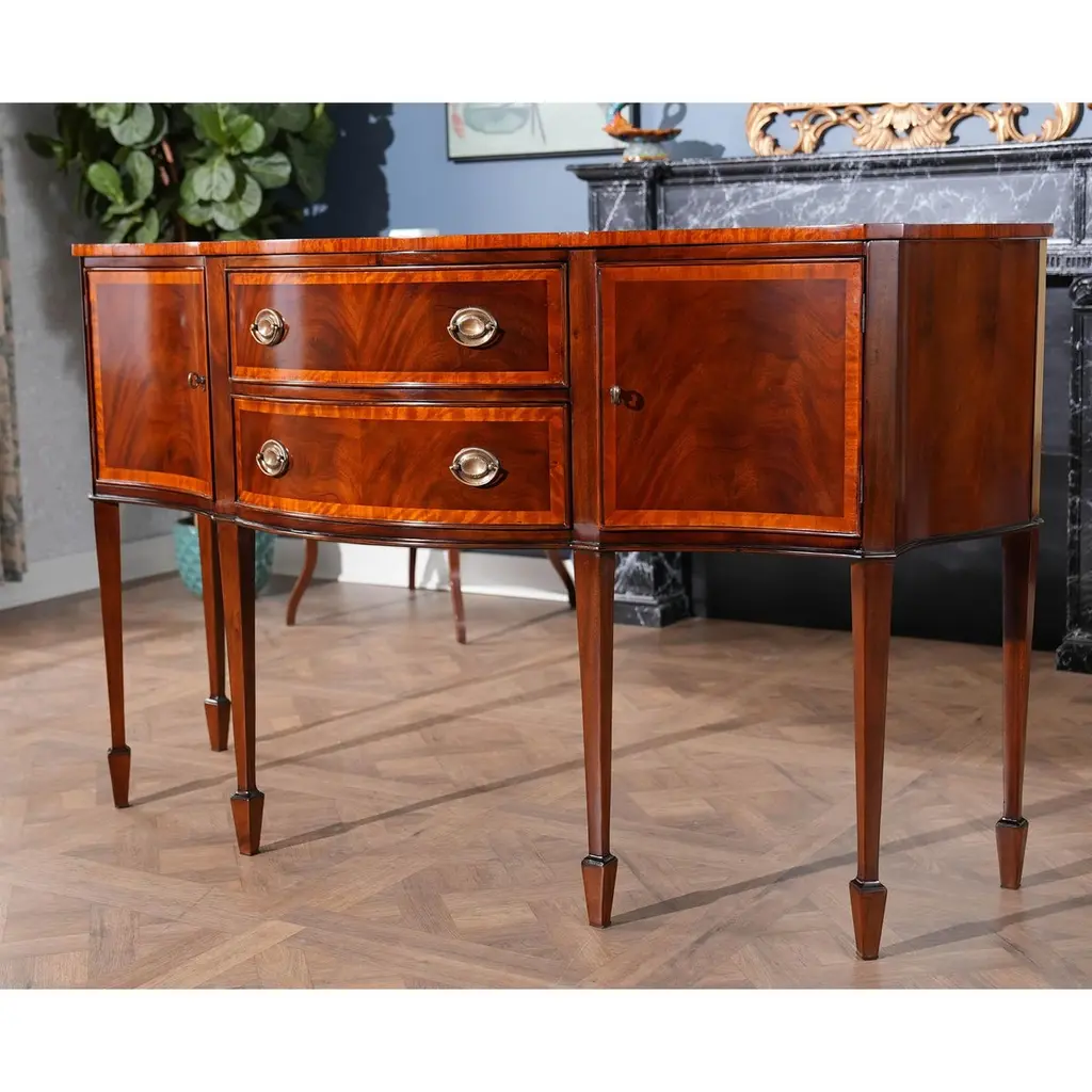 Our best selling buffet this Classic Sideboard has it all with sophisticated design and practical storage. The serpentine shaped front is an antique style design feature and this shape is highlighted on the top of the sideboard with satinwood banding. Continuing down the front of the Classic Sideboard the two high quality dovetailed drawers are bowed forward and the two doors are curved inward to continue the flowing and fluid appearance, all being banded in satinwood as well. The whole buffet resting on square double tapering legs ending in a traditional spade foot design. High quality construction throughout the piece carries forward to the drawer hardware which is manufactured using solid brass and shaped in a traditional oval design.Measures 67?w x 24?d x 40?h metric: 170 x 61 x 102.