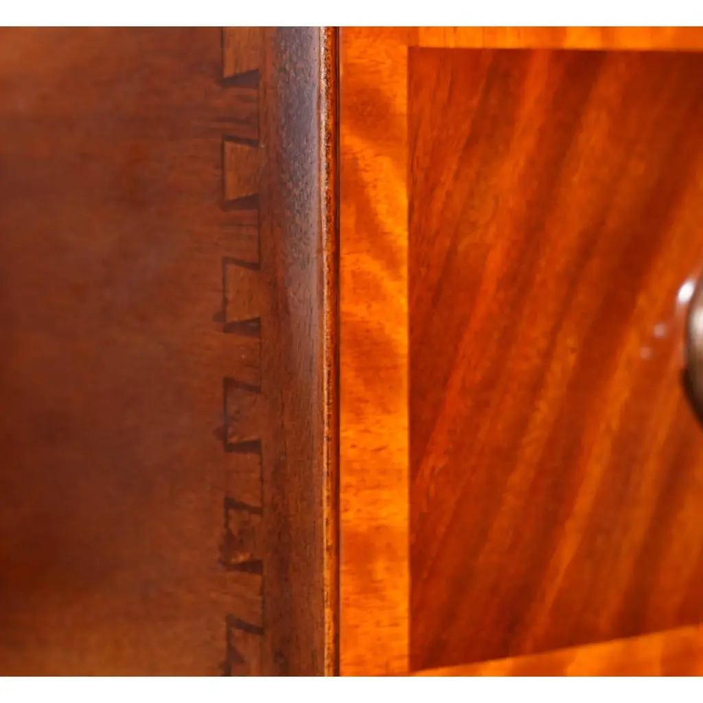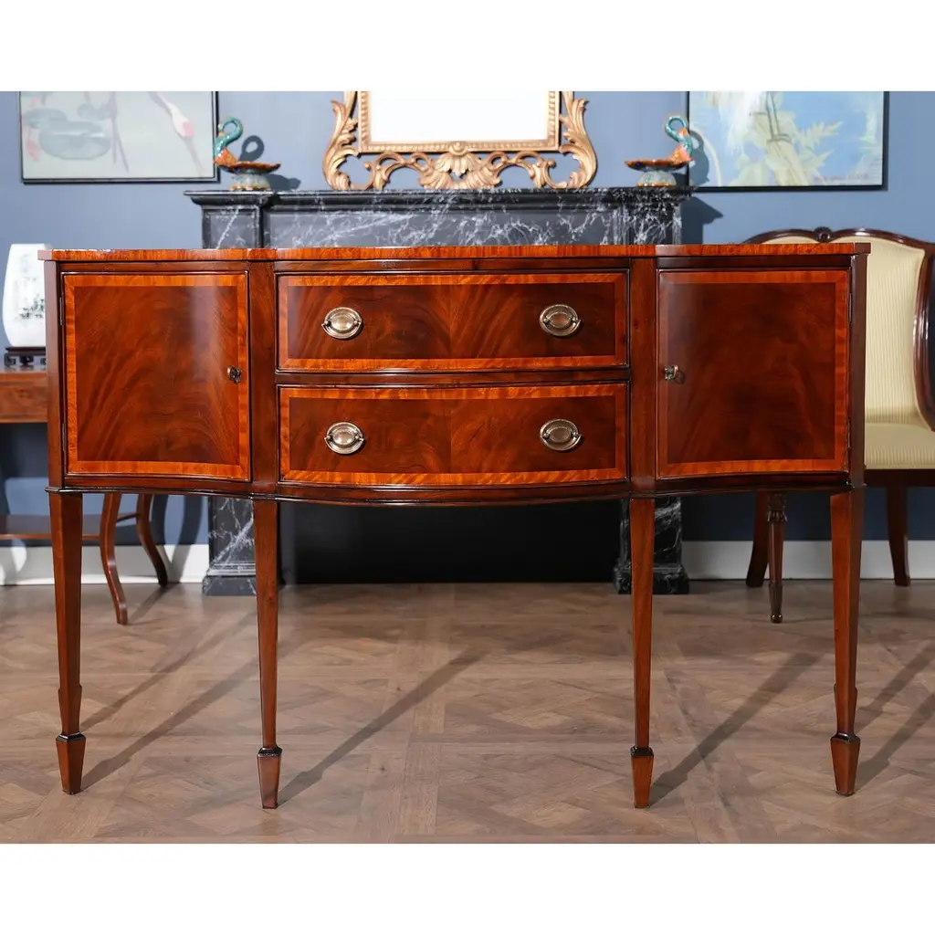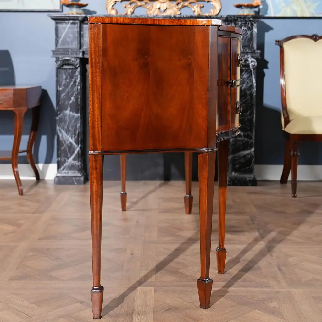 Our best selling buffet this Classic Sideboard has it all with sophisticated design and practical storage. The serpentine shaped front is an antique style design feature and this shape is highlighted on the top of the sideboard with satinwood banding. Continuing down the front of the Classic Sideboard the two high quality dovetailed drawers are bowed forward and the two doors are curved inward to continue the flowing and fluid appearance, all being banded in satinwood as well. The whole buffet resting on square double tapering legs ending in a traditional spade foot design. High quality construction throughout the piece carries forward to the drawer hardware which is manufactured using solid brass and shaped in a traditional oval design.Measures 67?w x 24?d x 40?h metric: 170 x 61 x 102.