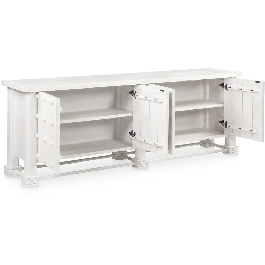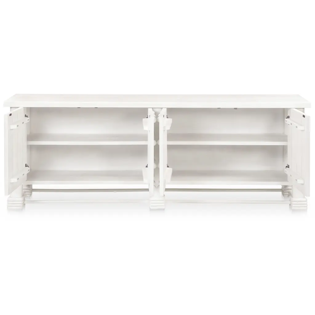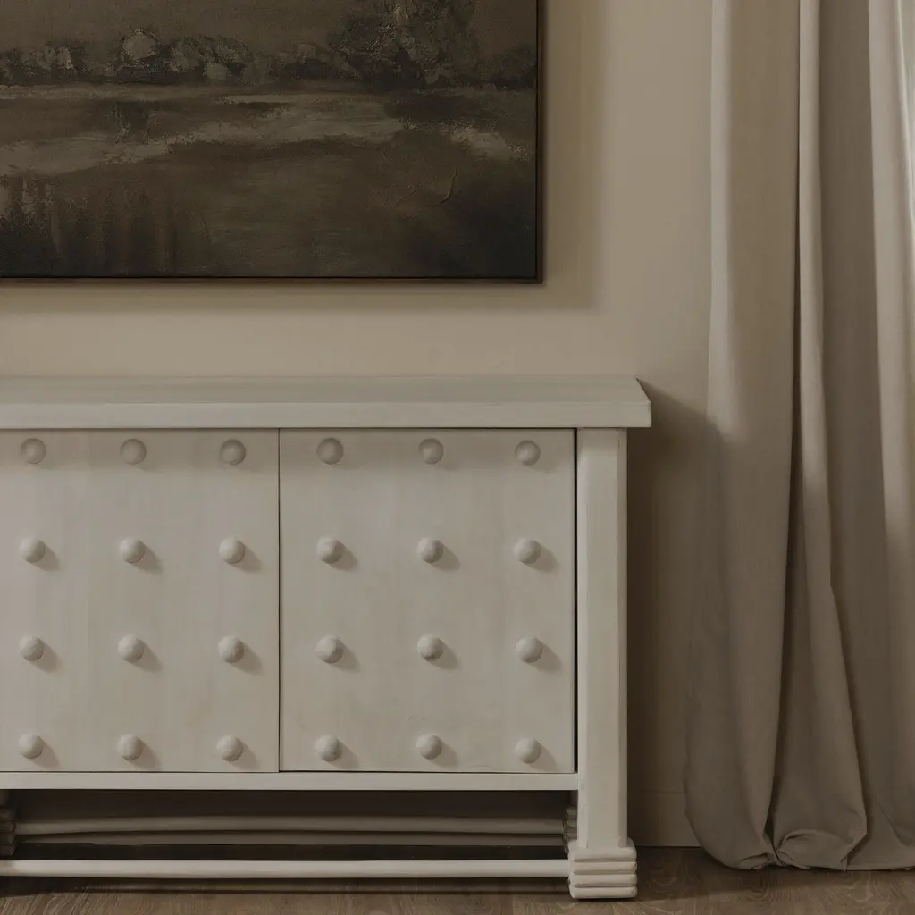 French-inspired elements and circular motifs enrich the Clement sideboard's oversized, chunky design. Crafted from mango wood with a whitewash finish, this ornate piece features carved detail feet with stretcher bars and ample internal storage.