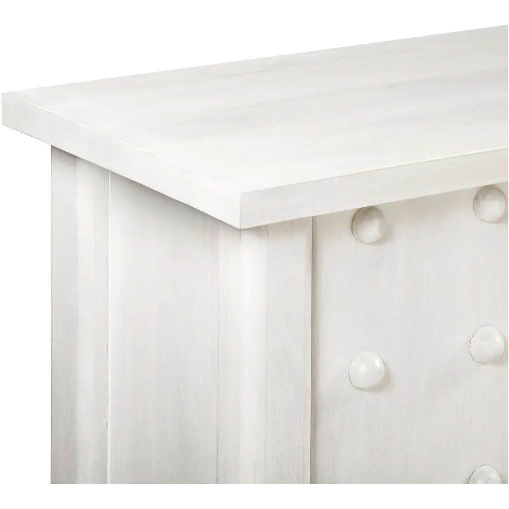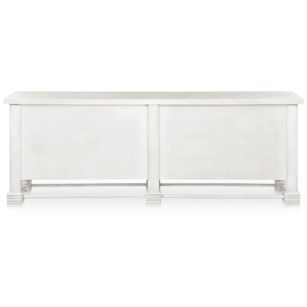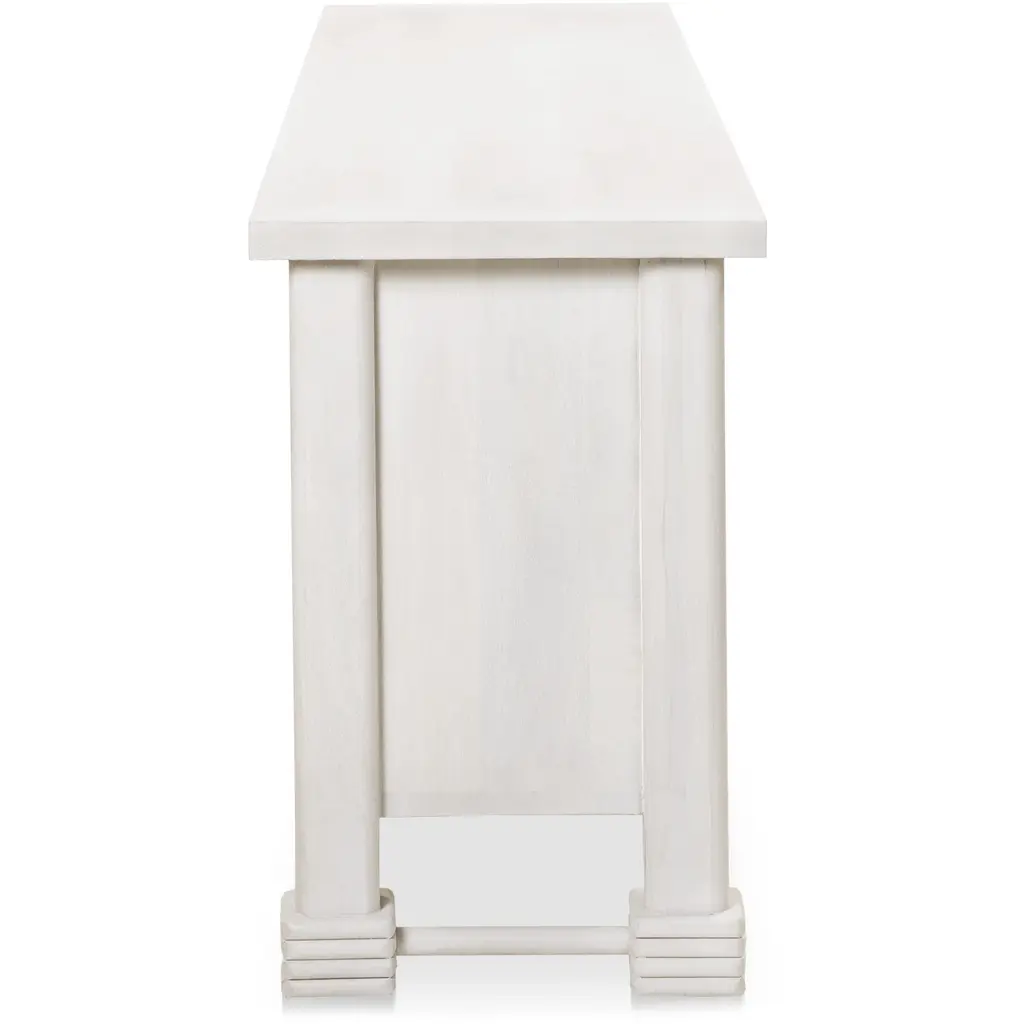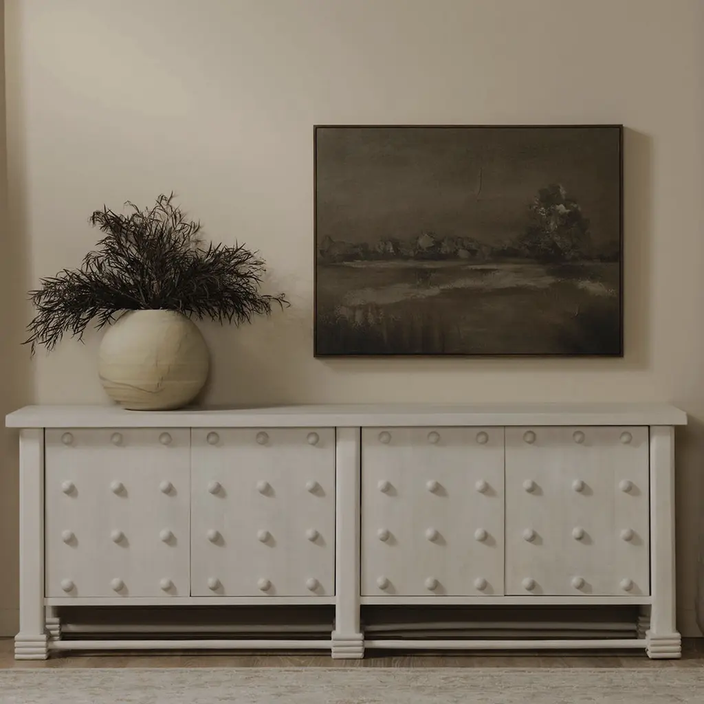 French-inspired elements and circular motifs enrich the Clement sideboard's oversized, chunky design. Crafted from mango wood with a whitewash finish, this ornate piece features carved detail feet with stretcher bars and ample internal storage.