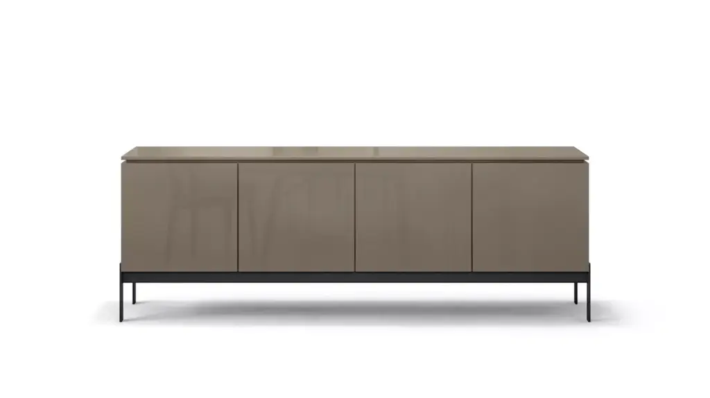 Sideboard in Daquacryl (3mm-thick high gloss PMMA veneer on CARB 2 MDF, many colours available). 4 interior shelves in 8mm-thick clear tempered glass. Base in steel with manganese lacquer finish. Also available in other dimensions. Manufactured in Europe.