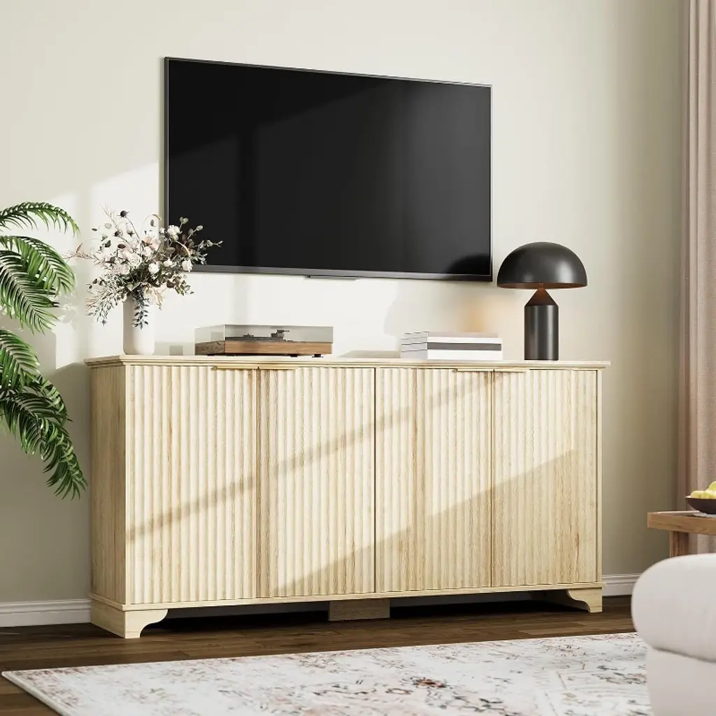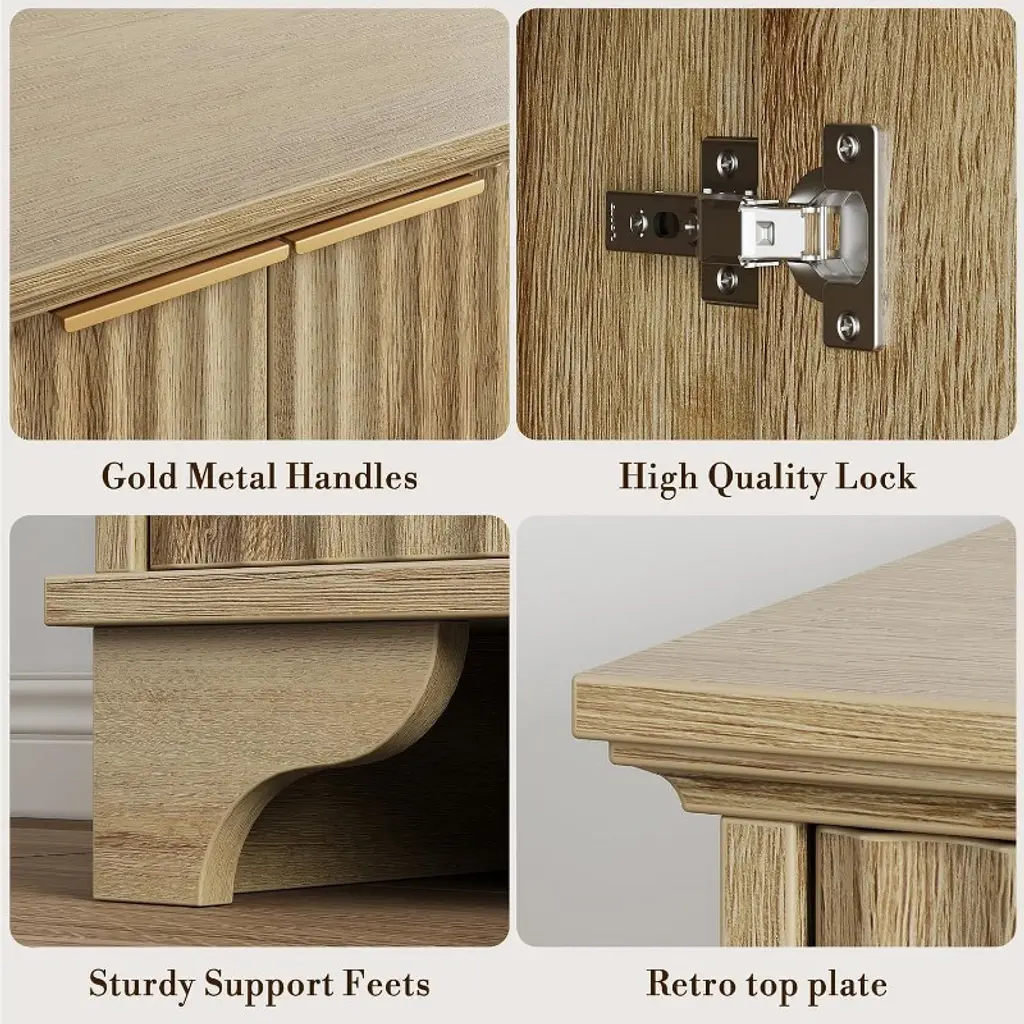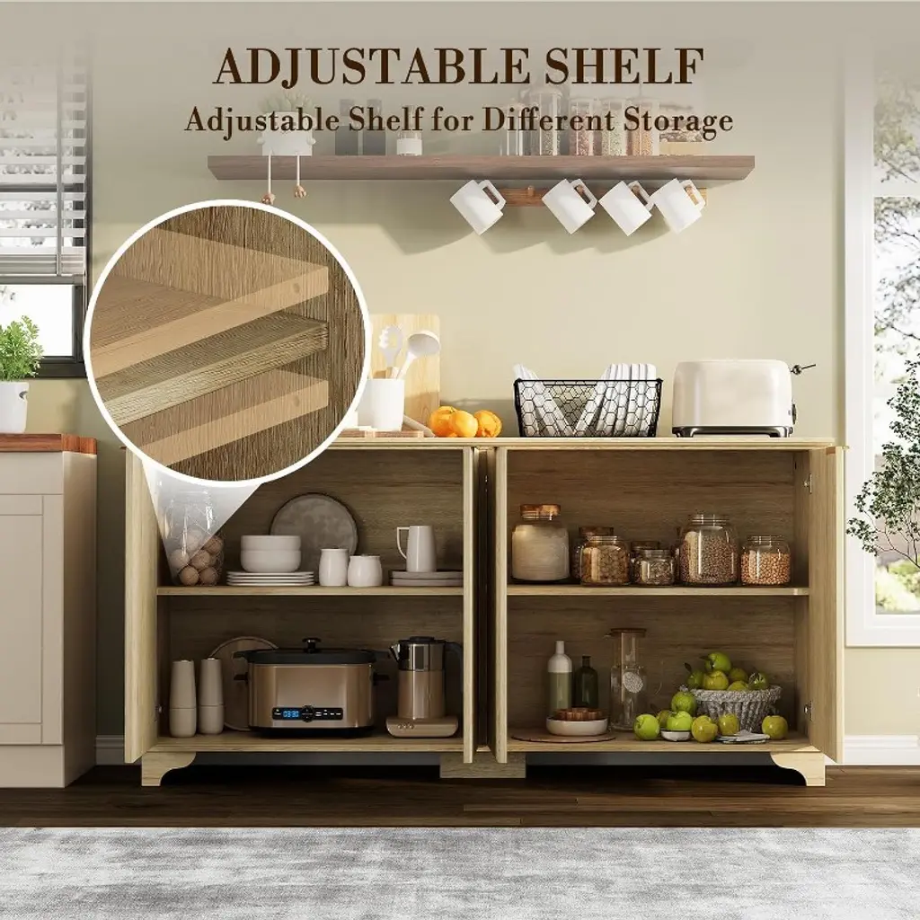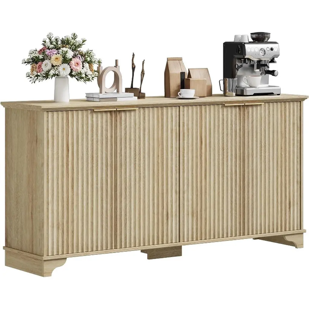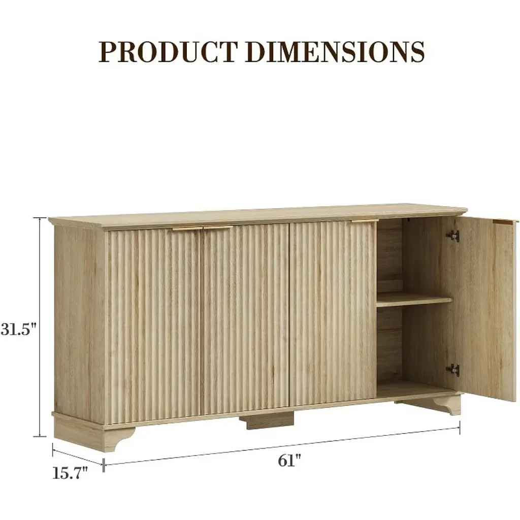 Add a touch of modern farmhouse elegance to your space with this 61"W coffee bar cabinet, available in Natural, White, or Dark Oak finishes. Designed with four fluted doors and gold-tone handles, this sideboard buffet cabinet blends sophisticated style with everyday functionality. It measures 61" W x 15.7" D x 31.5" H and offers a compact yet spacious storage solution for your kitchen, dining room, or living area. The interior includes adjustable shelves, making it easy to organize dishes, pantry items, barware, or home décor. Crafted from thick engineered wood, the cabinet is built for durability and everyday use while maintaining a clean, refined look. Its floor-mounted design and streamlined silhouette complement a wide range of interiors, from classic to contemporary.