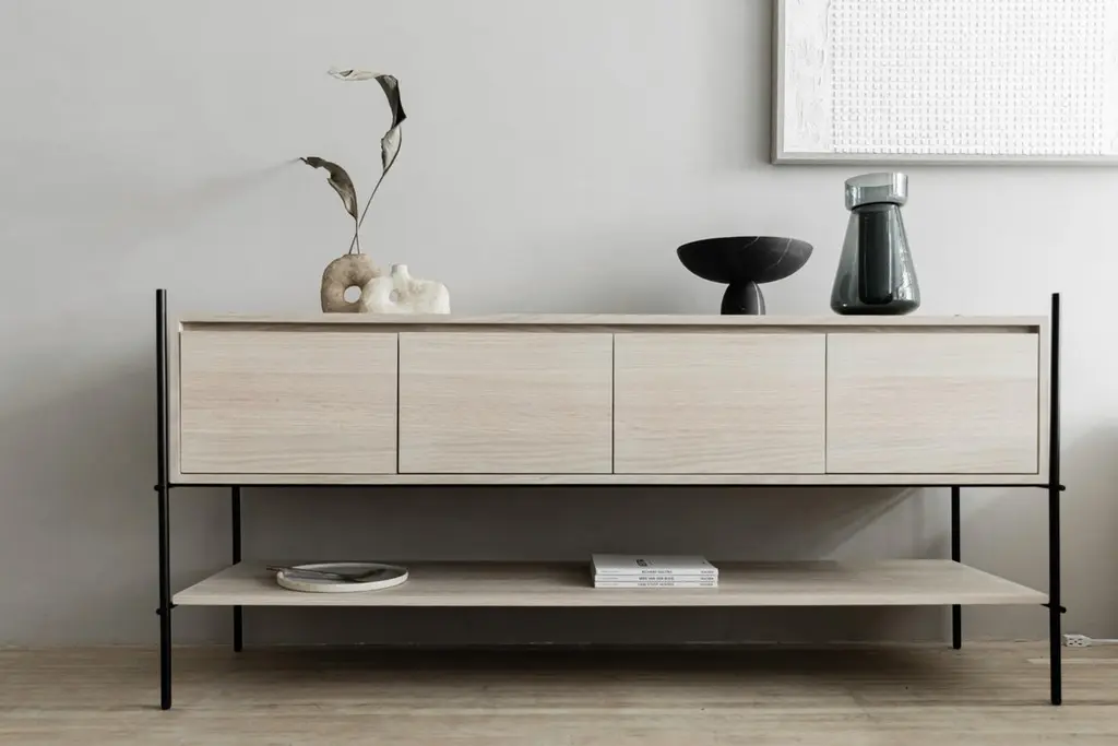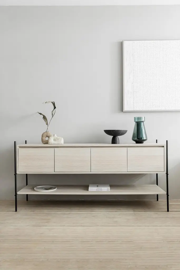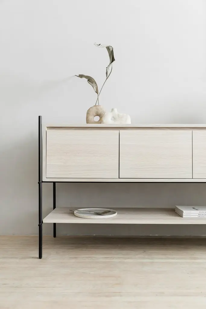 The Credenza Colima follows the concepts of functionalism with its two shelf surfaces and storage area. The electrostatically painted steel structure shows its pure essence, and the wood veneer brings warmth to the piece. Production time: 6-8 weeks for items without marble / 13-14 weeks for marble pieces. Shipping +10 additional business days. Casa Quieta uses natural materials such as woods, stones, fabrics etc. These materials may vary in tone, veining, and cavities due to their natural origin. This is part of the inherent beauty of materials and is not considered a flaw. Due to the artisan nature of our production process, there is a +/- 3mm measurement tolerance.