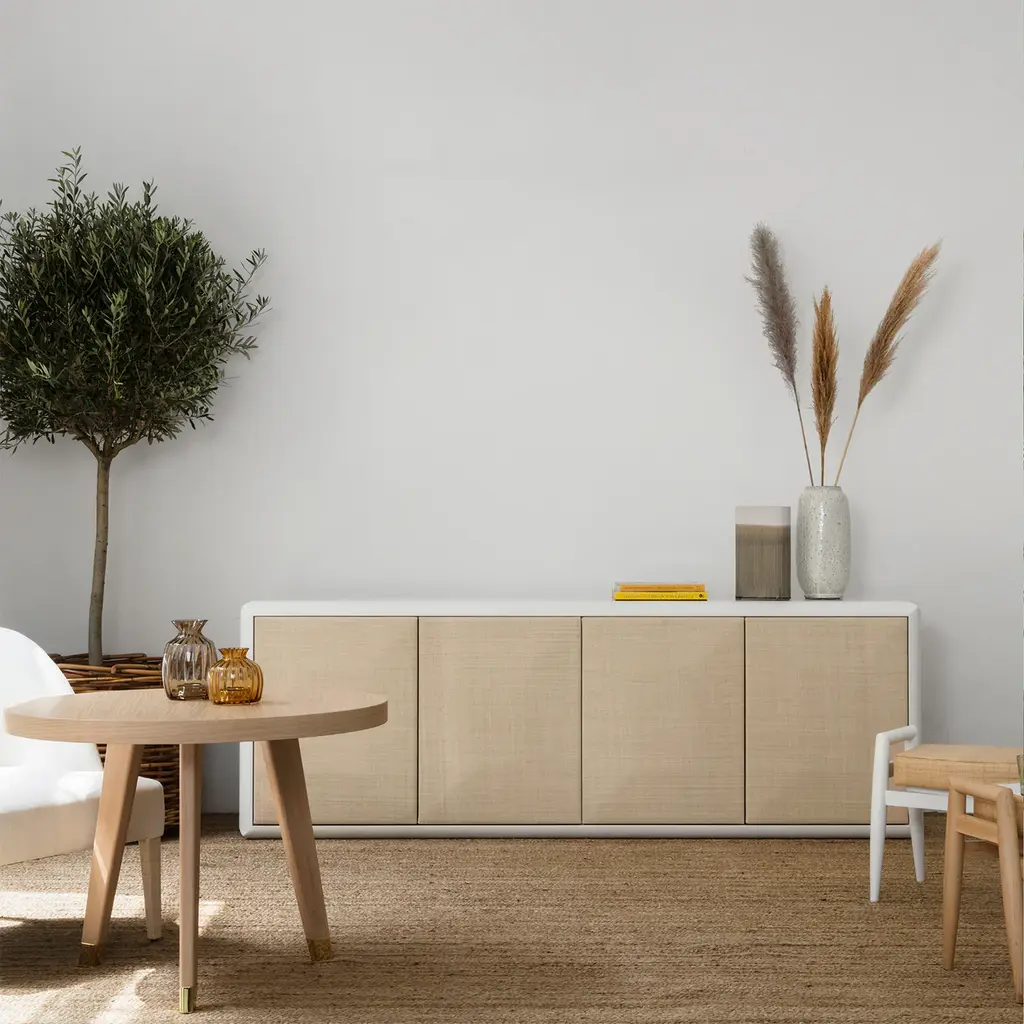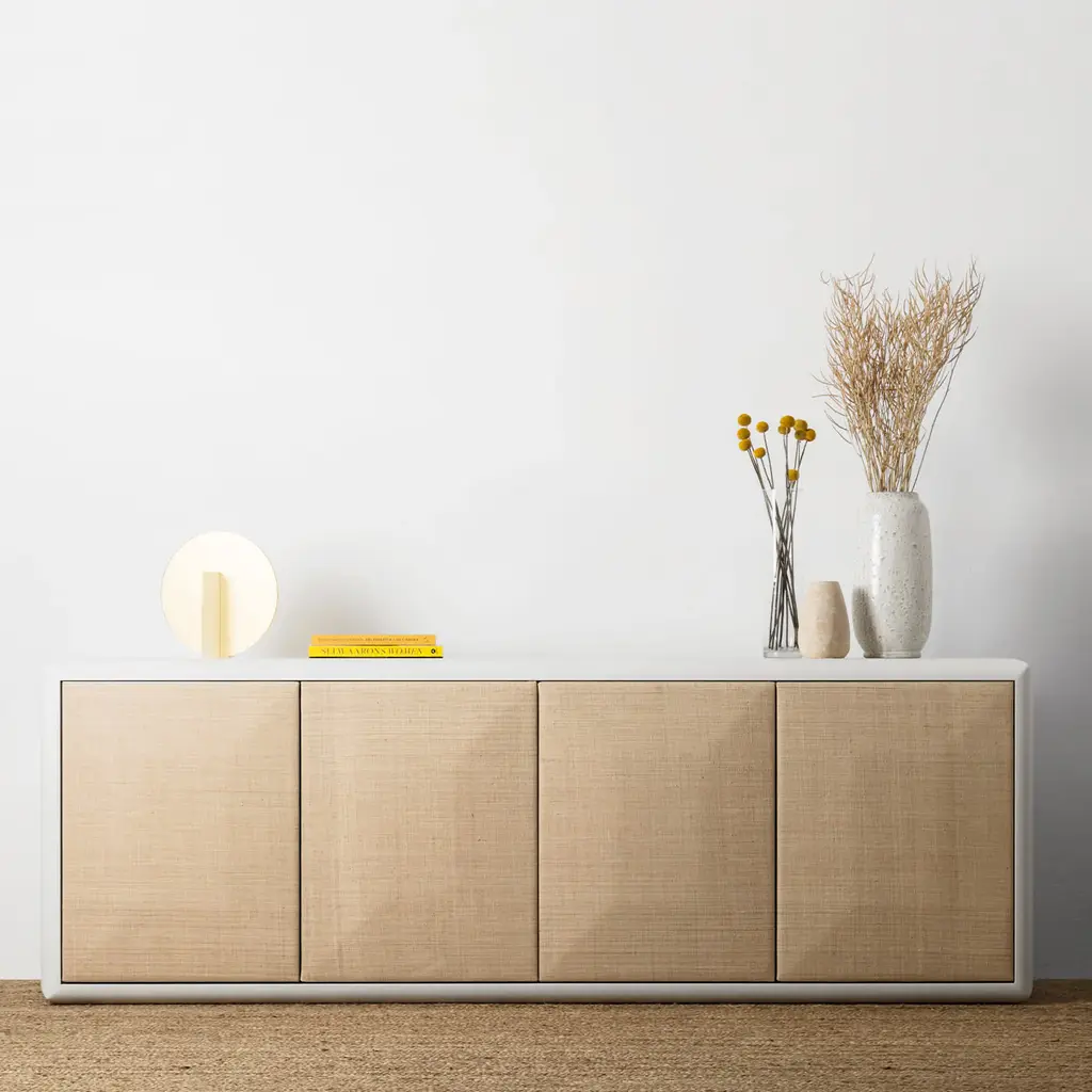 Clean refinement and essential minimalism define this gorgeous sideboard, boasting a simple and compact shape comprised of four doors. Crafted of white lacquered wood, it will make a versatile and timeless addition to modern decor. Please inquire with the Concierge for further details on materials and finishes.