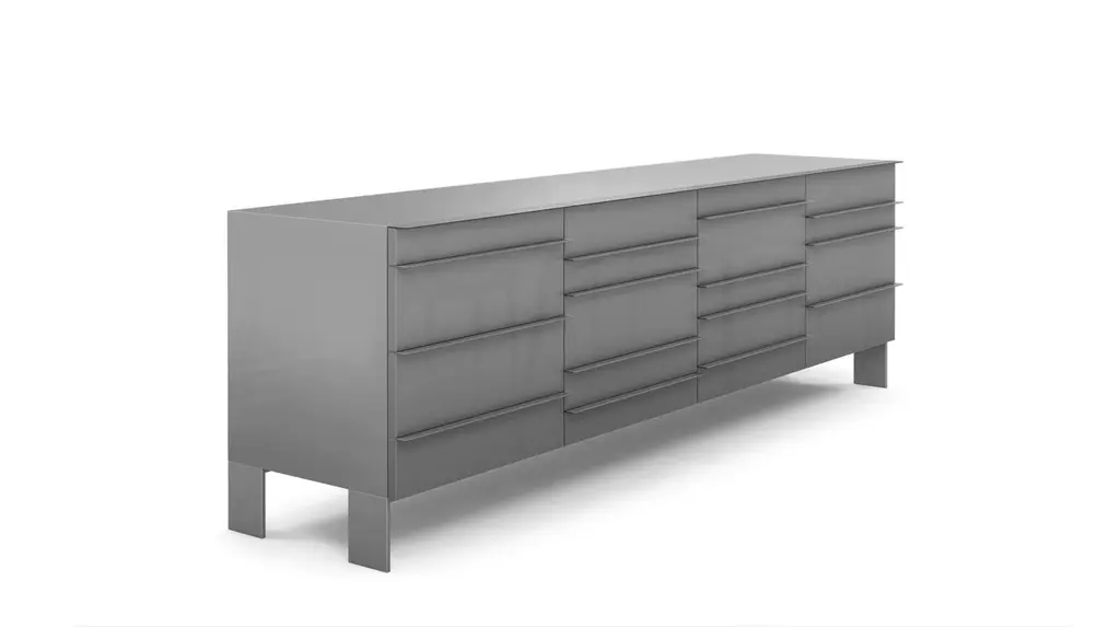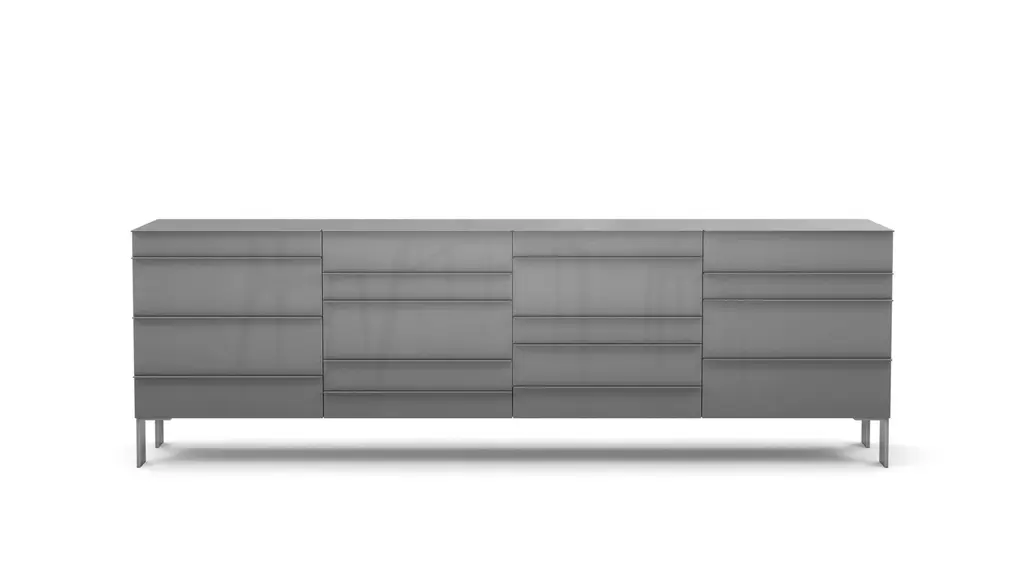 The Colors collection was designed by Fabrice Berrux and evokes the idea of swatches of wood or paint. The pieces feature rhythmic colour variations that are separated by protruding handles to give depth to the facades. They can also be adapted to personal preferences: one can freely pick four colours of glossy Daquacryl lacquer (a various choice.) or ceramic panels with a stone or marble finish. The drawers and doors are hidden in the design of this piece, only revealing themselves once opened.