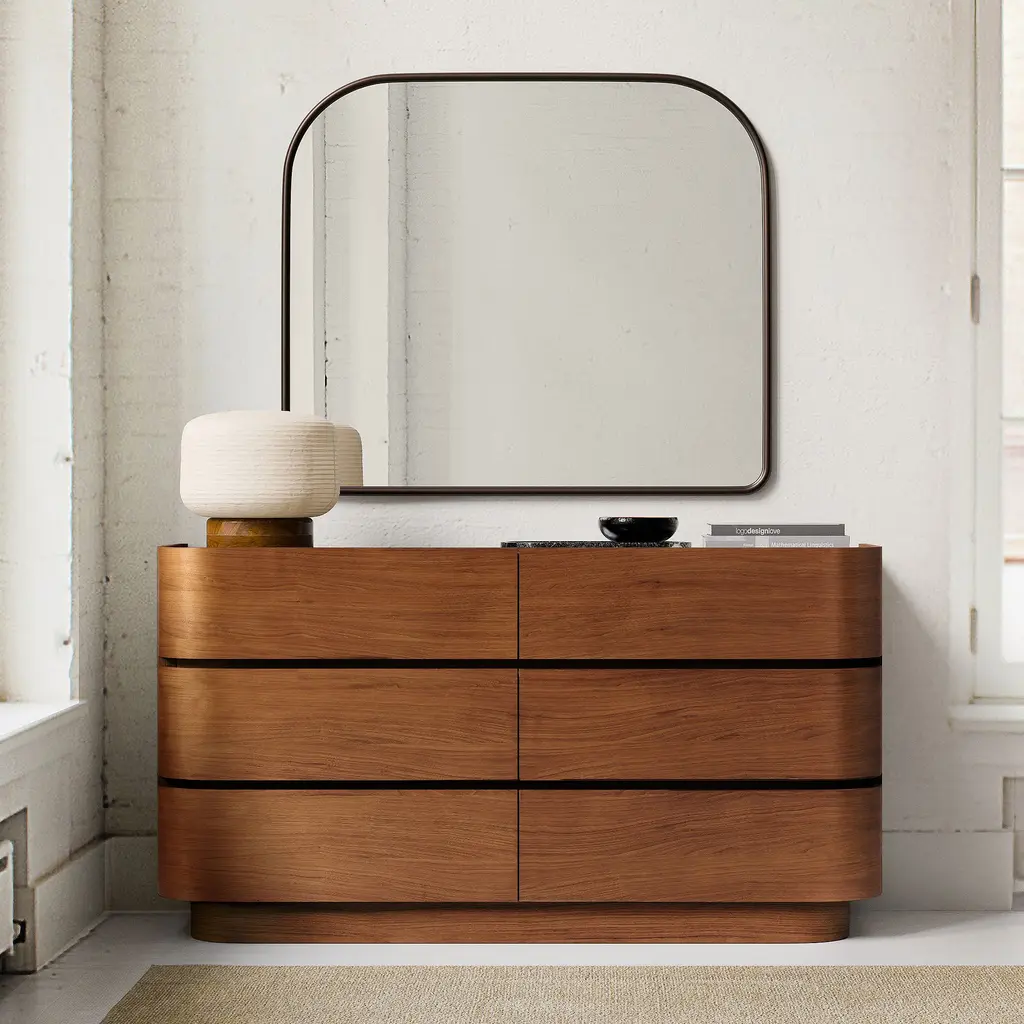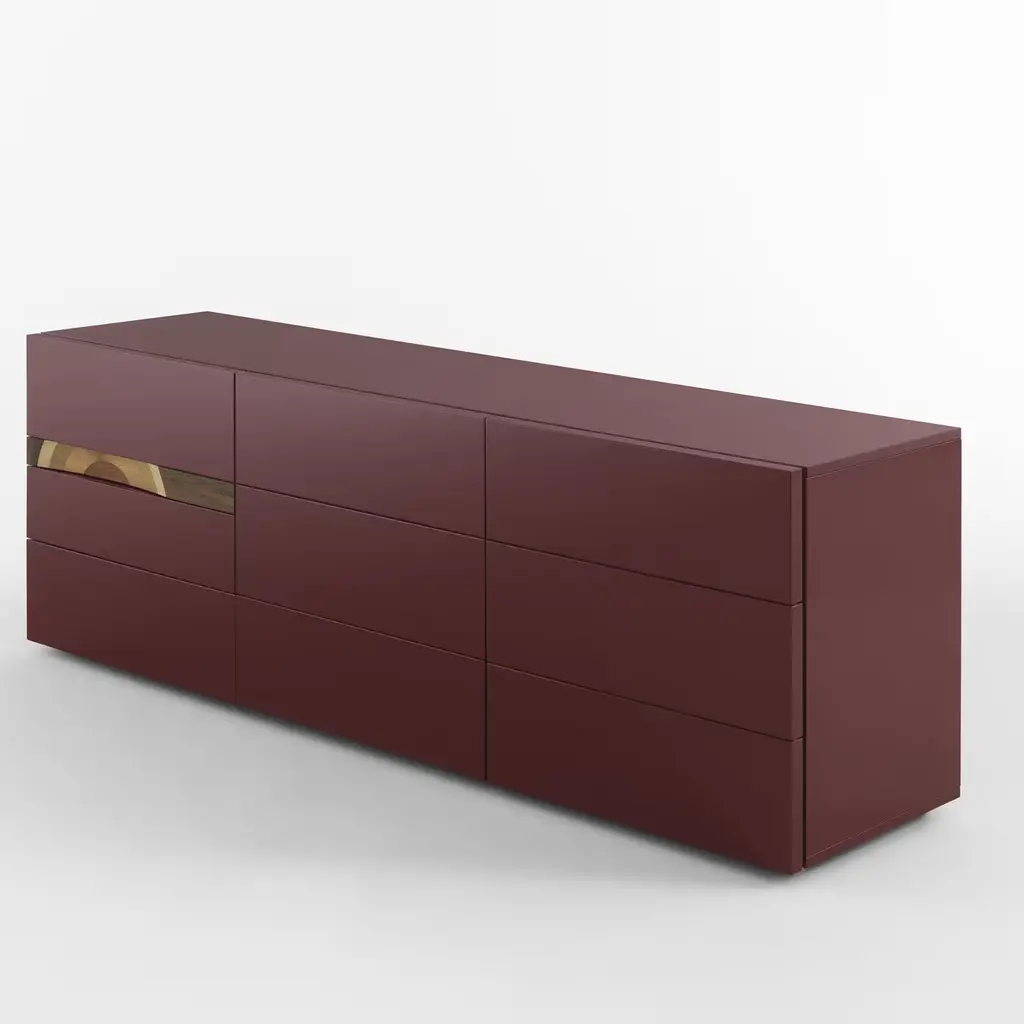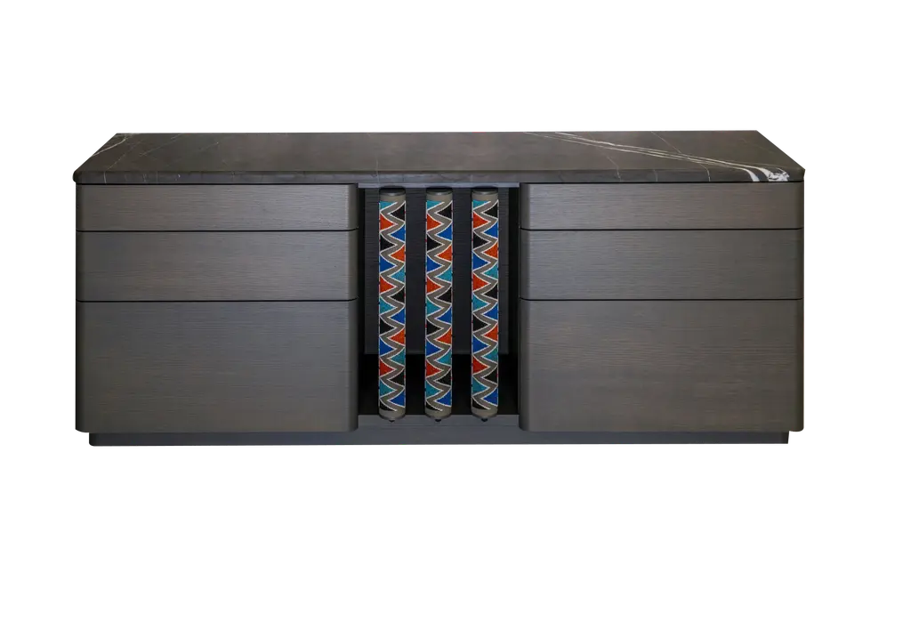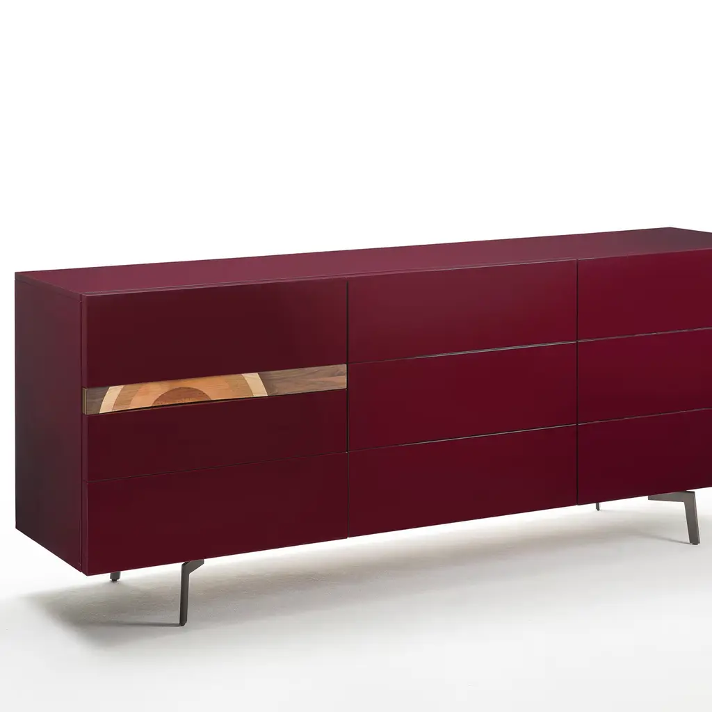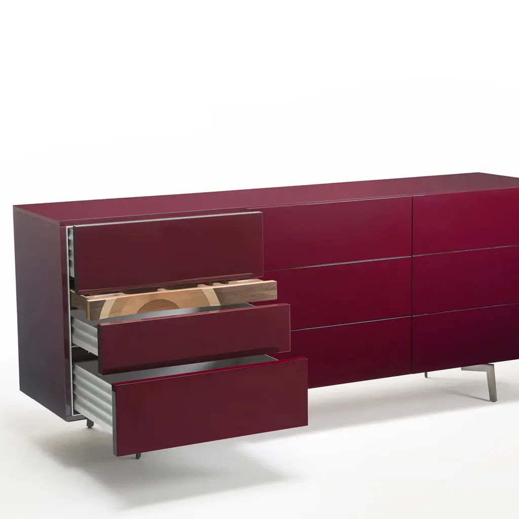 This simple and elegant sideboard by Toyo Ito is enriched with a striking jewelry drawer made of five types of wood (mahogany, oak, cherry, walnut, and ash), that echoes the look of the Ripples Bench. The frame, doors and other six drawers are made of red-lacquered MDF. Complete with internal shelves of transparent tempered glass, self-locking slide runners and anodized aluminum sides, this piece is raised on minimal ABS feet (2 cm height) that can be replaced by a metal base of 16 or 32 cm height on request.