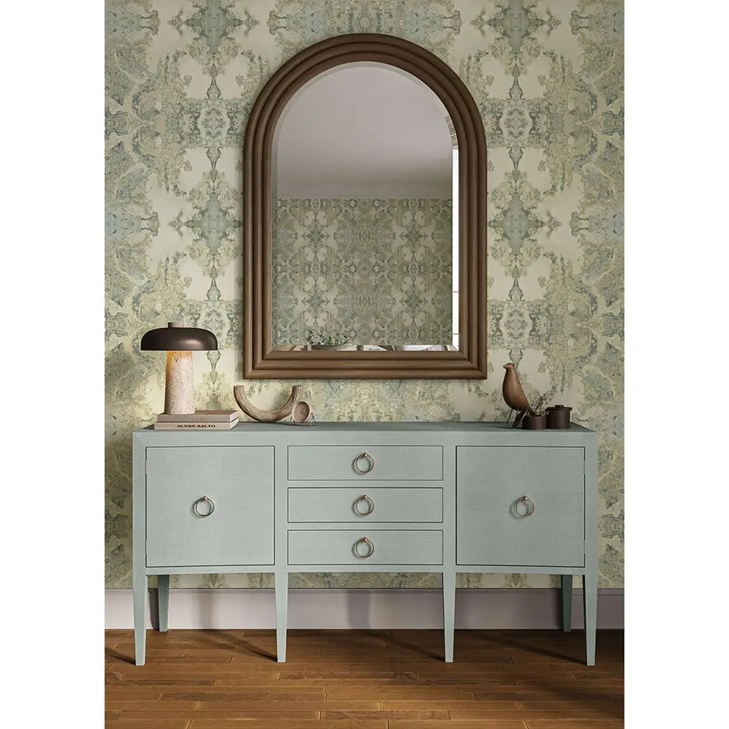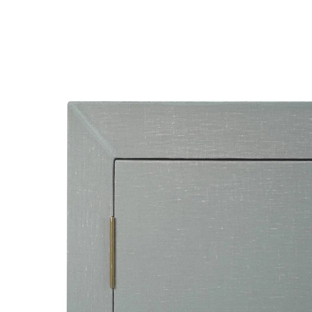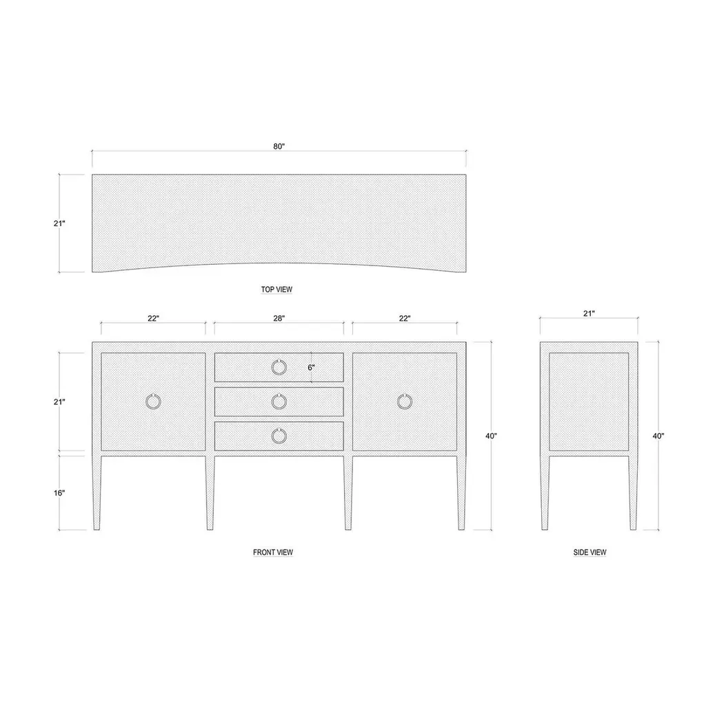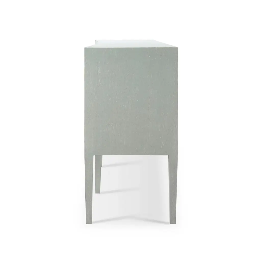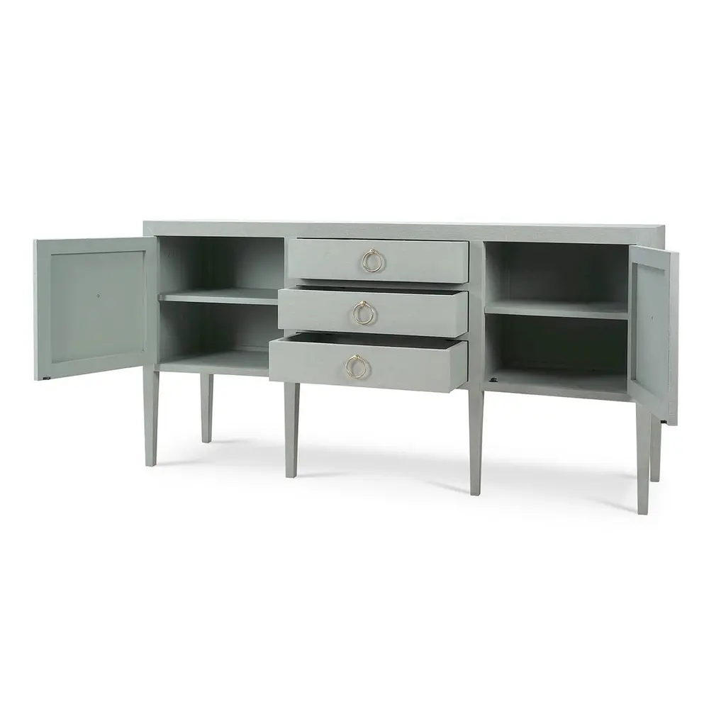 Measuring 80" x 21" x 40", this sophisticated sideboard combines classic design elements with modern chic style for practical functionality, making it a standout addition to any room.Crafted with premium mahogany, the sideboard is wrapped in pale blue linen, adding a touch of softness and elegance. The unique concave design brings a stylish flair, while two spacious cabinets and three central drawers offer ample storage. Chic ring handles adorn the drawers and cupboard doors, adding a touch of glamour.Ideal for your living room, dining area, or hallway, this versatile piece not only enhances your home decor but also provides practical storage solutions. Brand new and ready to elevate your space, this sideboard is the perfect blend of style and functionality.Dimensions: 80" W x 21" D x 40" HCustom finish options are also available. Contact us to learn more.