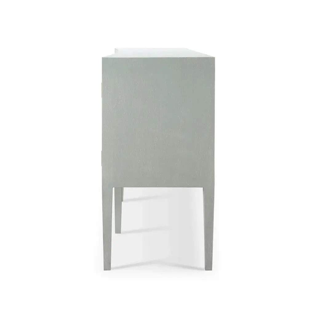 Measuring 80" x 21" x 40", this sophisticated sideboard combines classic design elements with modern chic style for practical functionality, making it a standout addition to any room. Crafted with premium mahogany, the sideboard is wrapped in pale blue linen, adding a touch of softness and elegance. The unique concave design brings a stylish flair, while two spacious cabinets and three central drawers offer ample storage. Chic ring handles adorn the drawers and cupboard doors, adding a touch of glamour. Ideal for your living room, dining area, or hallway, this versatile piece not only enhances your home decor but also provides practical storage solutions. Brand new and ready to elevate your space, this sideboard is the perfect blend of style and functionality. Dimensions: 80" W x 21" D x 40" H