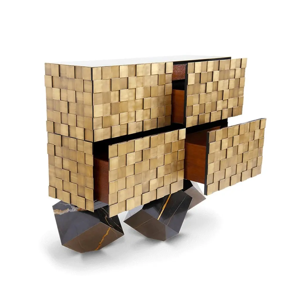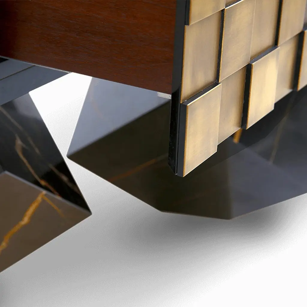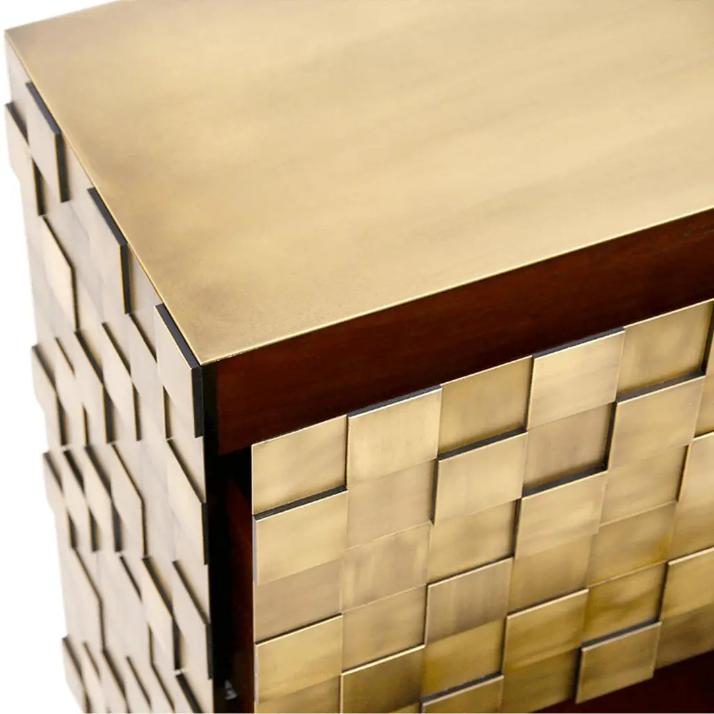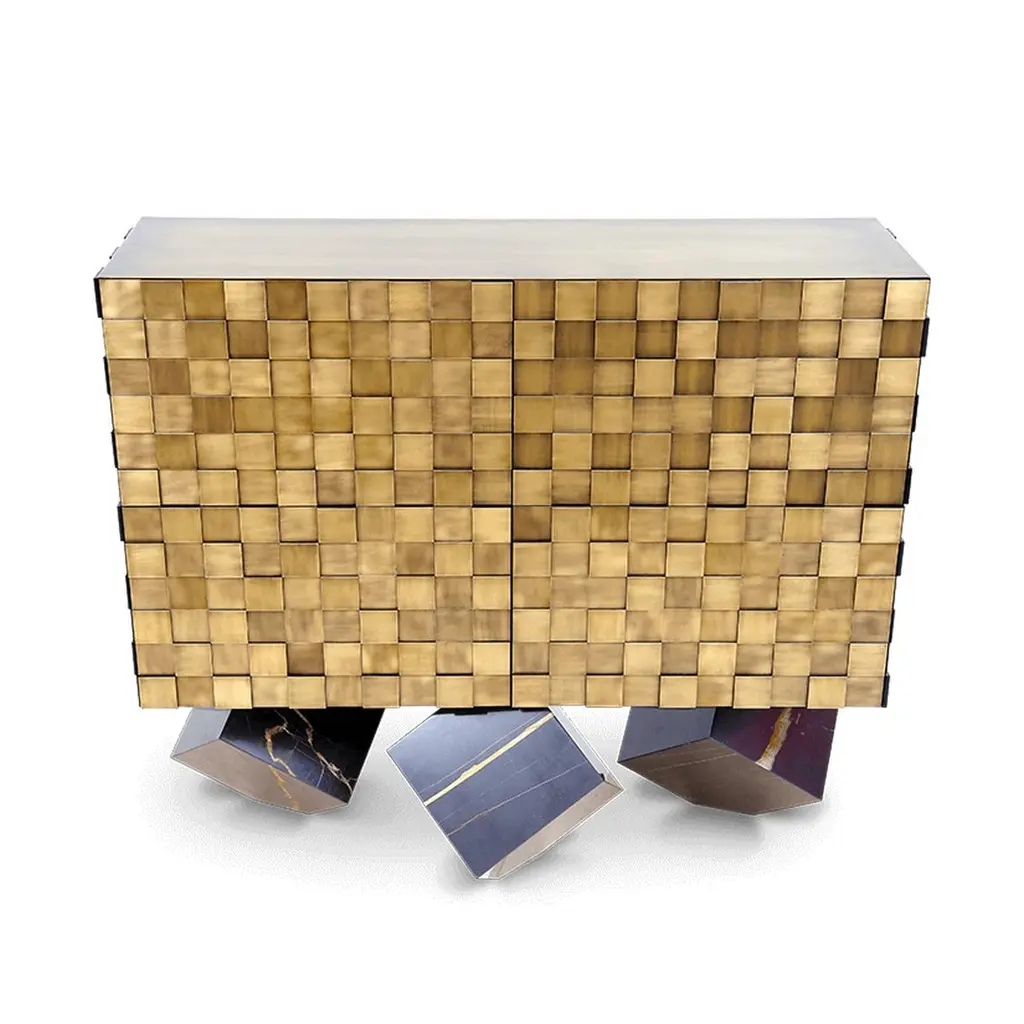 Our newest sideboard Hermes designed specially for Paris Design Week. Superbly executed by our master craftsmen, this fabulous piece of furniture is outstanding in its use of luxury materials and attention to detail.The Exclusive Designer Sideboard is striking, a true statement of bold and elegant design. Hundreds of small brass squares forming an irregular relief of its body, this sideboard with a structure in natural wood is raised on 3 marble legs. It features 4 spacious drawers with leather bottom and 2 internal drawers with brass dividers. This sublime piece can be used to divide a room, as the sideboard has a decorative leather back. Combining high design with brilliant craftsmanship, this timeless furniture creation gives character and elegance to the room.Customization available - Different colors, materials, finishes and customized sizes available upon request. If you’re interested in a customization that is not currently listed, please contact Kanttari.Bespoke – We do create individual and fully customized designs. Please contact Kanttari to discuss your specifications.Manufacturing – we fully hand-craft each piece in our workshop by our best craftsmen. Production lead time may take up to 9 - 12 weeks, bespoke items may be longer – depending on the exact specification and availability of materials chosen.Shipping:Carefully packaged in wooden crate.Fully insured.