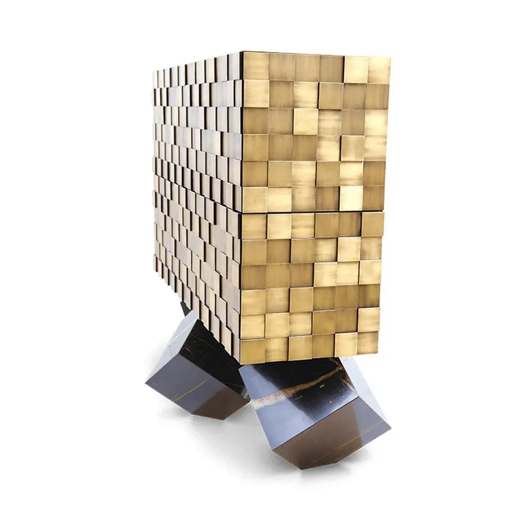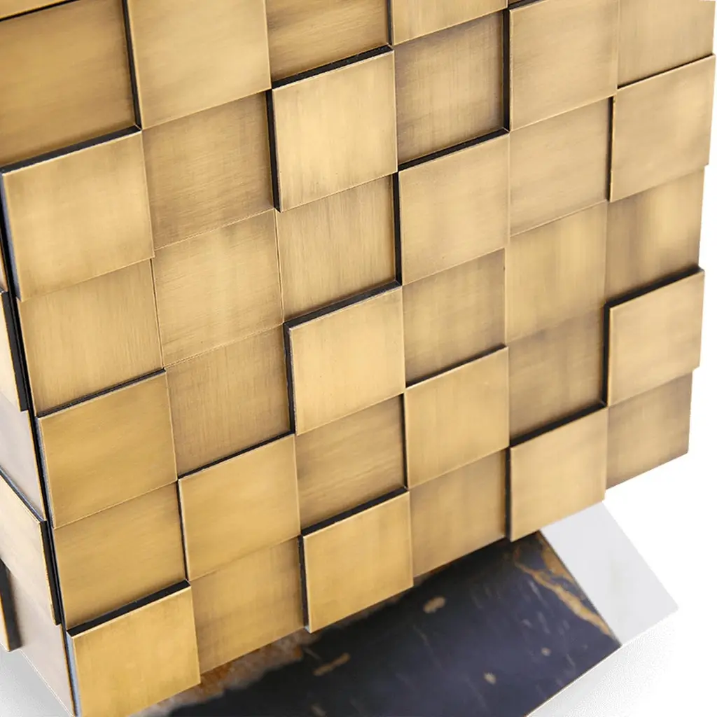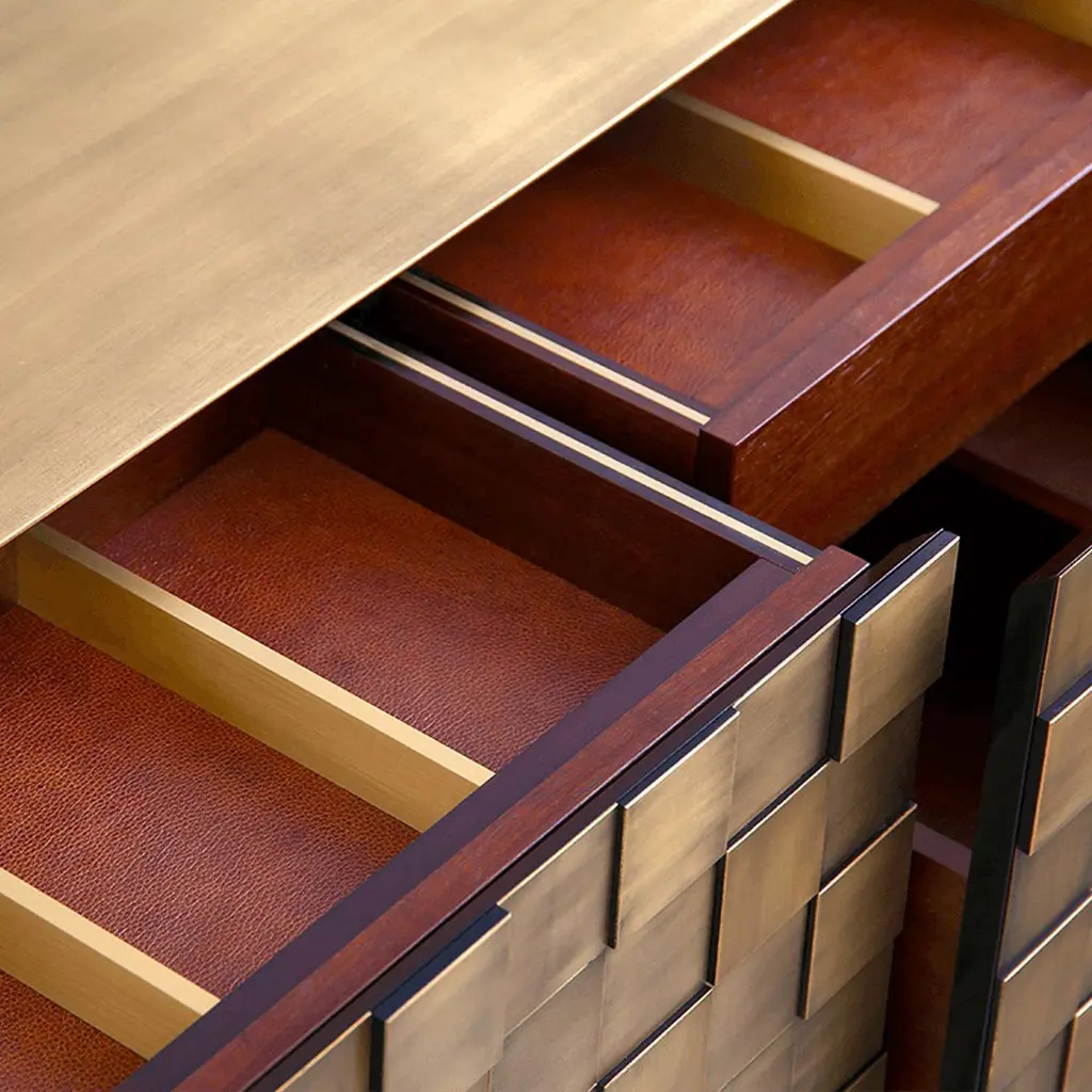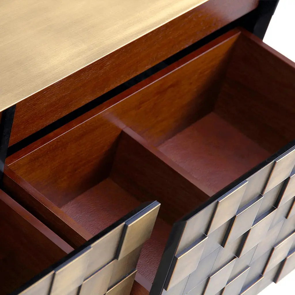 Our newest sideboard Hermes designed specially for Paris Design Week. Superbly executed by our master craftsmen, this fabulous piece of furniture is outstanding in its use of luxury materials and attention to detail.The Exclusive Designer Sideboard is striking, a true statement of bold and elegant design. Hundreds of small brass squares forming an irregular relief of its body, this sideboard with a structure in natural wood is raised on 3 marble legs. It features 4 spacious drawers with leather bottom and 2 internal drawers with brass dividers. This sublime piece can be used to divide a room, as the sideboard has a decorative leather back. Combining high design with brilliant craftsmanship, this timeless furniture creation gives character and elegance to the room.Customization available - Different colors, materials, finishes and customized sizes available upon request. If you’re interested in a customization that is not currently listed, please contact Kanttari.Bespoke – We do create individual and fully customized designs. Please contact Kanttari to discuss your specifications.Manufacturing – we fully hand-craft each piece in our workshop by our best craftsmen. Production lead time may take up to 9 - 12 weeks, bespoke items may be longer – depending on the exact specification and availability of materials chosen.Shipping:Carefully packaged in wooden crate.Fully insured.