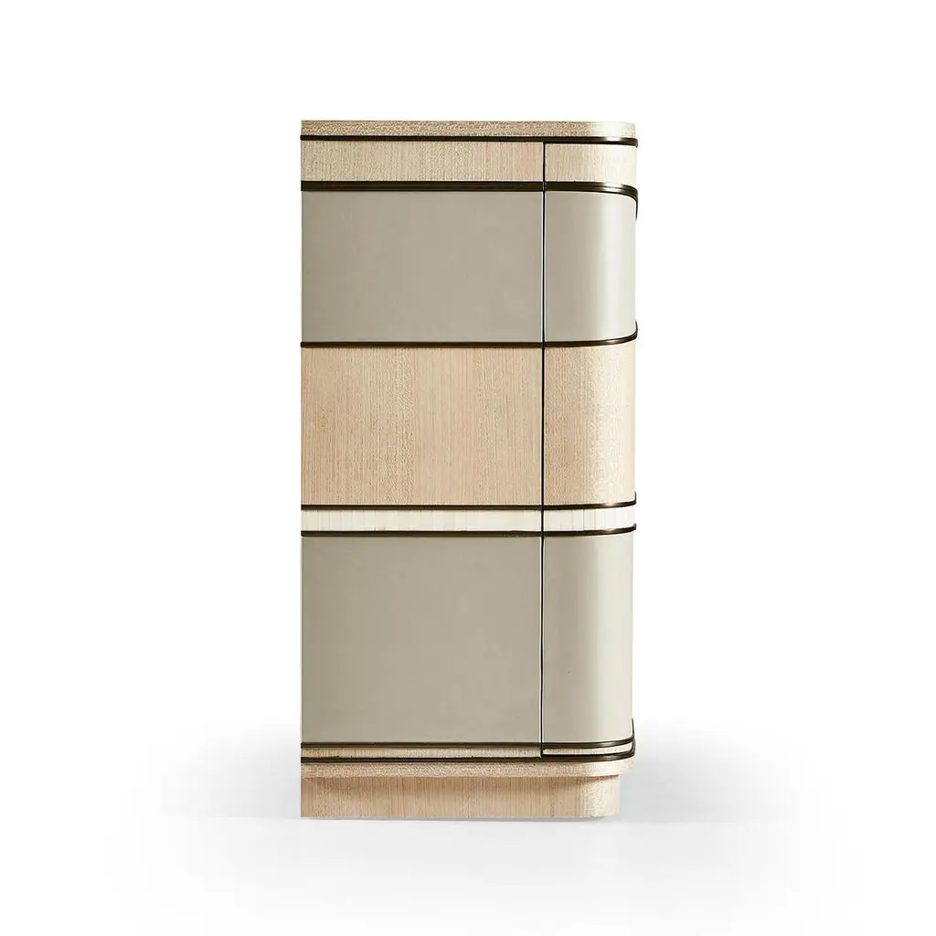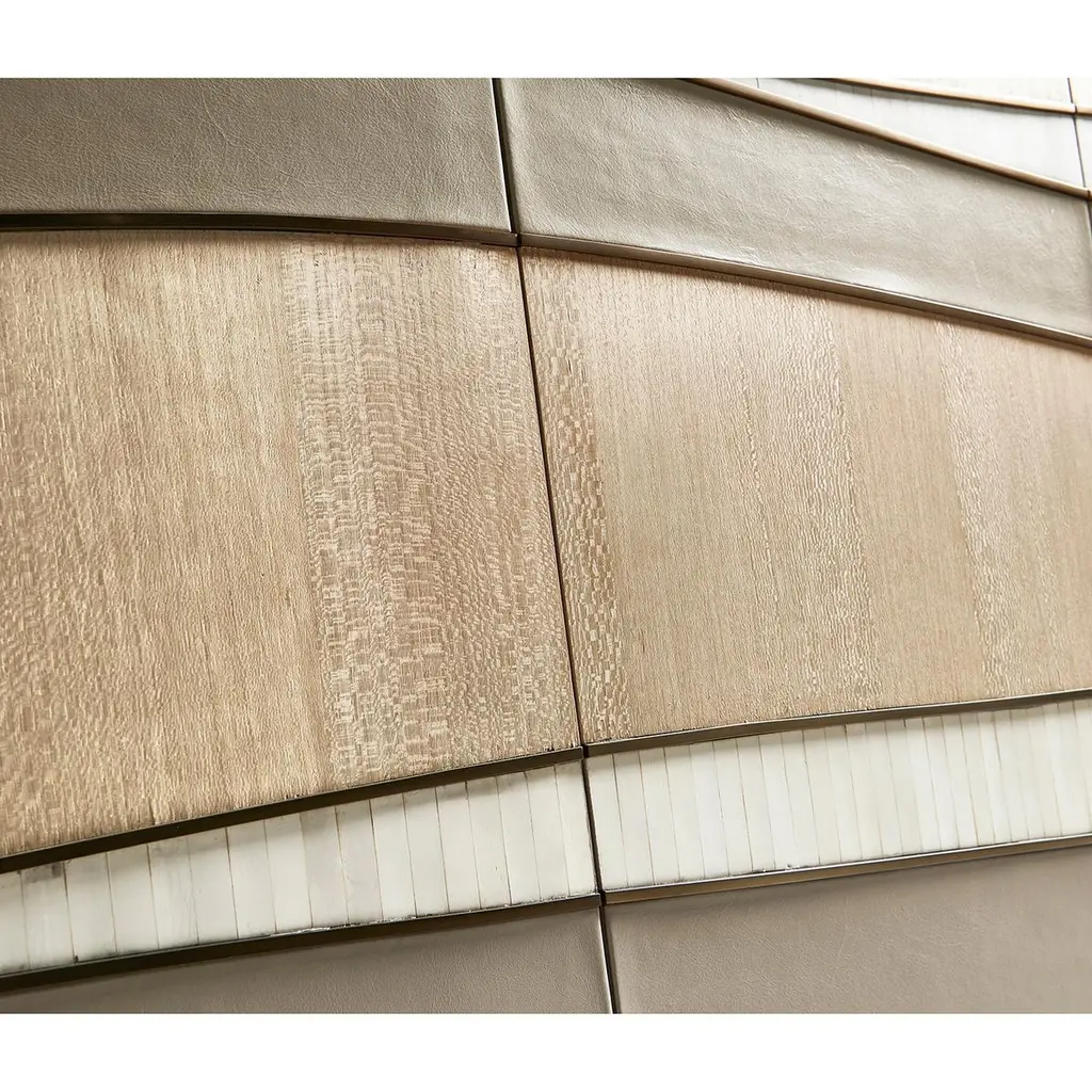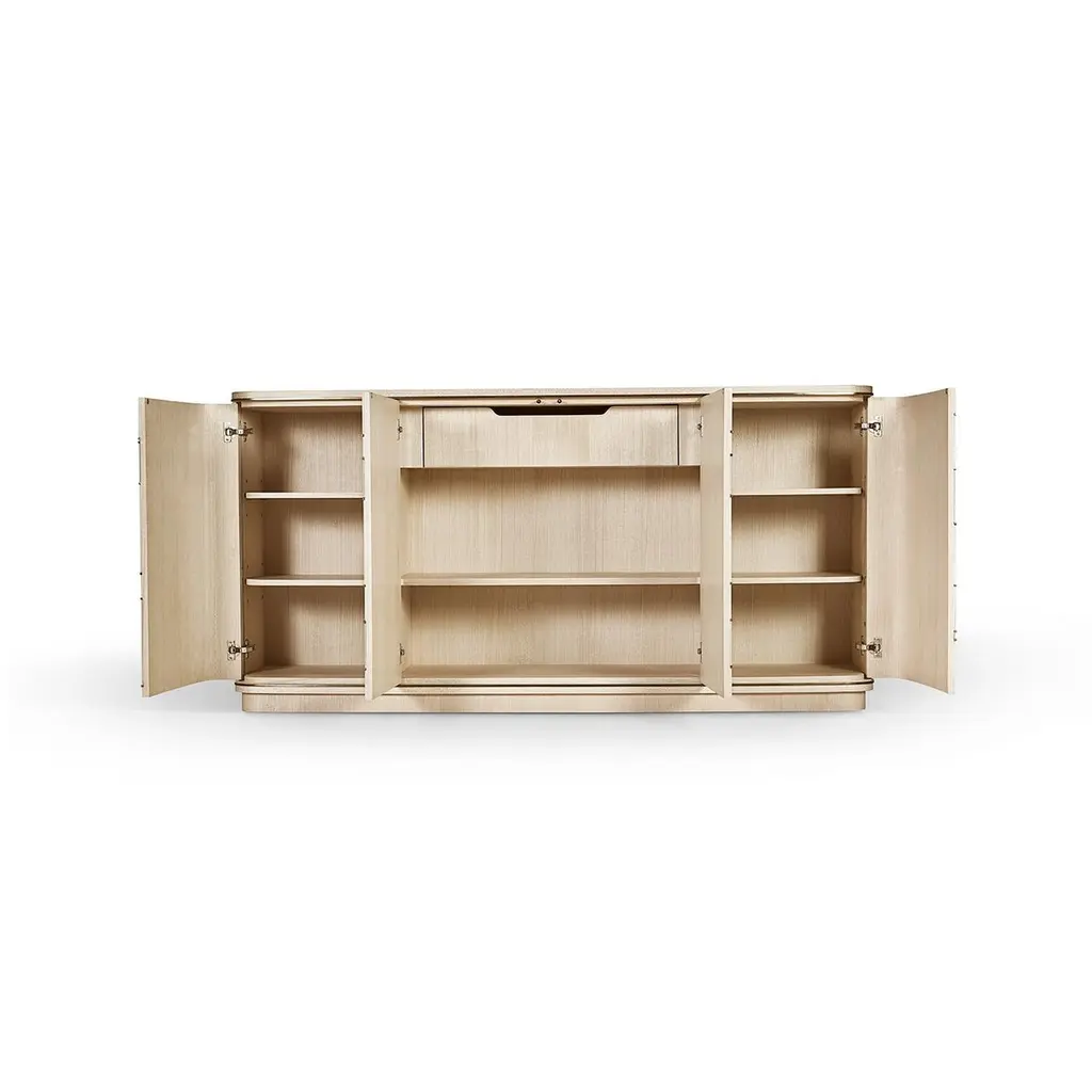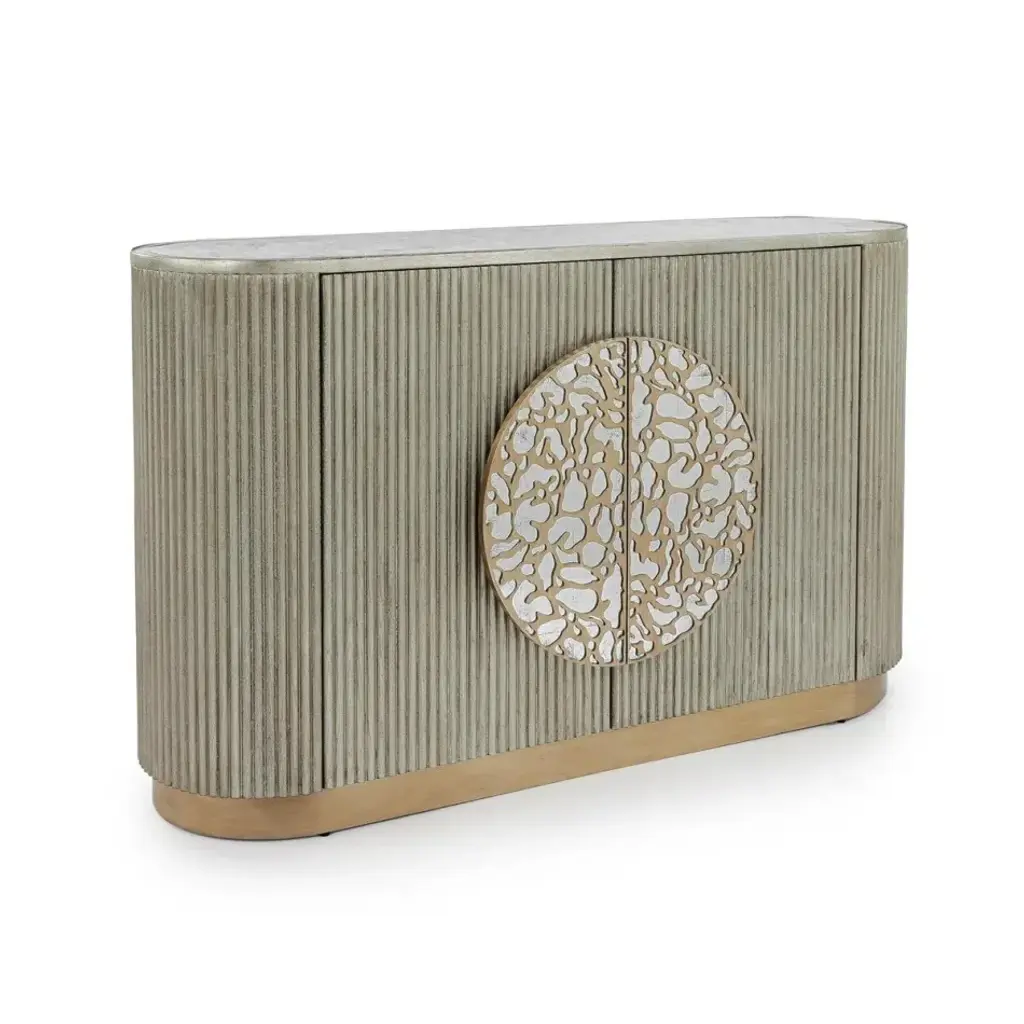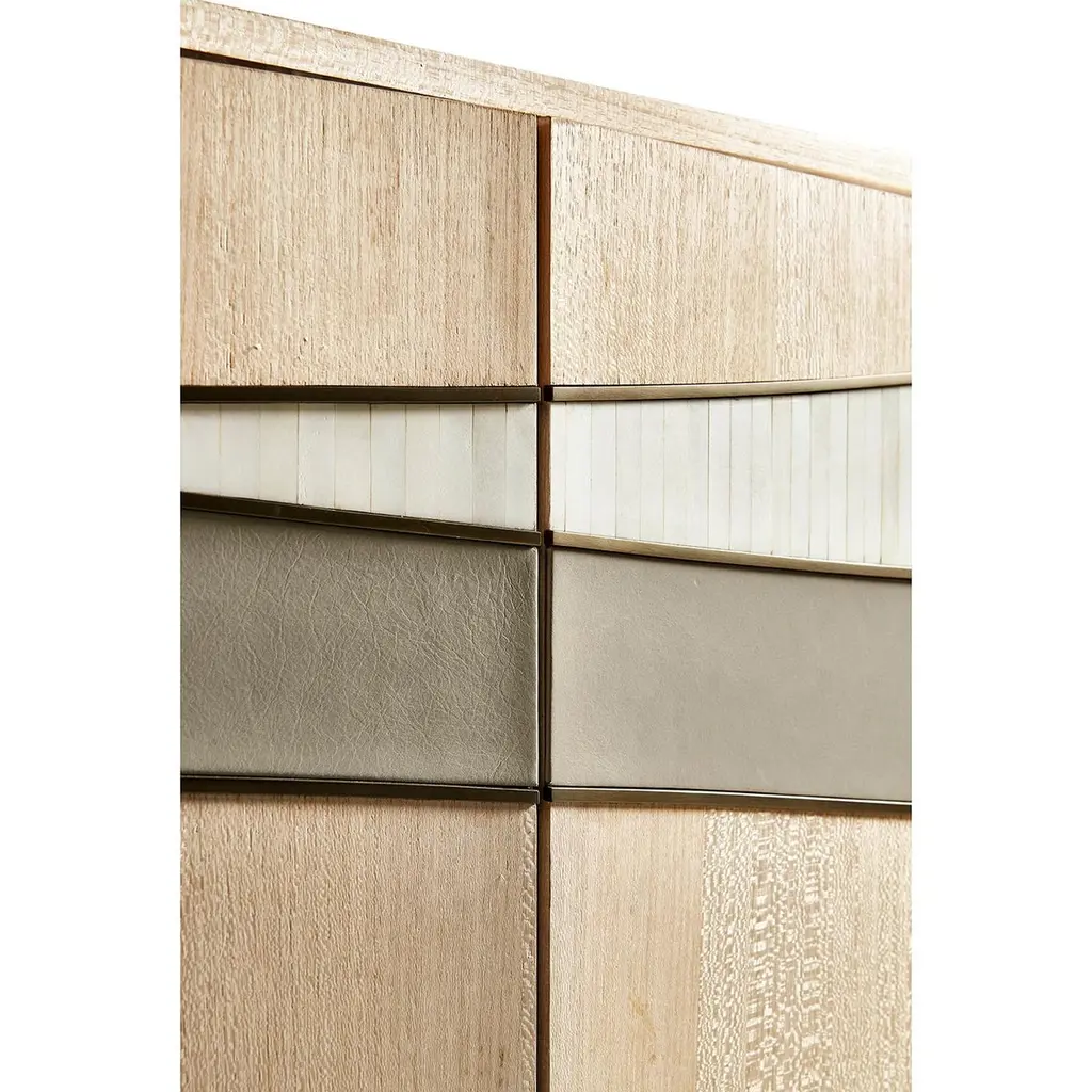 Its flowing wave motif, created with crème leather, natural bone inlay, and light wood, exudes a refined coastal elegance. Delicate metal inlays in a satin brass finish add a subtle glimmer, highlighting its sculptural design. This sideboard seamlessly combines function and artistry, making it a statement piece for sophisticated living spaces.Beyond its striking aesthetics, this piece offers thoughtful storage. Four touch-latch doors open to reveal adjustable shelving and a central drawer, providing ample space to organize dining or living essentials. Crafted with dyed Koto veneer, stainless steel accents, and luxurious materials, this sideboard embodies both beauty and practicality. Dimensions: 72.125" W x 18.125" D x 36" H