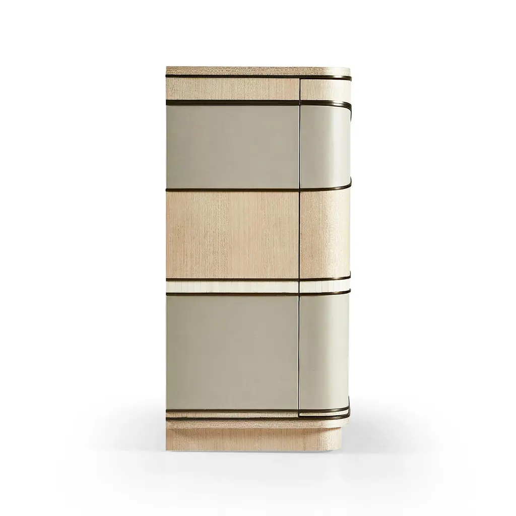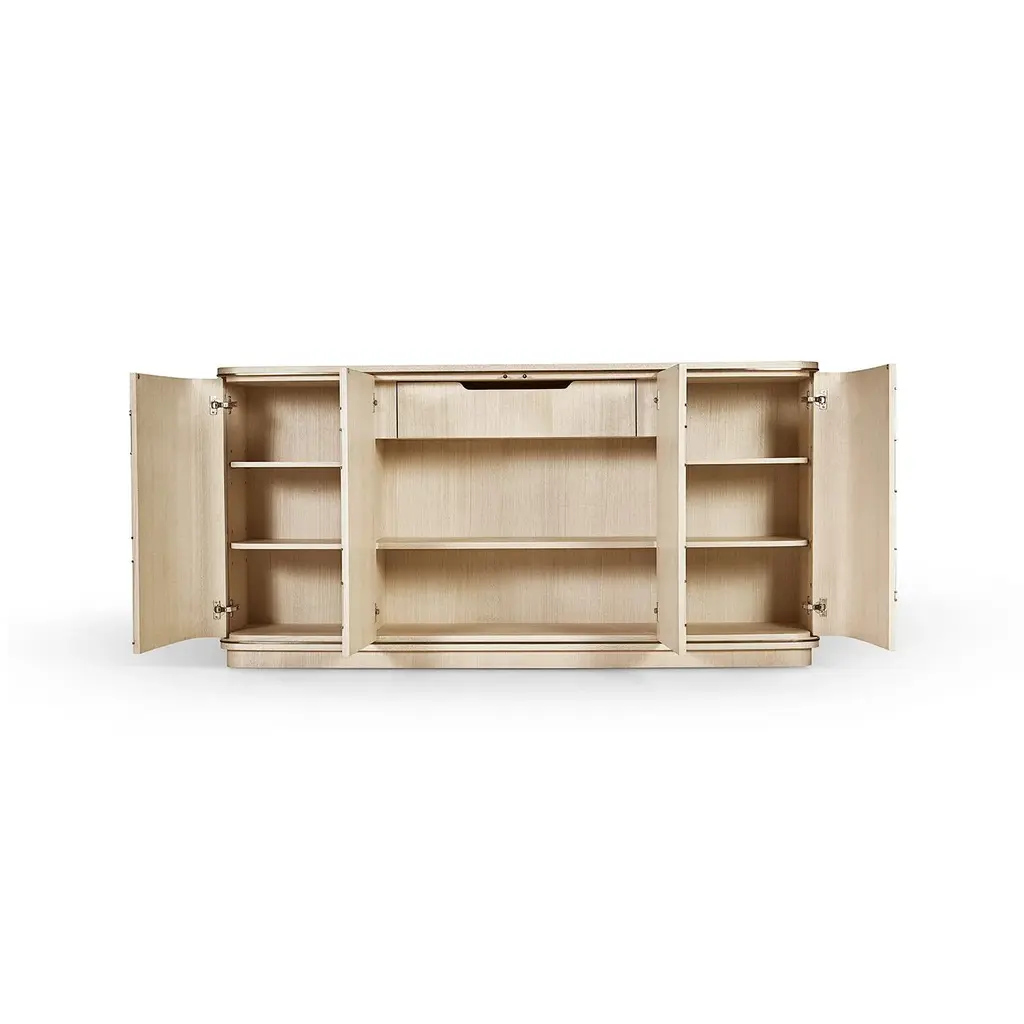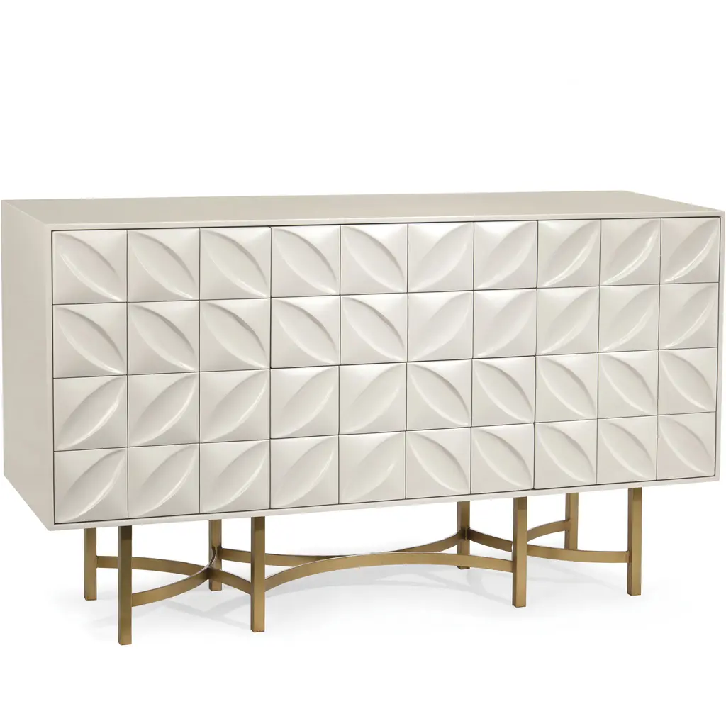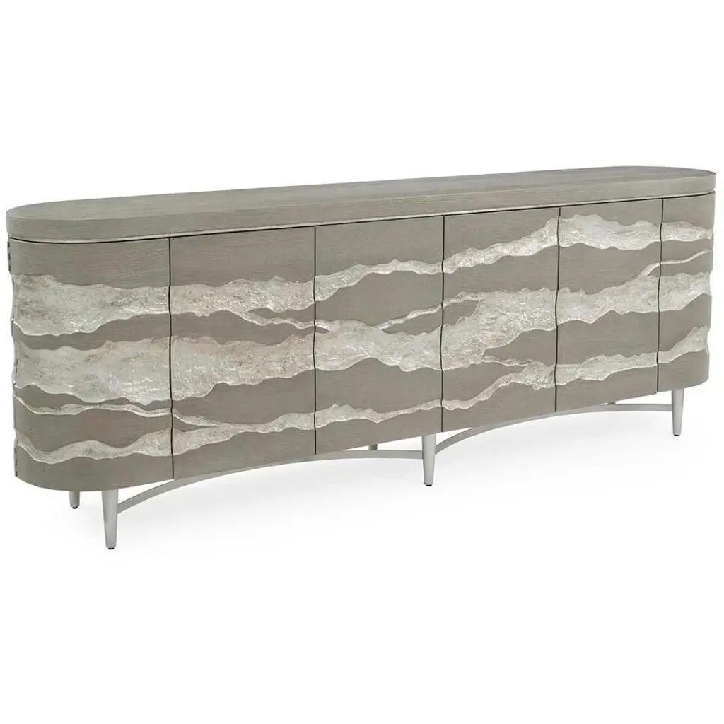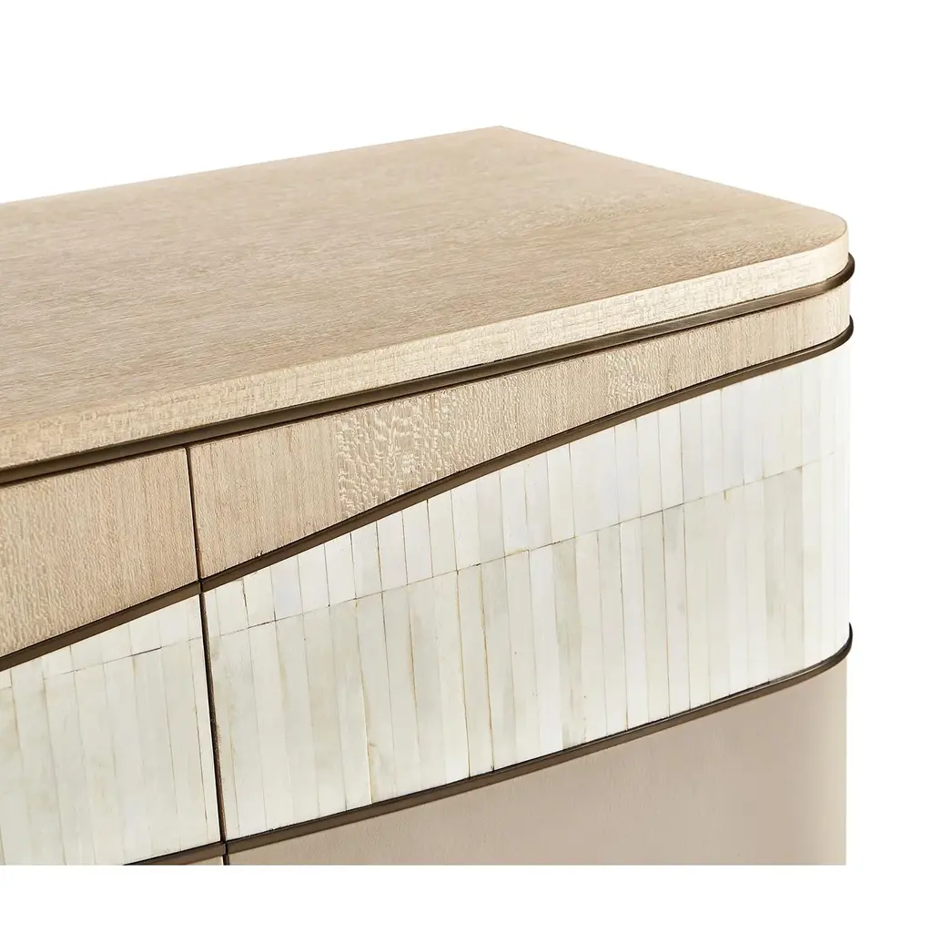 Its flowing wave motif, created with crème leather and light wood, exudes a refined coastal elegance. Delicate metal inlays in a satin brass finish add a subtle glimmer, highlighting its sculptural design. This sideboard seamlessly combines function and artistry, making it a statement piece for sophisticated living spaces. Beyond its striking aesthetics, this piece offers thoughtful storage. Four touch-latch doors open to reveal adjustable shelving and a central drawer, providing ample space to organize dining or living essentials. Crafted with dyed Koto veneer, stainless steel accents, and luxurious materials, this sideboard embodies both beauty and practicality. Dimensions: 72.125" W x 18.125" D x 36" H