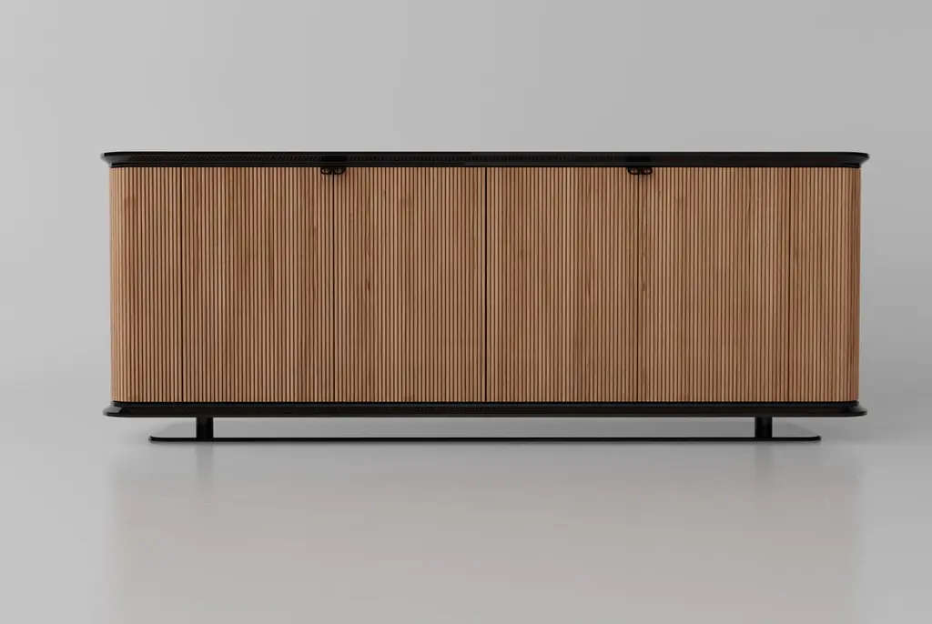NEMESI #1 is a doble sided wooden sideboard, designed by SAGARÍAThe clean geometry and the authentic eloquence of the material, the solid Canaletto walnut doors mixed with the Calacatta gold marble, are the intrinsic feature that underlines the sinuous, plastic shapes of NEMESI #1. The unit can be access from either side, make it suitable to be used as a room divider. Two front doors and, on the rear part as an optional, two more doors to facilitate the access from both perspectives. The two optional doors are quoted separately. Inside, two wooden thin though strong shelves look floating in the air. The vast choice of finishes and hues make it possible to create compositions for every scenario and furnishing context. The sideboard can be customized in finishing and materials upon request.Edges: Canaletto walnut woodTop: honed Guatemala marbleFrame: powder coated metal black extra glossBody: fluted Canaletto walnut woodKind heart, fierce mind, brave spirit.The sideboard can be customized upon request.
