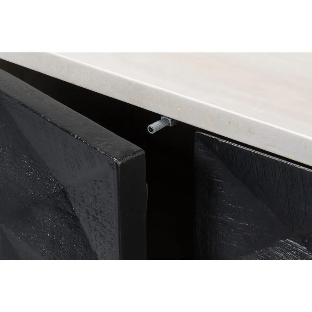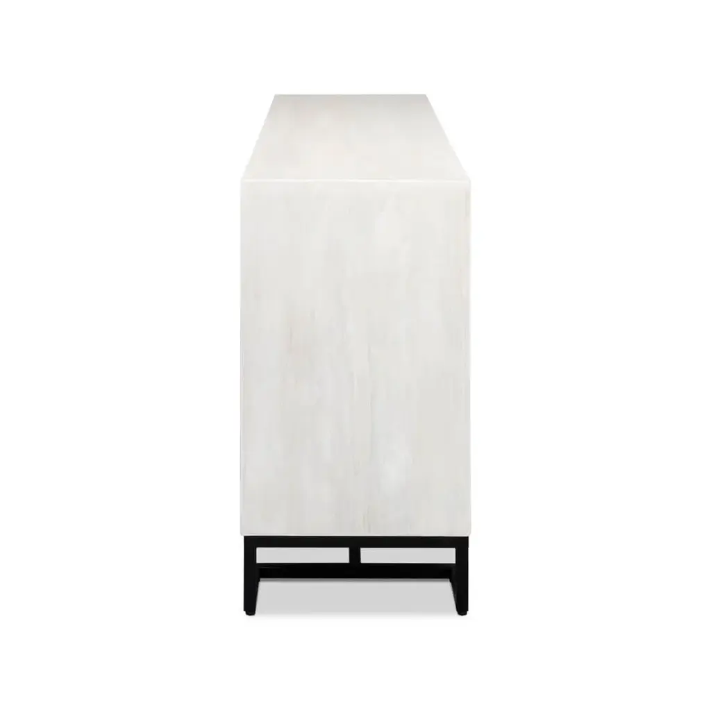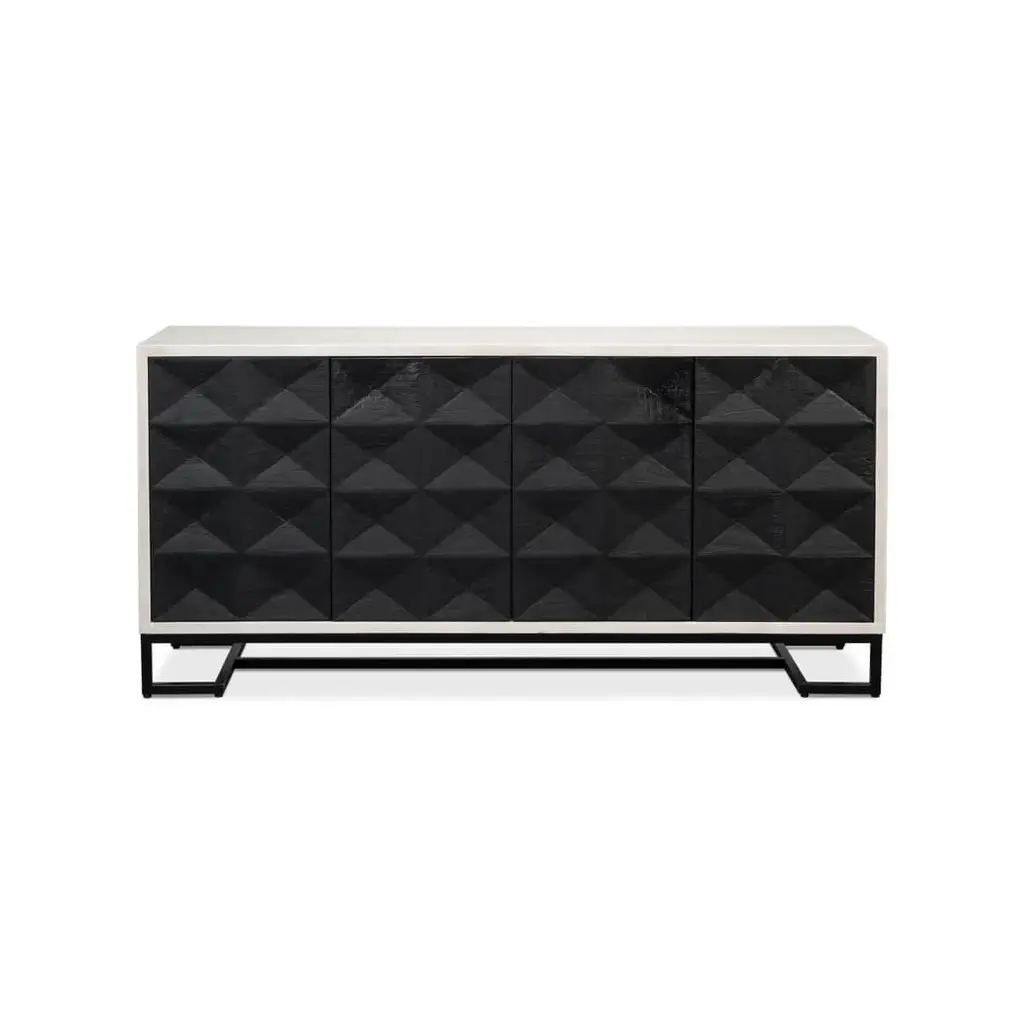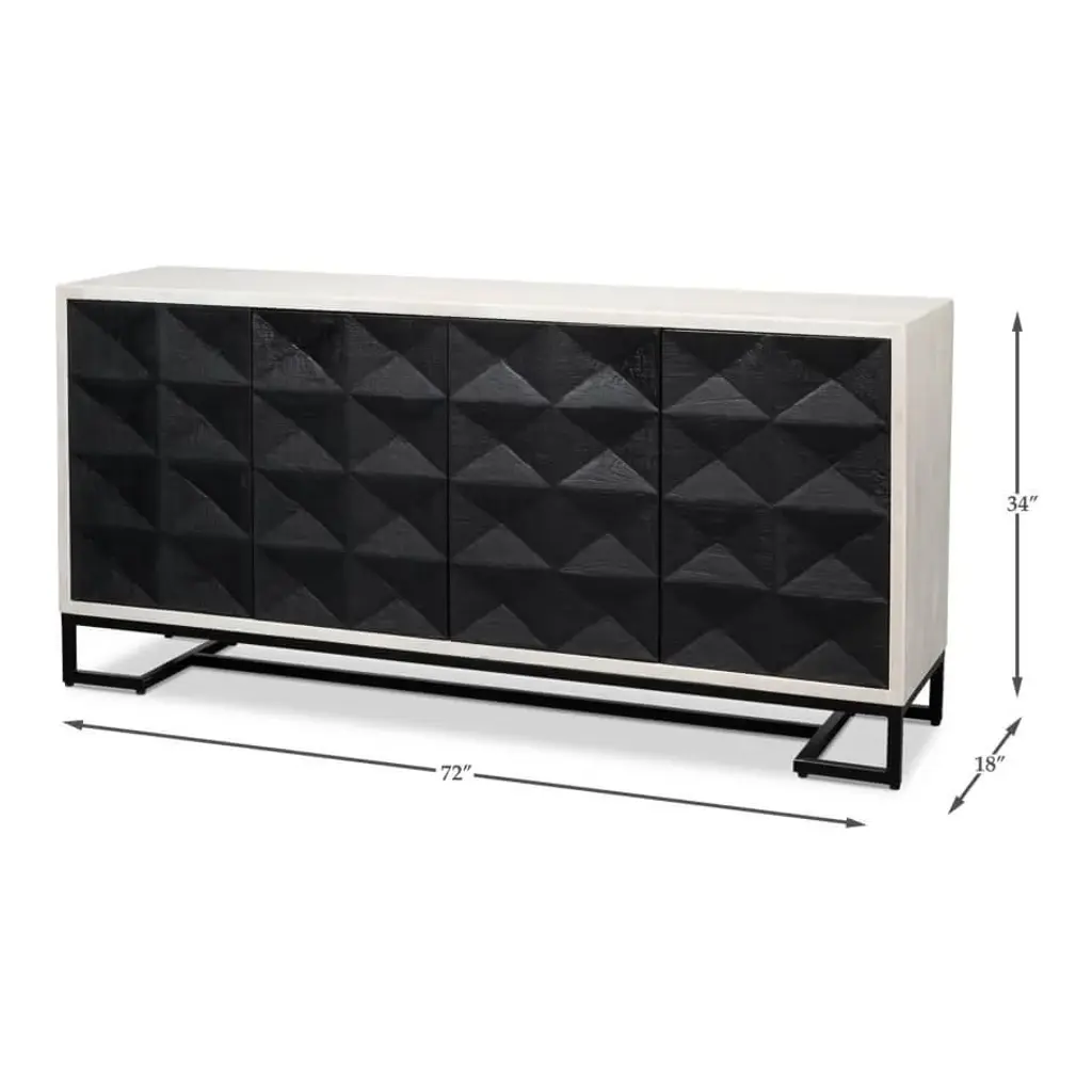 Where bold design meets practical storage. This statement piece features a striking geometric patterned facade, reminiscent of the classic styling of brutalism architecture, and offers a tactile and visual feast that instantly draws the eye. The contrast of the black geometric door panels to the off-white structure adds a modern, high-contrast aesthetic to any living space. Resting on a minimalist metal base, the clean lines ensure it doesn't overwhelm but rather complements your existing decor. Dimensions: 72" W x 18" D x 34" H