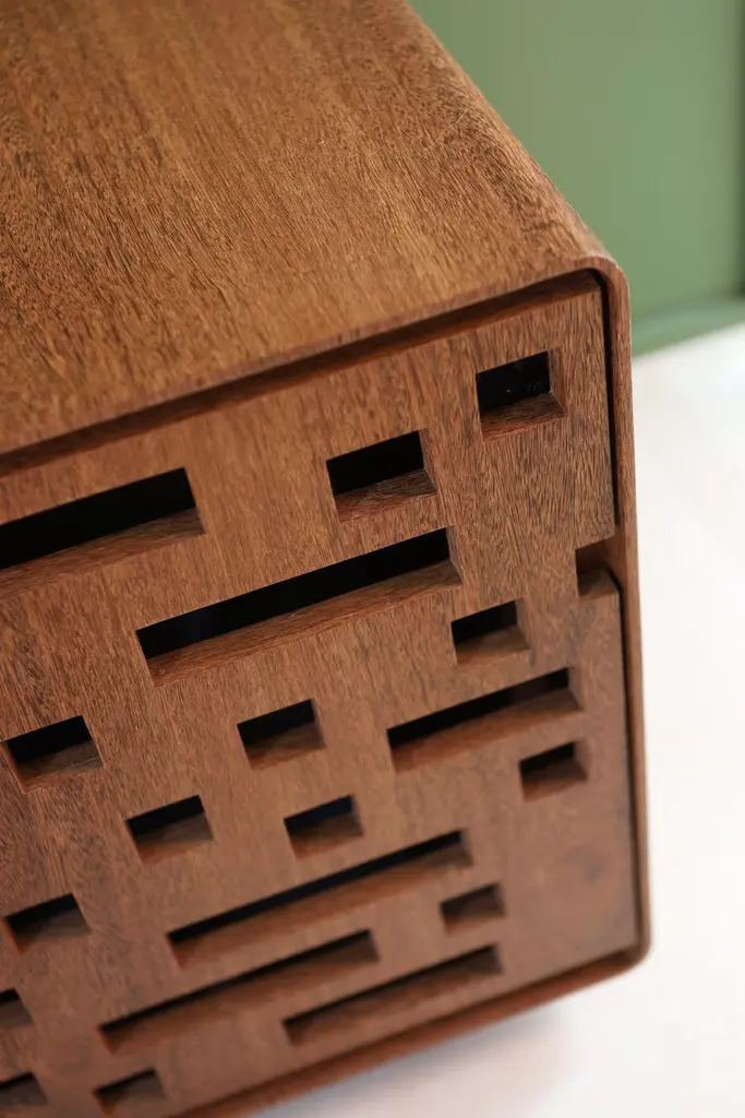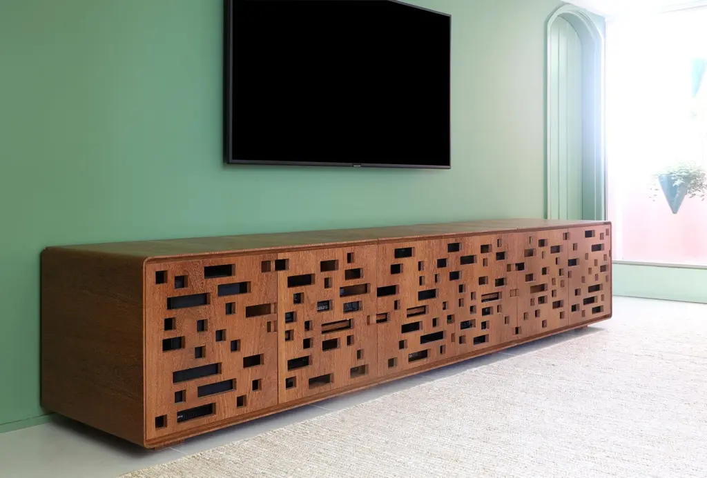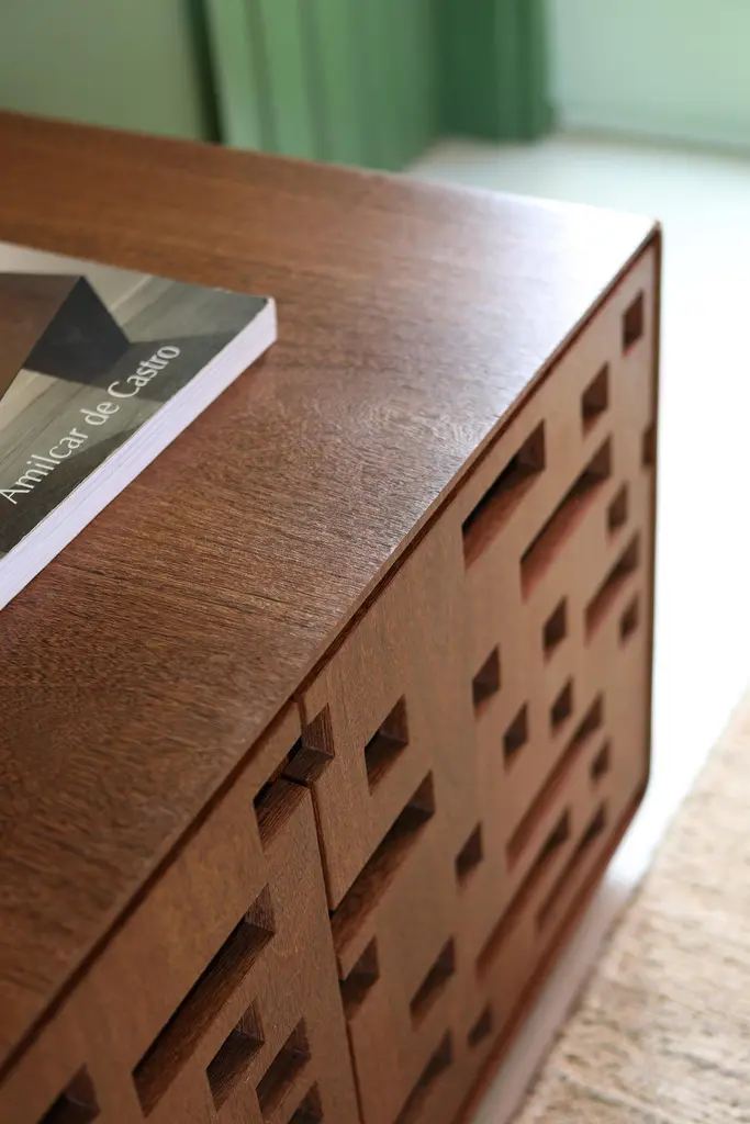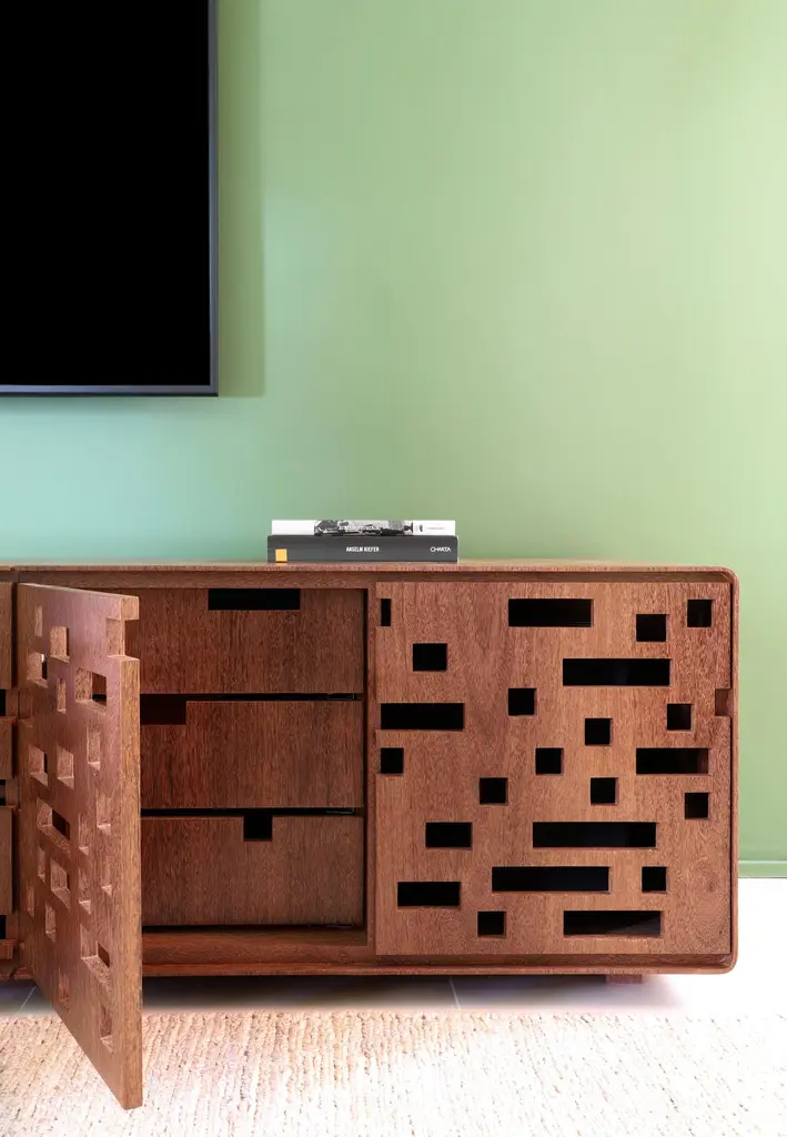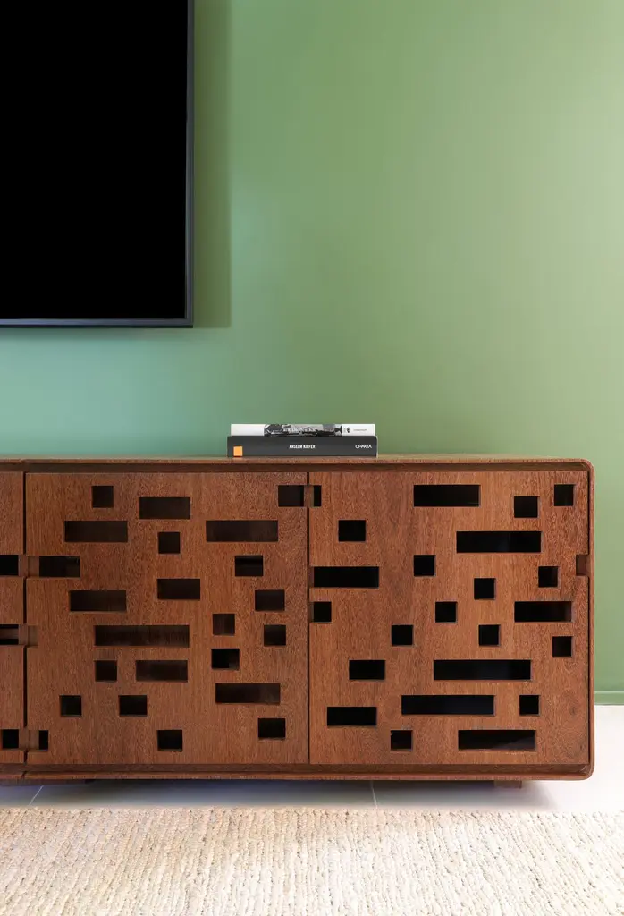 In the plenitude of timelessness, Brick Sideboard is inspired in the bricks facades worldwide. The door’s hollow cutouts have the function of providing access to the audio and video equipment, as well as ensuring the necessary ventilation for their operation.Its manufacturing is made in an industrialized wooden plate and solid wood. The finishes is made by the options made available on a natural sheet of wood and german ironworks.