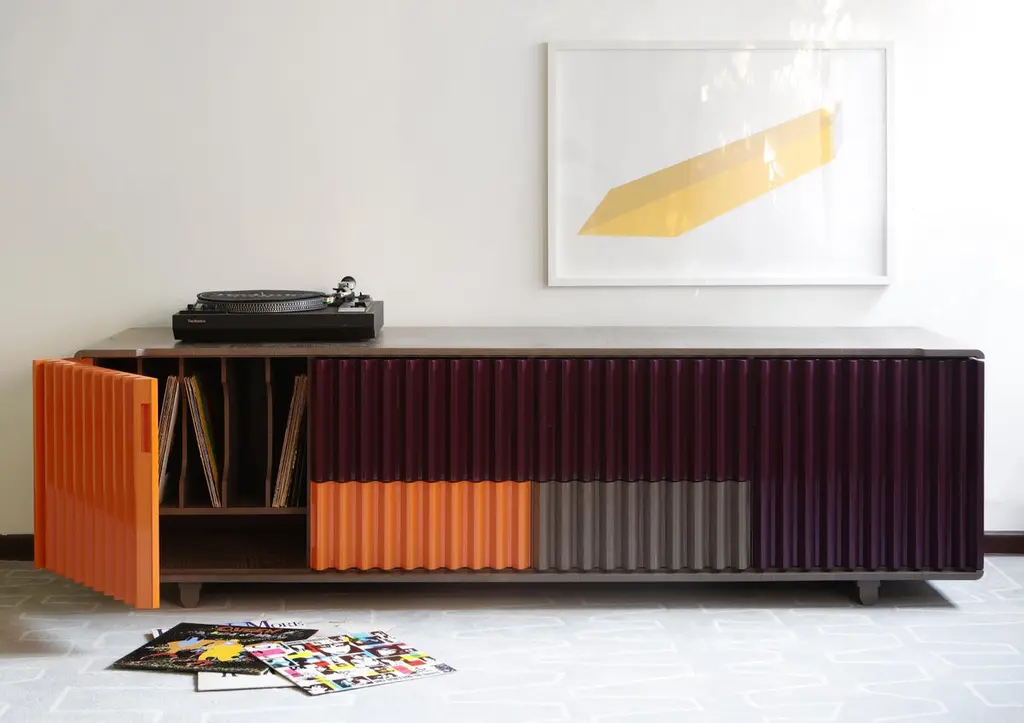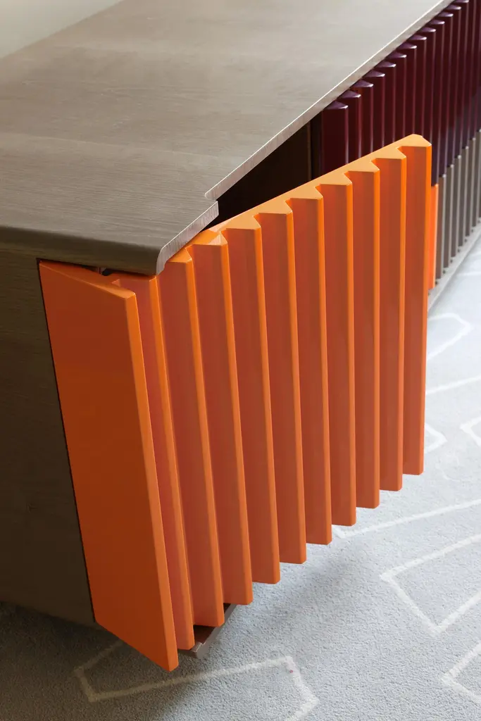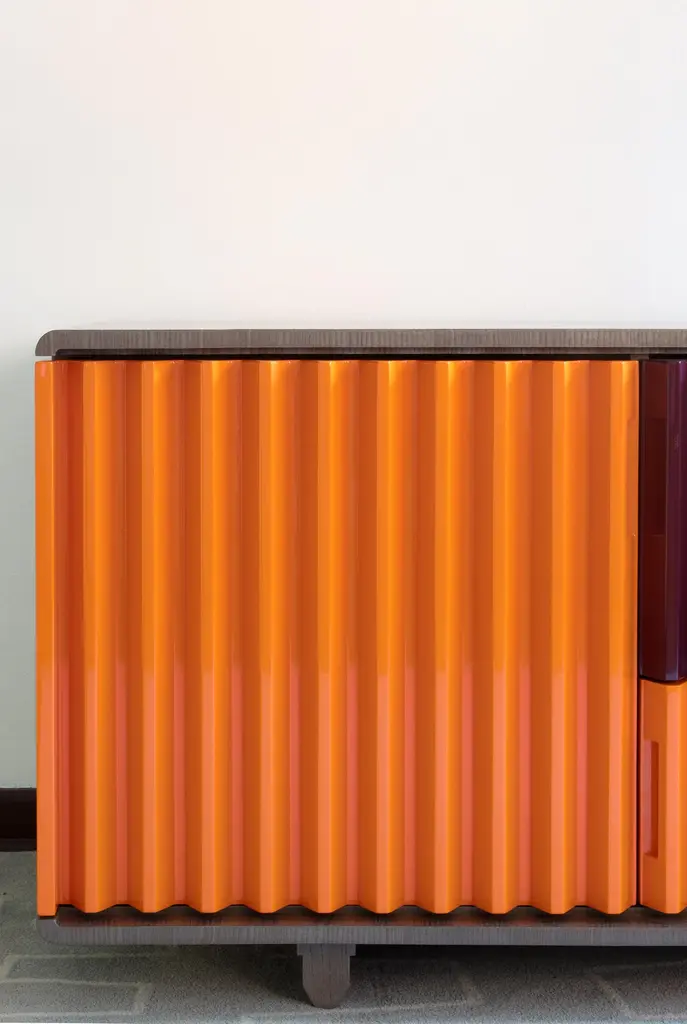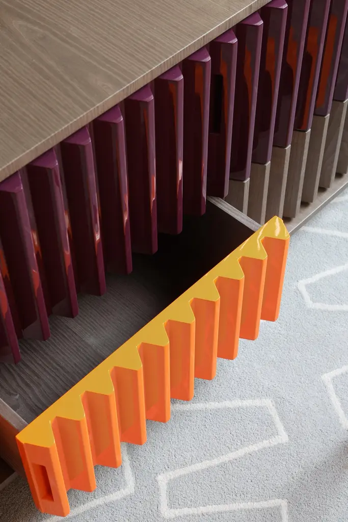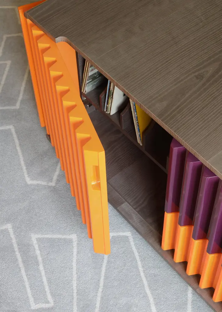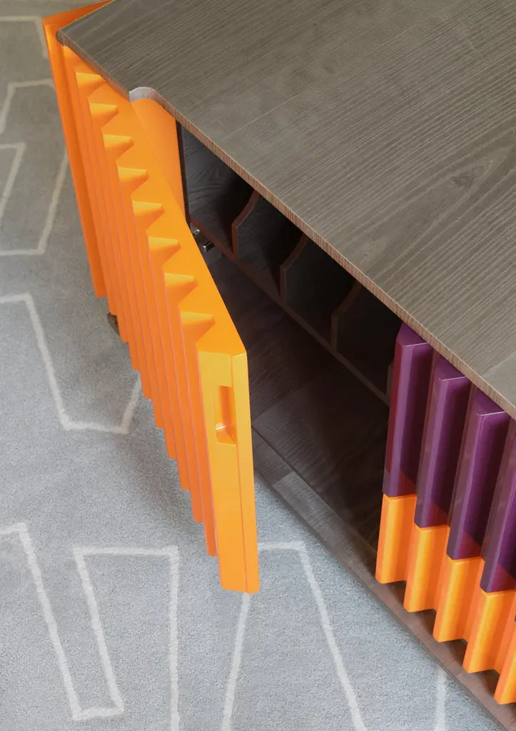 As in a movement of multicolored gears, it is possible to notice the match of the doors and drawers by their shapes and colors. The embedded handles, almost imperceptible, are based on the "retrofit" design of the work.Its manufacturing is made in an industrialized wooden plate and the finish is made by the options made available on a natural sheet, lacquer and exclusive ironworks.