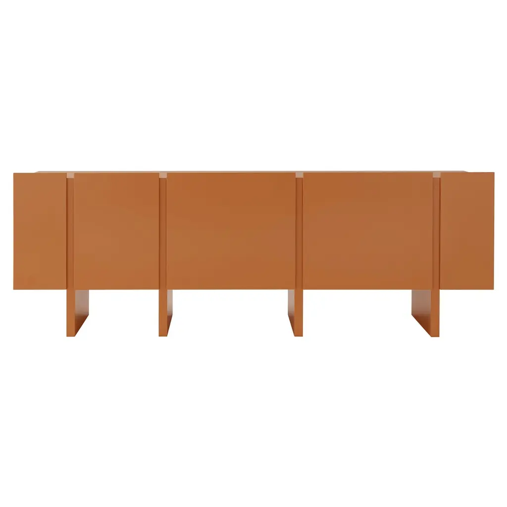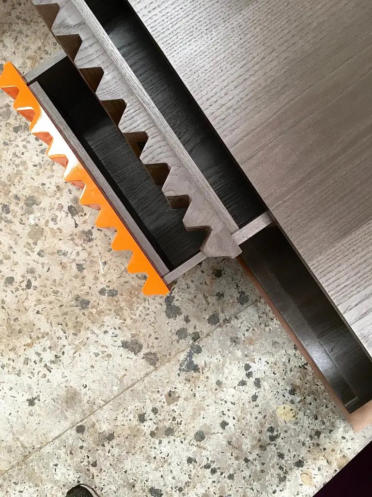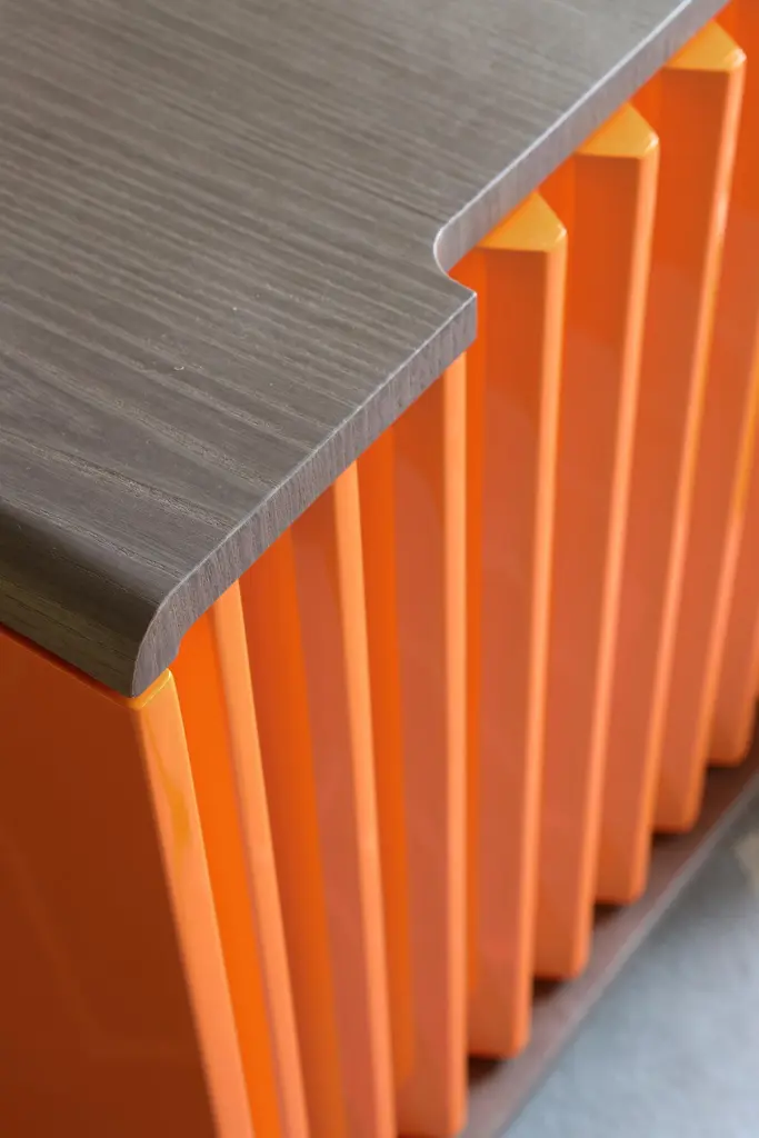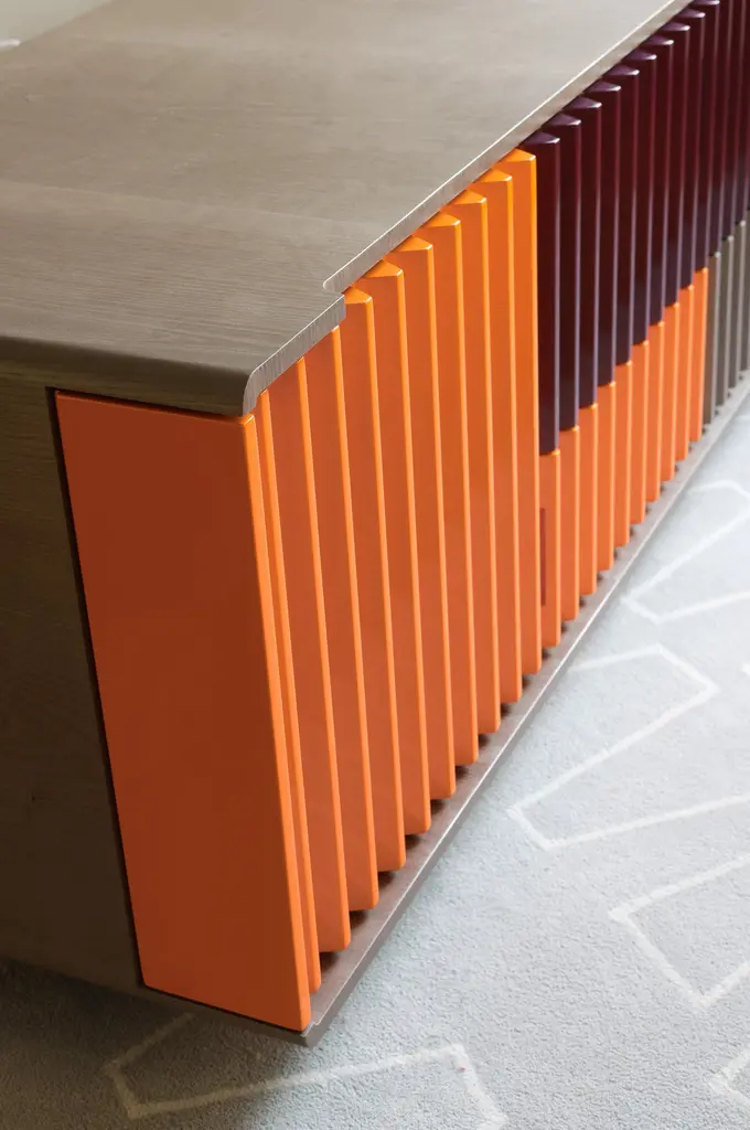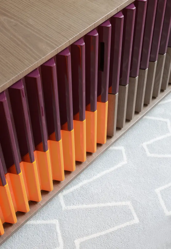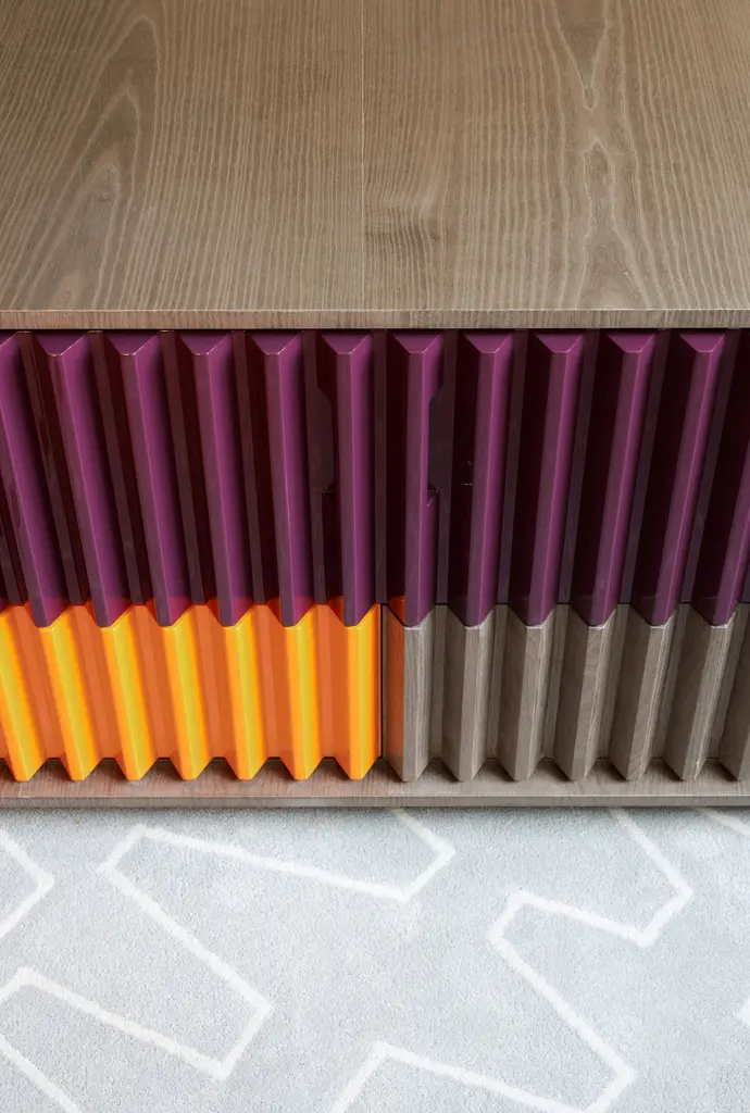 As in a movement of multicolored gears, it is possible to notice the match of the doors and drawers by their shapes and colors. The embedded handles, almost imperceptible, are based on the "retrofit" design of the work.Its manufacturing is made in an industrialized wooden plate and the finish is made by the options made available on a natural sheet, lacquer and exclusive ironworks.