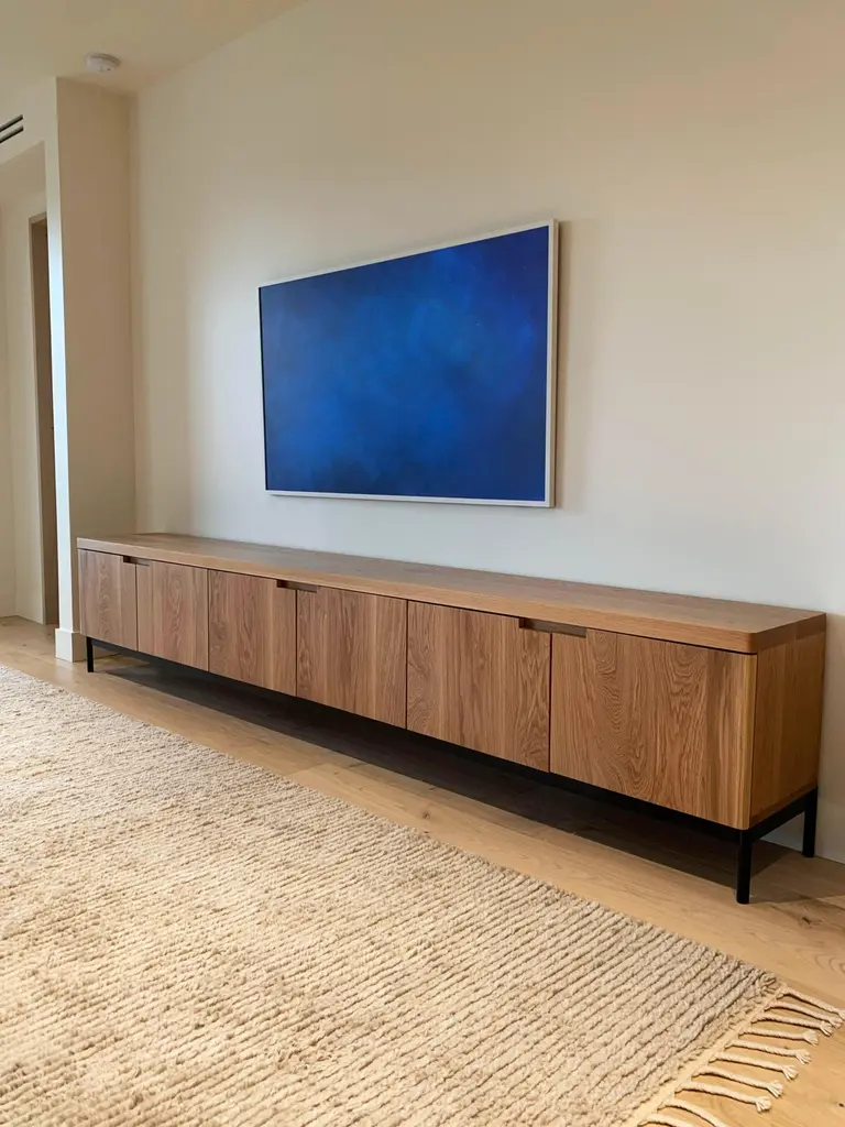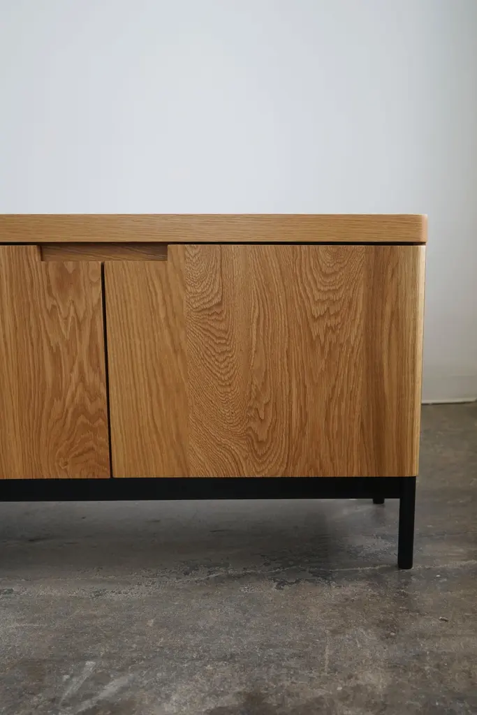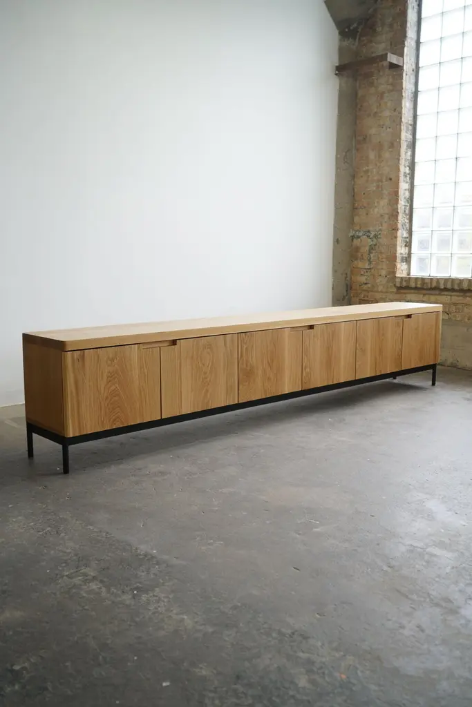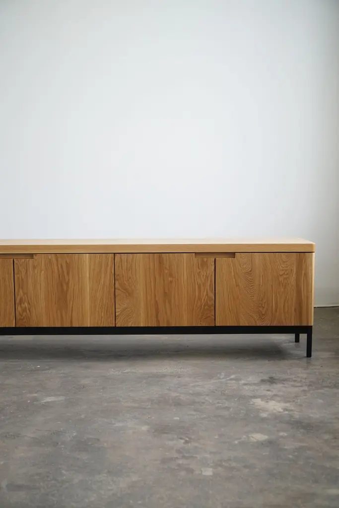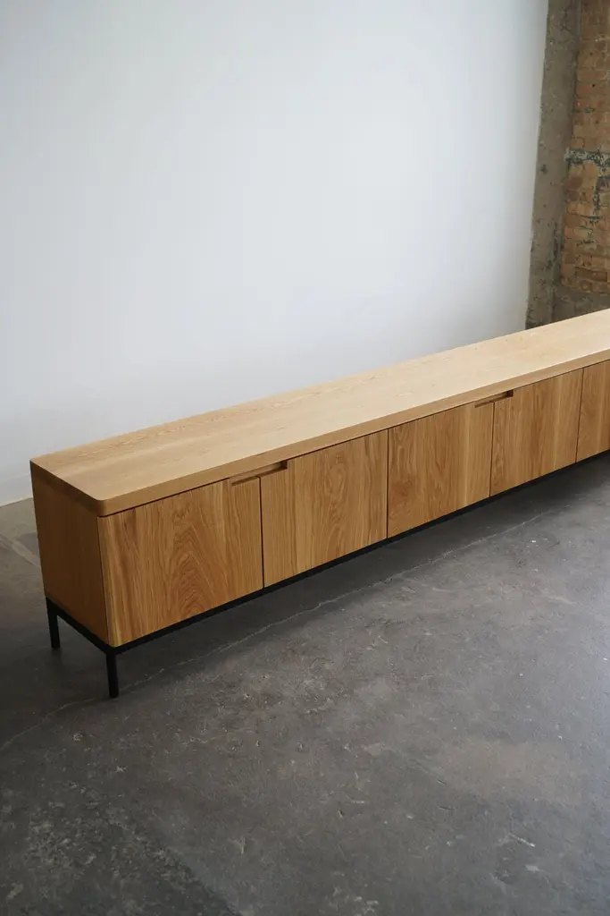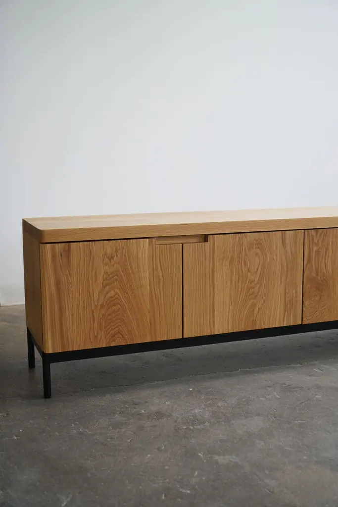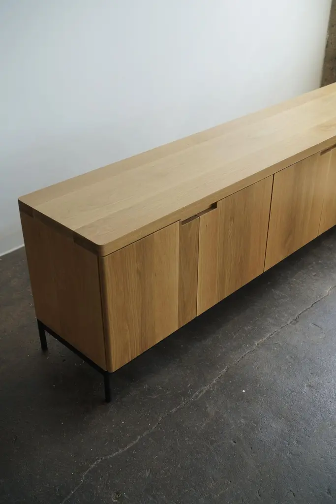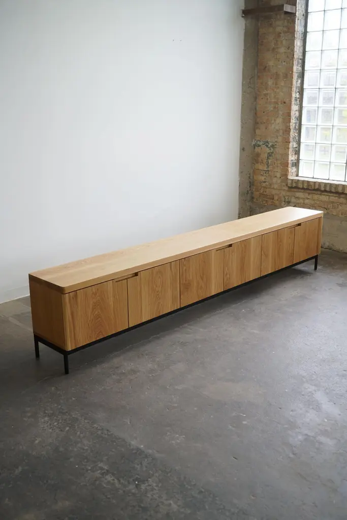 Contemporary solid white oak credenza in a natural finish.Complete with (6) soft-close doors, adjustable shelves inside, and a steel base. Credenza pictured has dimensions of: 120” L x 16” D x 24” H.This piece is made-to-order, and custom options are available.Current lead time is 11-12 weeks.Please inquire with any questions.