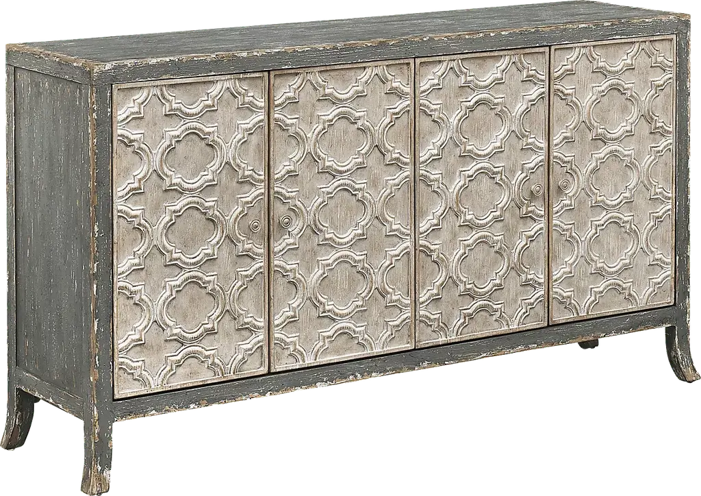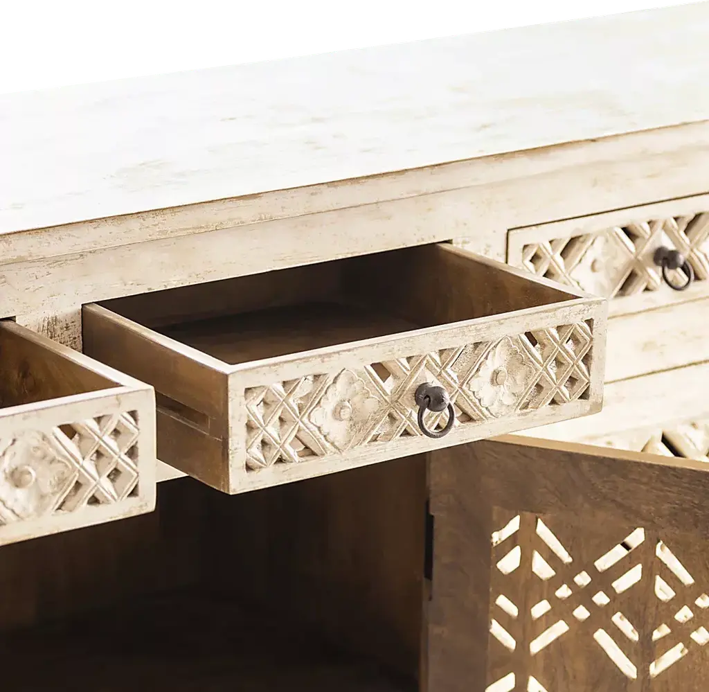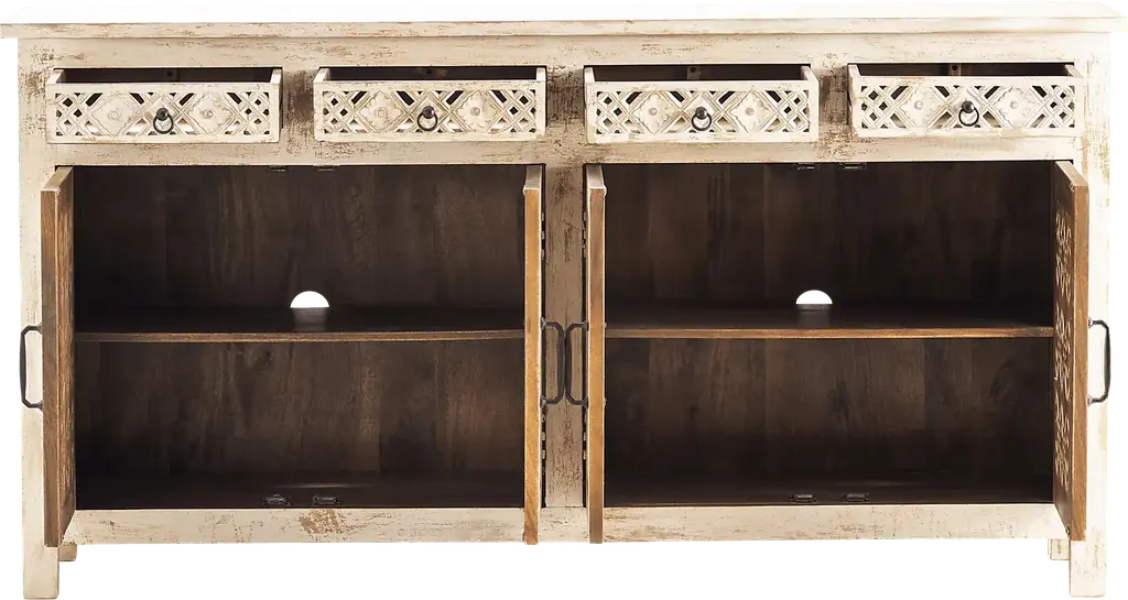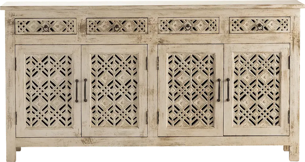 Elevate your home with the Coomes beige sideboard. Crafted from solid mango wood, it boasts a beige finish with brown undertones and a distressed painted look. The piece features four drawers and four doors, each adorned with intricate carved geometric designs. Inside, two fixed shelves provide ample storage, while two cord management holes and adjustable levelers enhance functionality. With easy assembly, just add feet and handles, this elegant addition effortlessly blends style and convenience. Customer assembly is required.