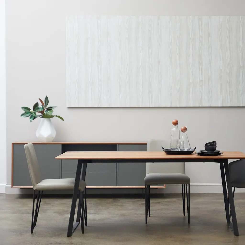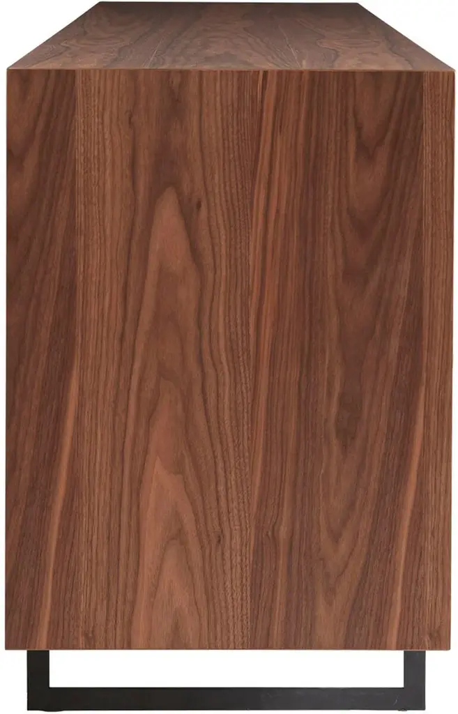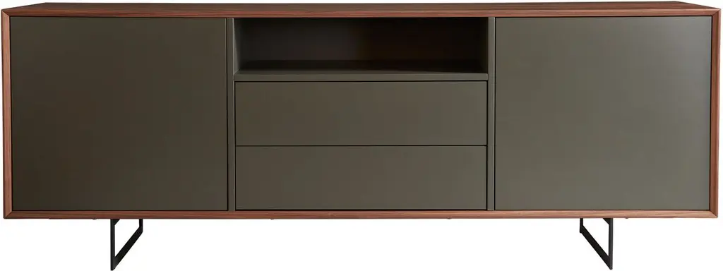 Sleek and sophisticated, this sideboard sets gray lacquered doors and drawers within an outer frame finished in warm walnut, which in turn rests atop slender steel legs. Behind each door is a shelf; in the center are two drawers and another shelf. The sideboard is contract grade, which means it's durable enough for use in restaurants, hotels, and other businesses—so it's certainly sturdy enough for your home.