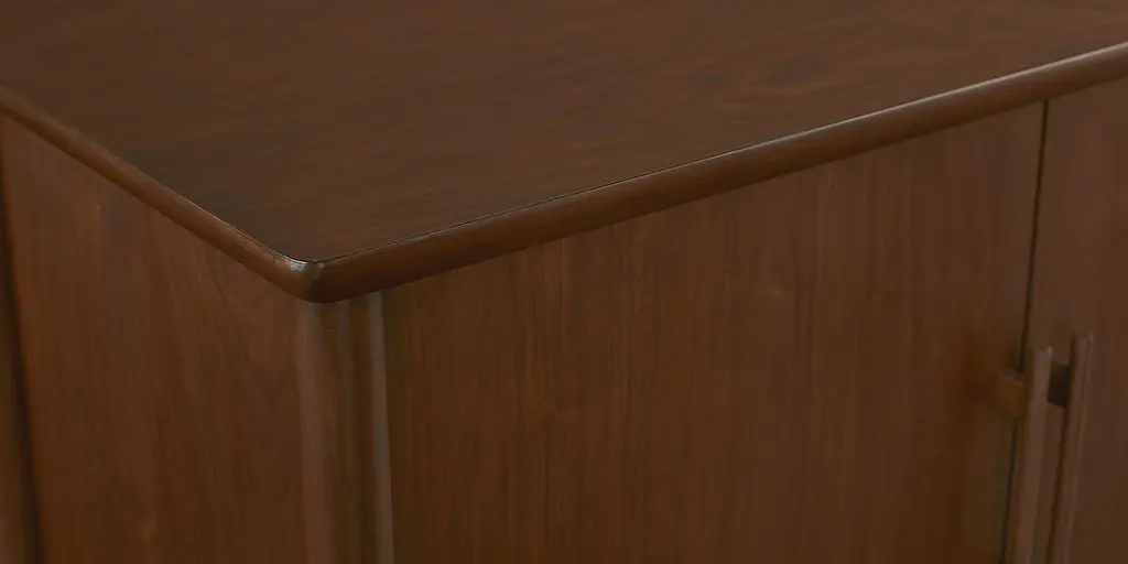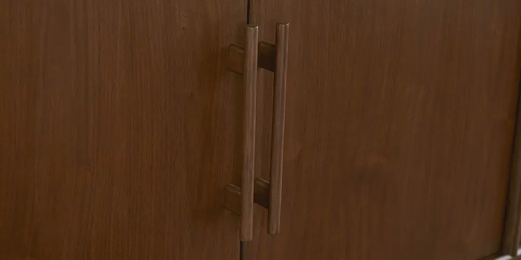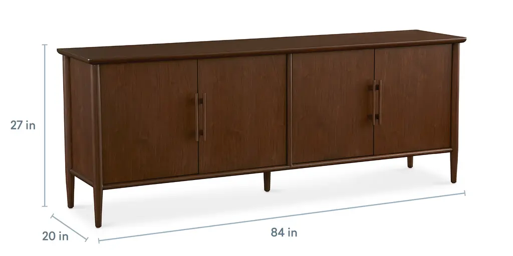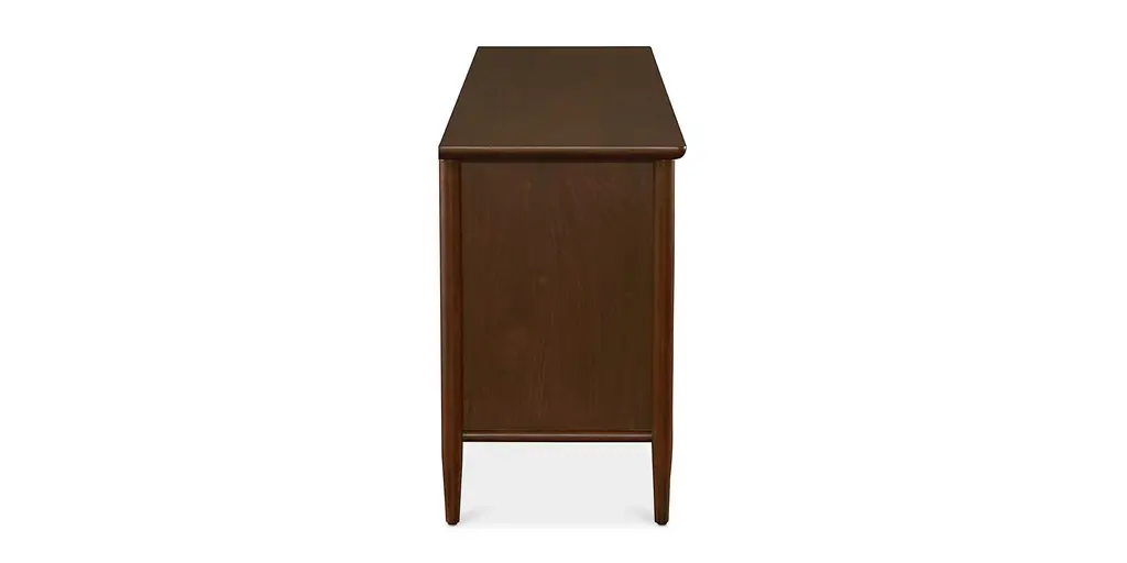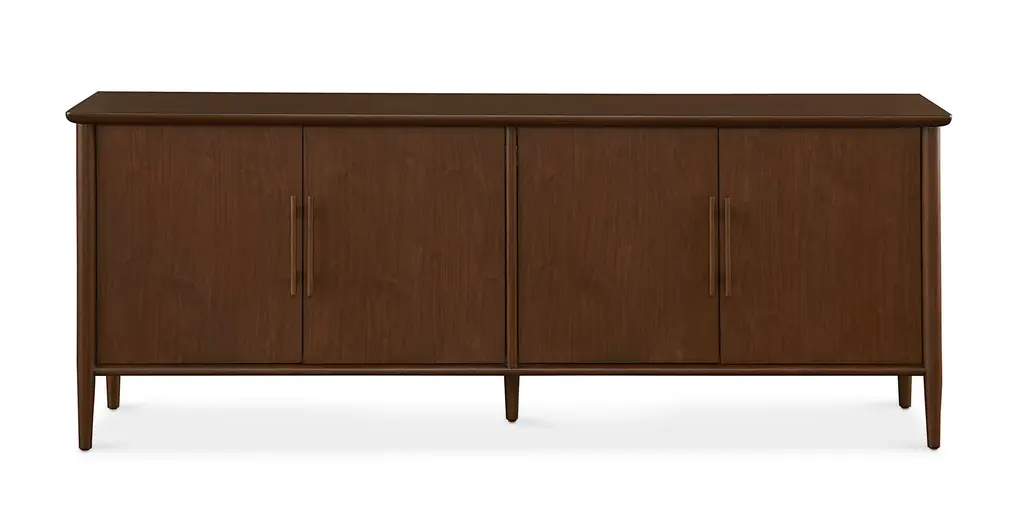 Offering classic sideboard styling, the Copenhagen Sideboard can be used for both dining storage and as an entertainment console. The walnut-veneered unit features two sets of wood doors on soft-close hinges. Each side has one fixed shelf and wire management holes behind an exterior displaying rounded trim details and solid beech wood handles. Enjoy a lightness of style attitude, inspired by Danish Modern design and artfully reinforced by its slender, tapered legs.