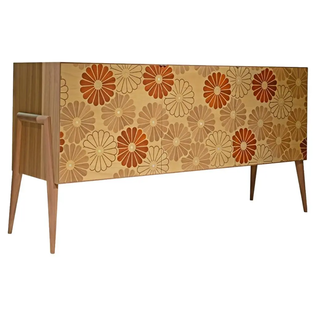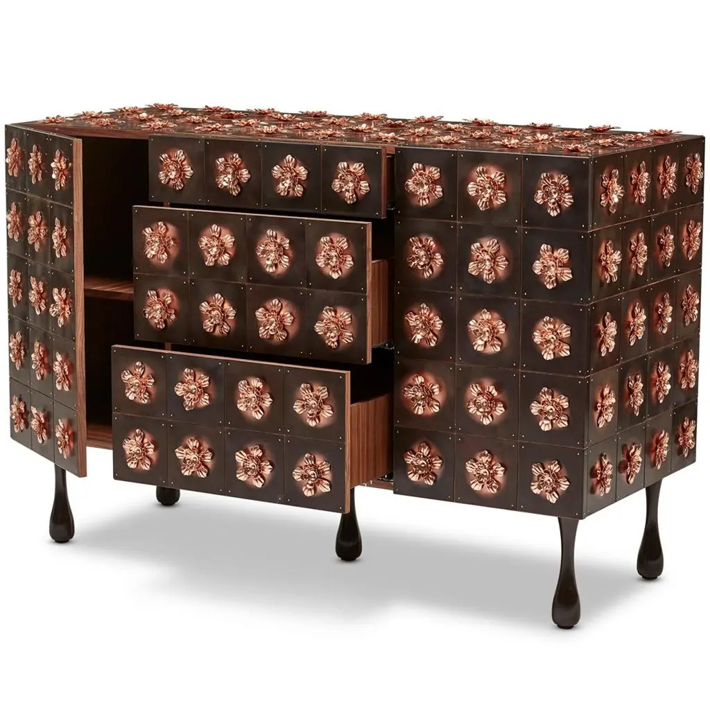 The Rosette sideboard belongs to the Rosette collection designed by Egg Designs and manufactured in South Africa.This high end, contemporary and bespoke server is covered with a riot of copper steel flowers, these flowers surround the entire piece which makes its positioning in a room elegantly three dimensional. The exterior is clad in burnished steel plates, hand pinned with copper tacks, while the interior of the server is crafted in walnut, both solid and veneer. The solid steel legs with their quirky shape are blackened and burnished.