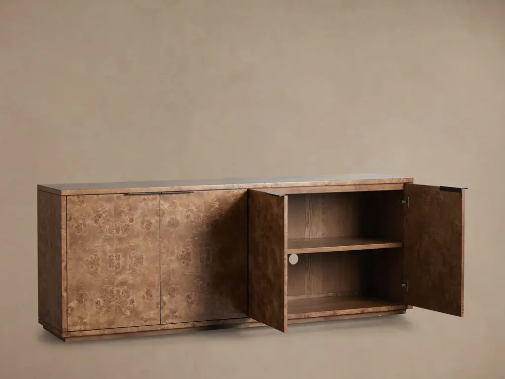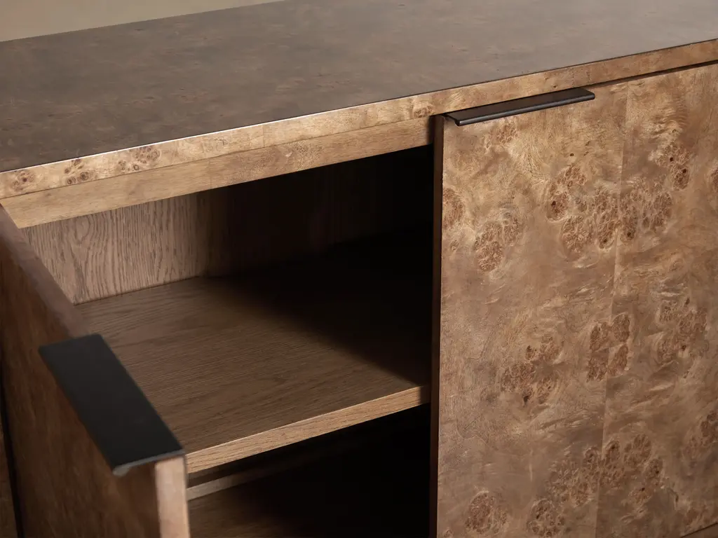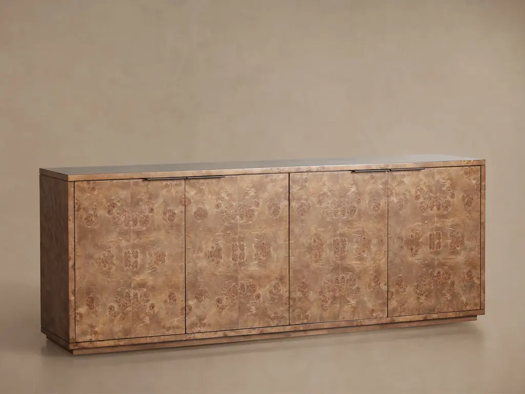 Transforming from accent décor to focal point in any room, our Corey Sideboard is a versatile piece that fits seamlessly into any home aesthetic. Eye-catching burl wood prized for its unique beauty is hand-finished to illuminate every swirling wood grain detail with warm honey or rich brown color tones. Resting on a modern platformed plinth, the Corey Sideboard combines textured warmth with modern style to create a dynamic statement wherever your décor leads.