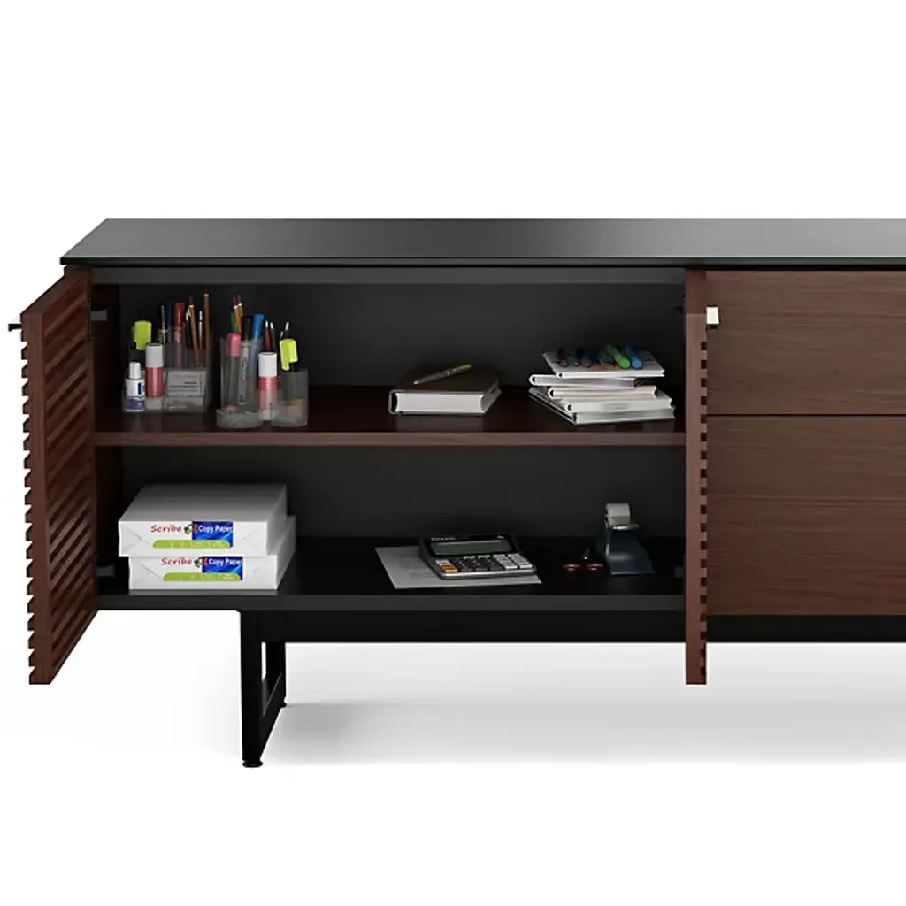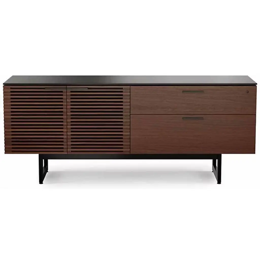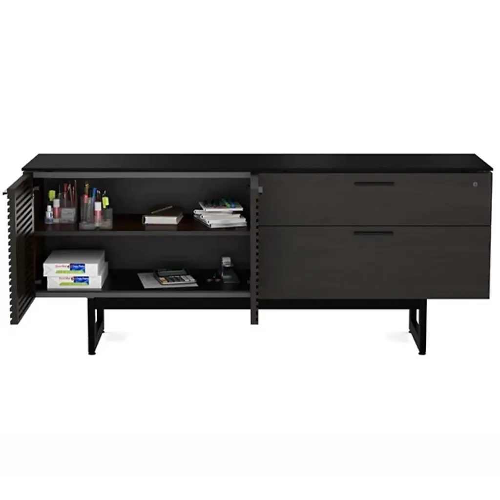 The BDI Corridor Credenza brings organization and Corridor's signature slatted style into the office. On one side, louvered doors conceal a large cabinet with adjustable shelving, while 2 locking drawers occupying the other half can store and secure supplies and hanging file folders. A black Satin-Etched Tempered Glass top complements the wood cabinet and finishes off the piece's luxurious look and feel.