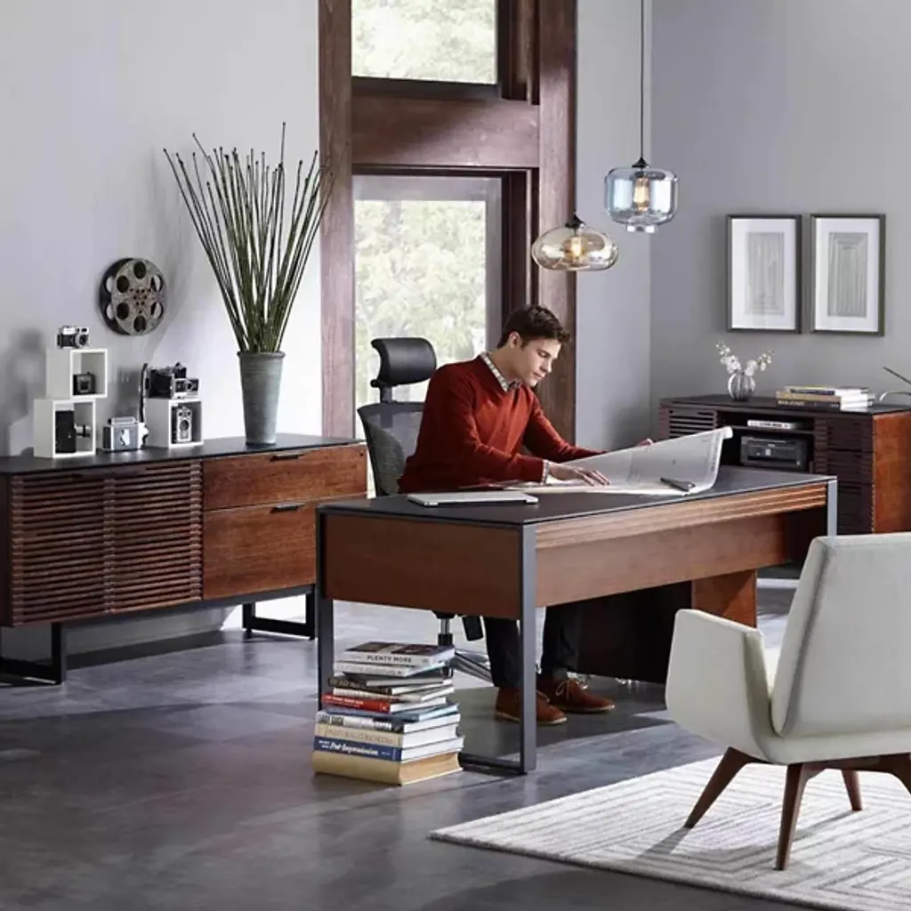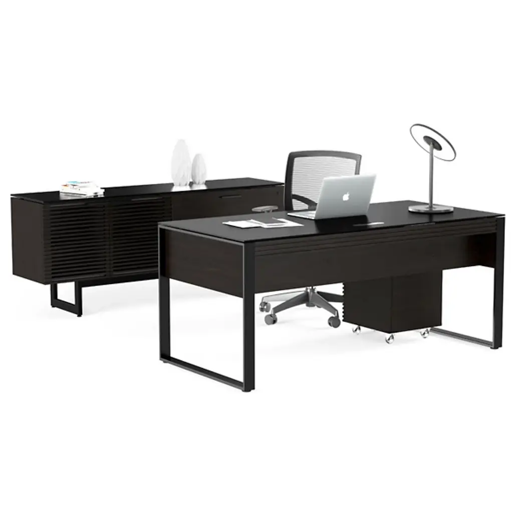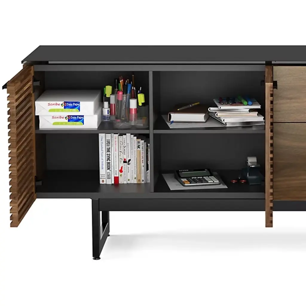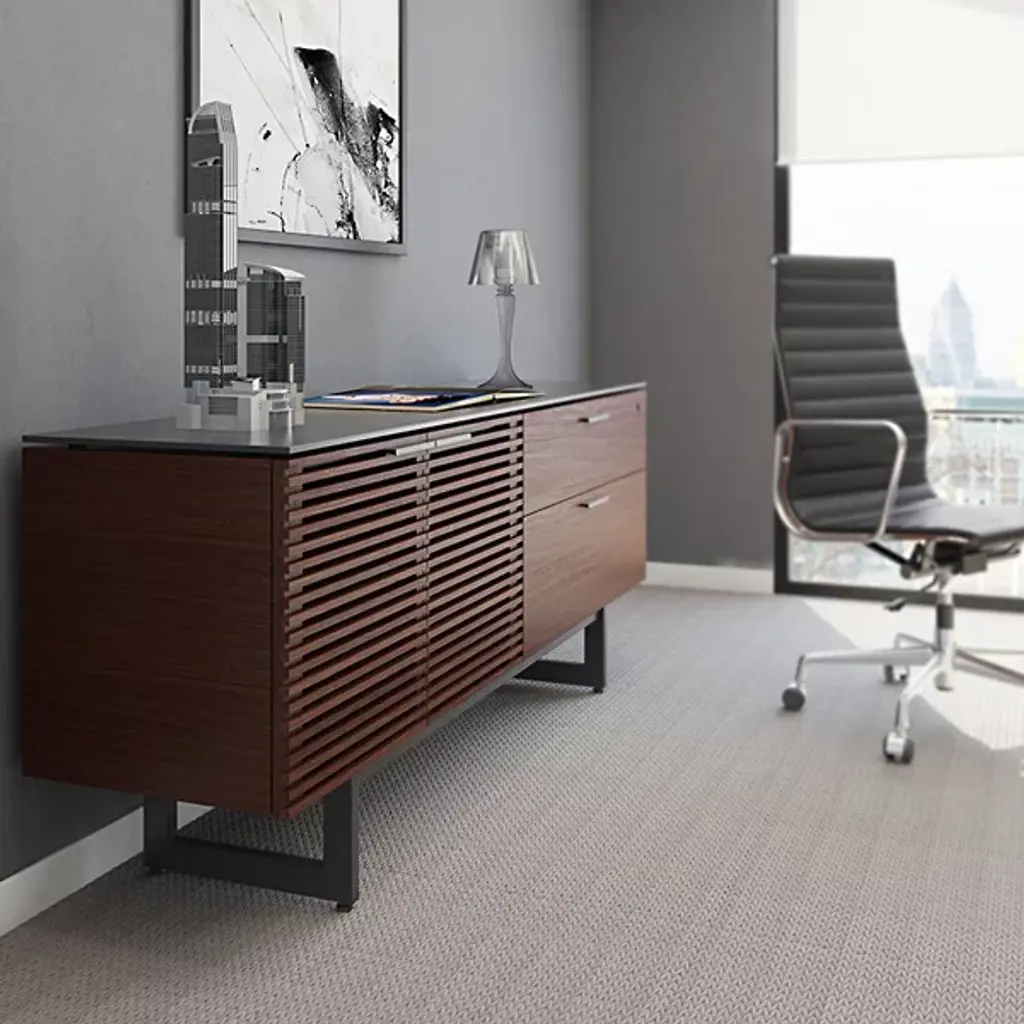 The BDI Corridor Credenza brings organization and Corridor's signature slatted style into the office. On one side, louvered doors conceal a large cabinet with adjustable shelving, while 2 locking drawers occupying the other half can store and secure supplies and hanging file folders. A black Satin-Etched Tempered Glass top complements the wood cabinet and finishes off the piece's luxurious look and feel.