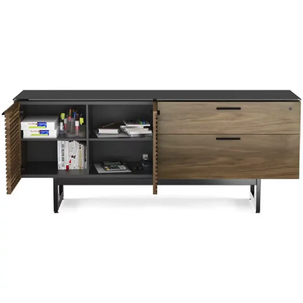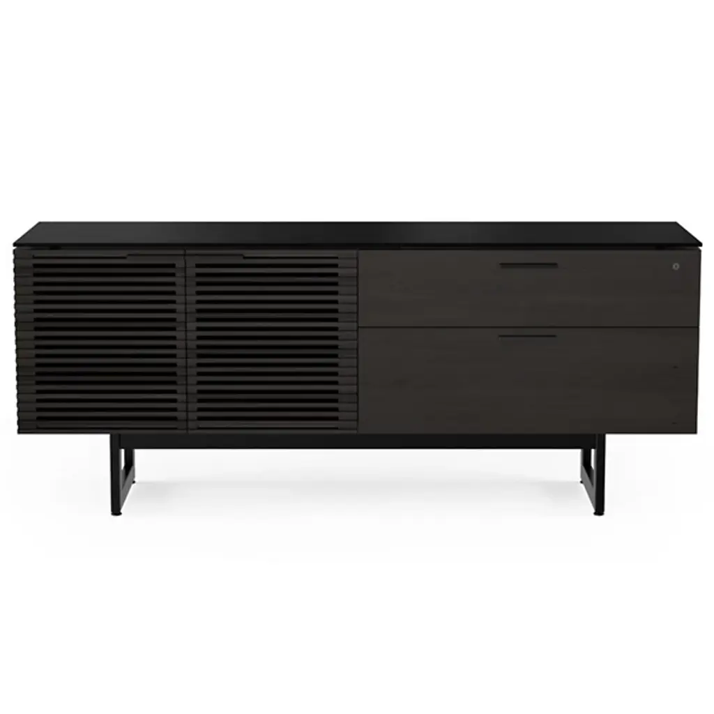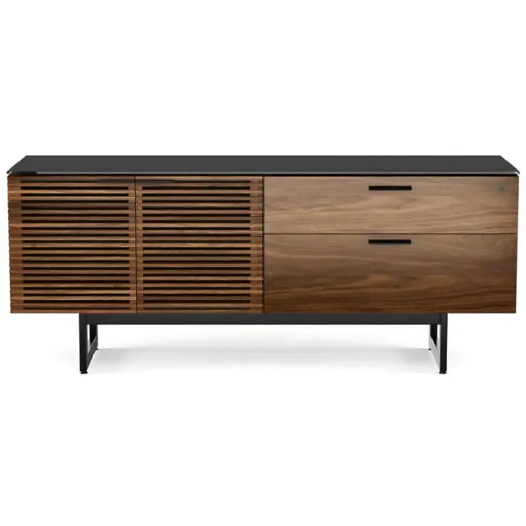 The BDI Corridor Credenza brings organization and Corridor's signature slatted style into the office. On one side, louvered doors conceal a large cabinet with adjustable shelving, while 2 locking drawers occupying the other half can store and secure supplies and hanging file folders. A black Satin-Etched Tempered Glass top complements the wood cabinet and finishes off the piece's luxurious look and feel.