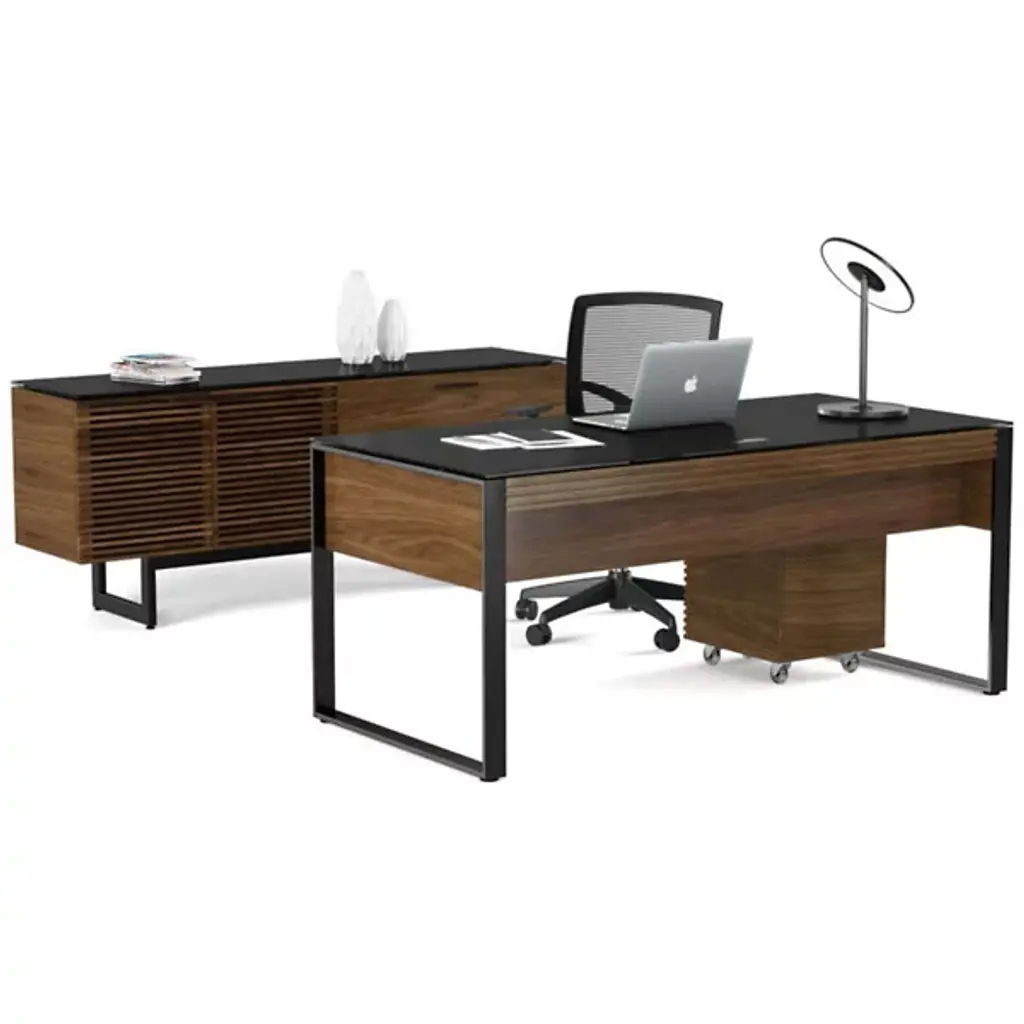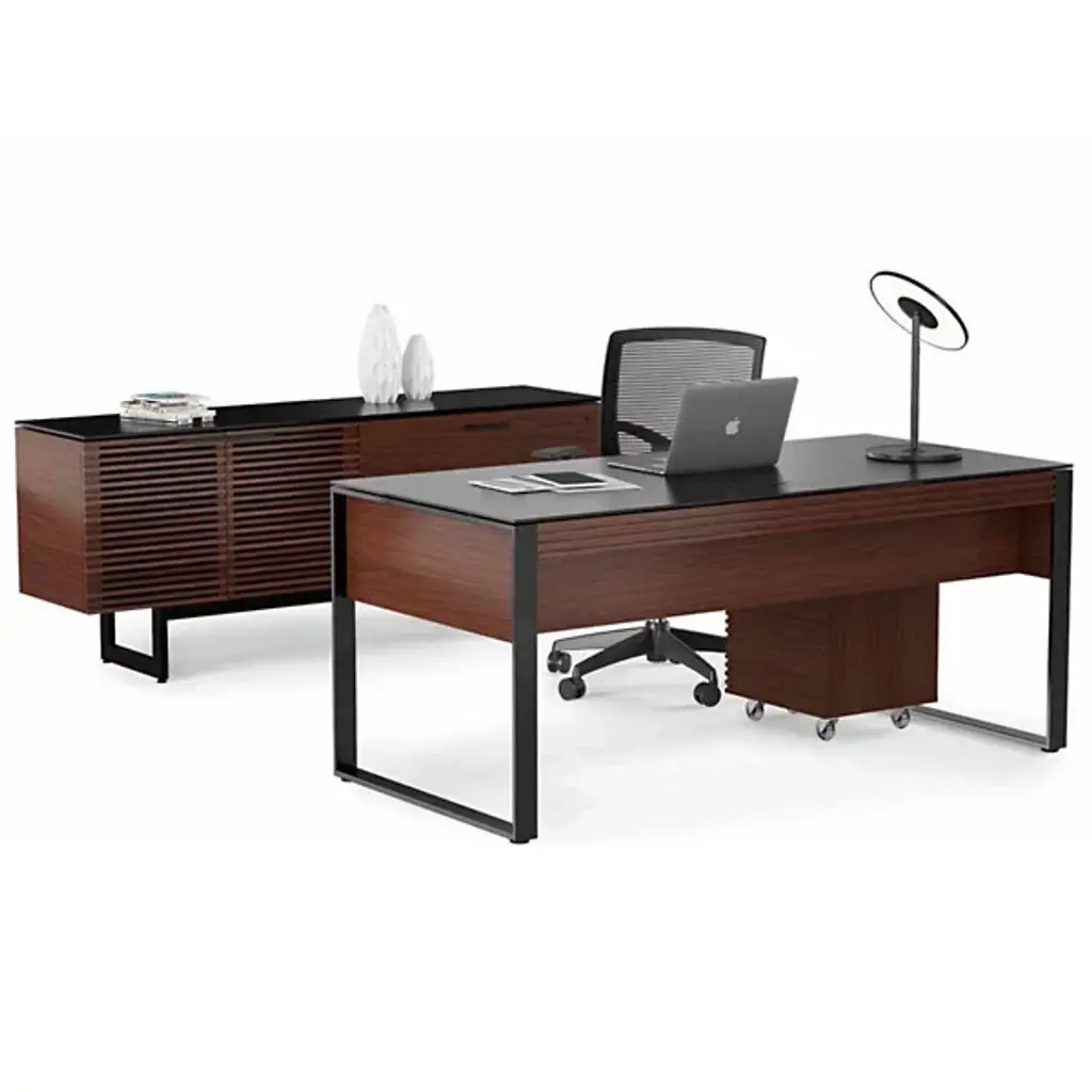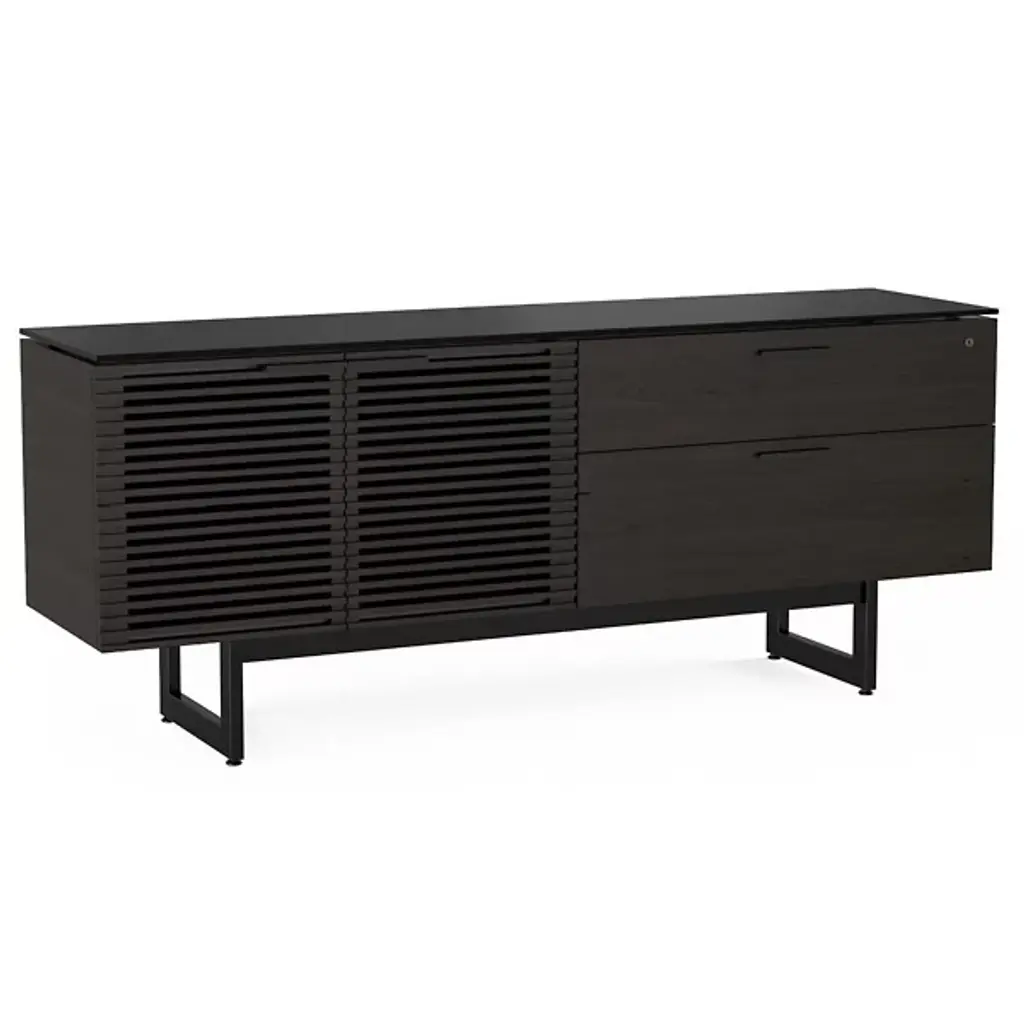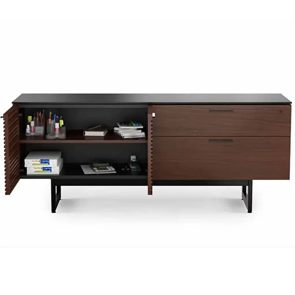 The BDI Corridor Credenza brings organization and Corridor's signature slatted style into the office. On one side, louvered doors conceal a large cabinet with adjustable shelving, while 2 locking drawers occupying the other half can store and secure supplies and hanging file folders. A black Satin-Etched Tempered Glass top complements the wood cabinet and finishes off the piece's luxurious look and feel.