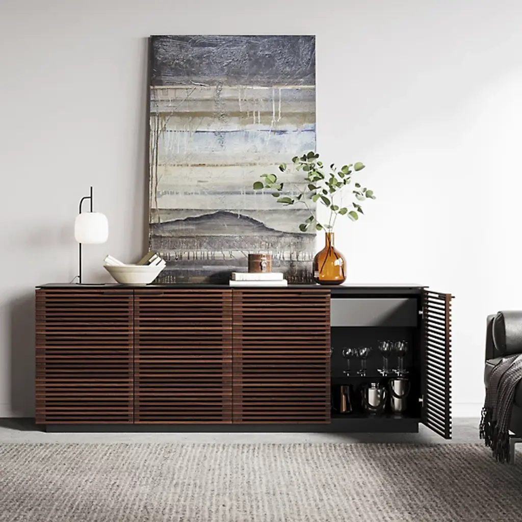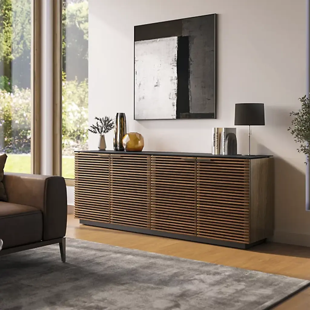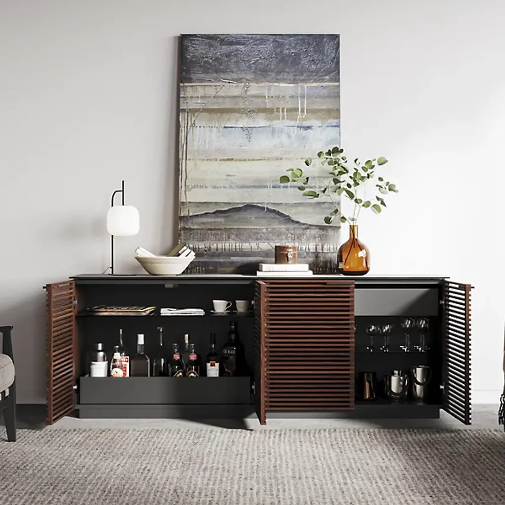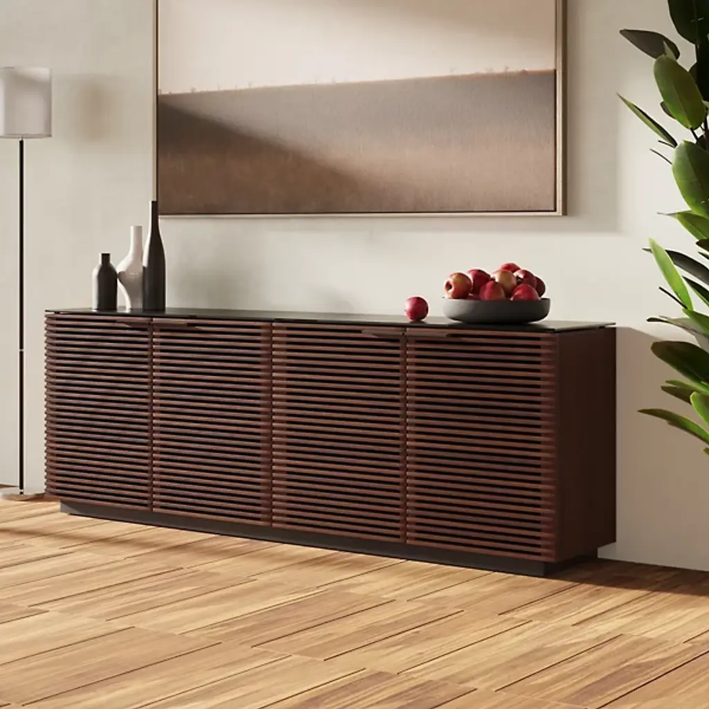 Introducing BDI's luxurious Corridor Storage 4-Door Credenza, envisioned and created for modern homes. This item is expertly crafted from natural hardwood and MDF, further accentuated with satin-etched tempered glass. It's not just about looks; functionality has been considered at every turn. With two adjustable glass shelves, the credenza seamlessly turns into four distinct compartments, making it an ideal piece for your office, living room or bedroom. The modern style sets a sophisticated impression, and the nuanced design communicates both elegance and comfort.