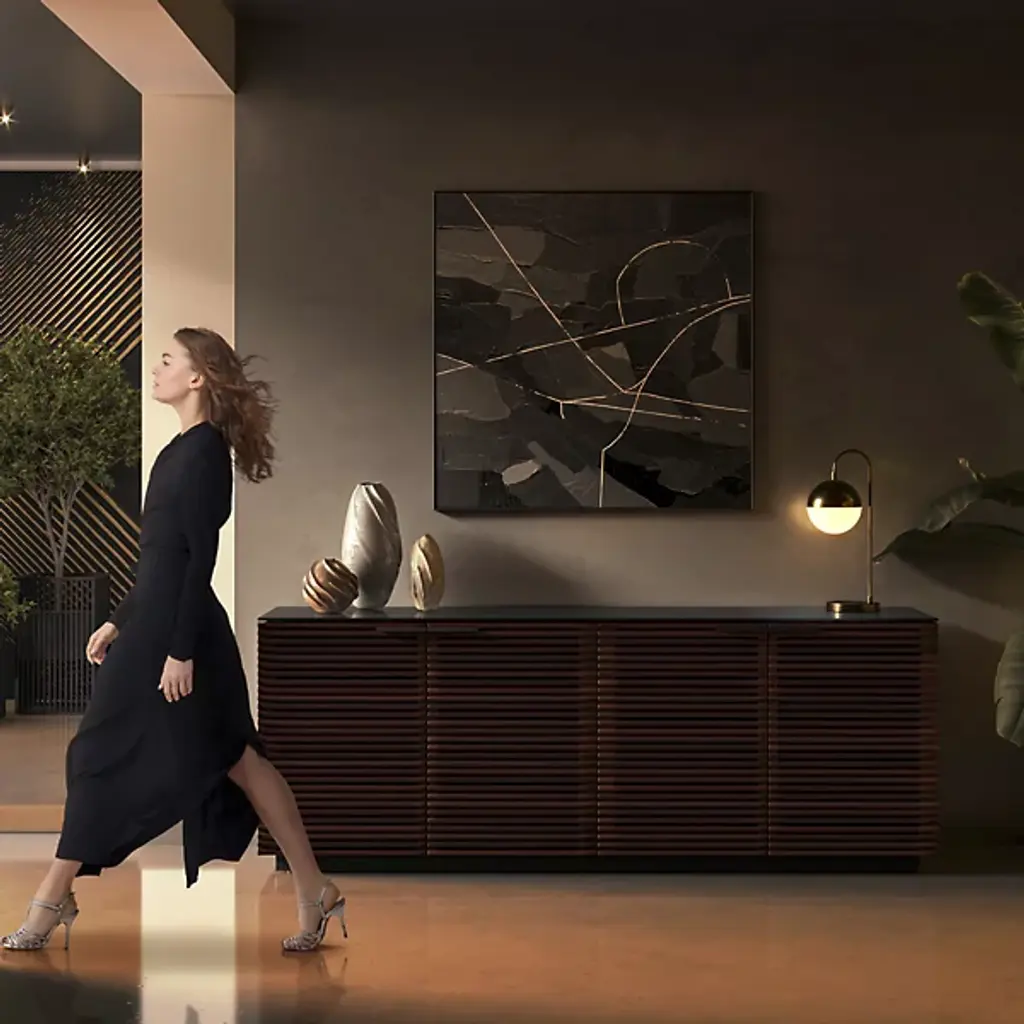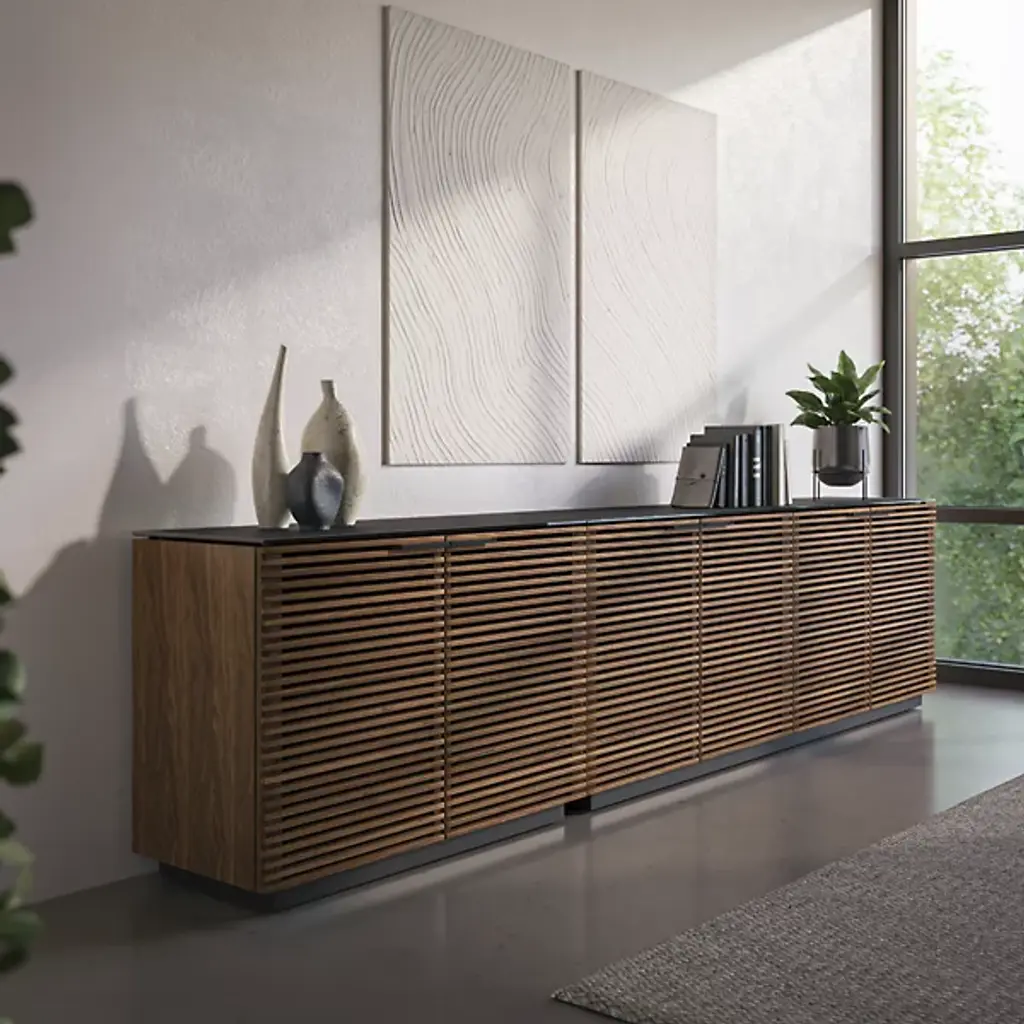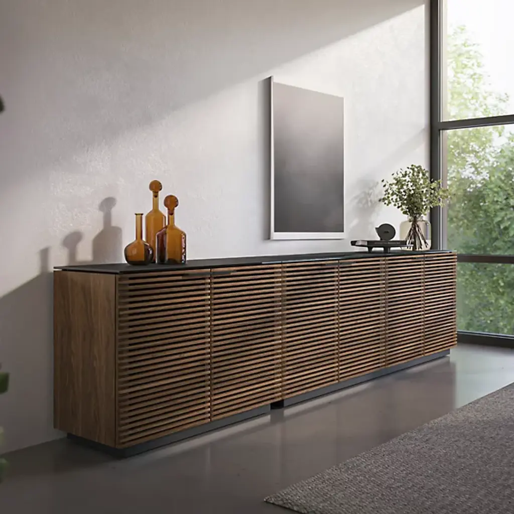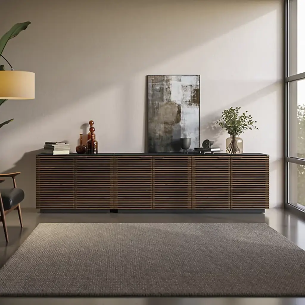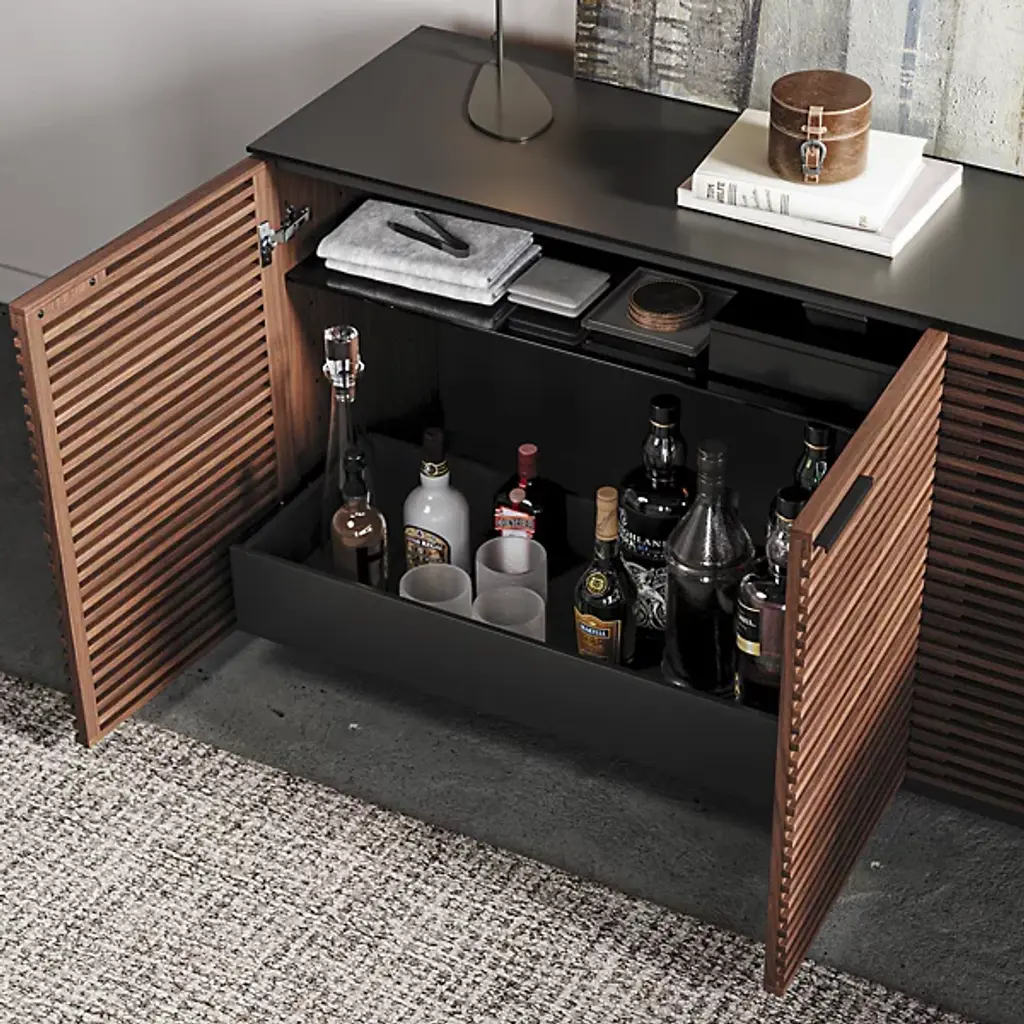 Introducing BDI's luxurious Corridor Storage 4-Door Credenza, envisioned and created for modern homes. This item is expertly crafted from natural hardwood and MDF, further accentuated with satin-etched tempered glass. It's not just about looks; functionality has been considered at every turn. With two adjustable glass shelves, the credenza seamlessly turns into four distinct compartments, making it an ideal piece for your office, living room or bedroom. The modern style sets a sophisticated impression, and the nuanced design communicates both elegance and comfort.