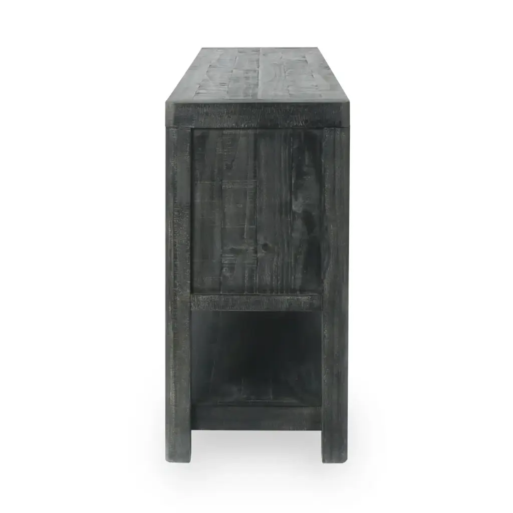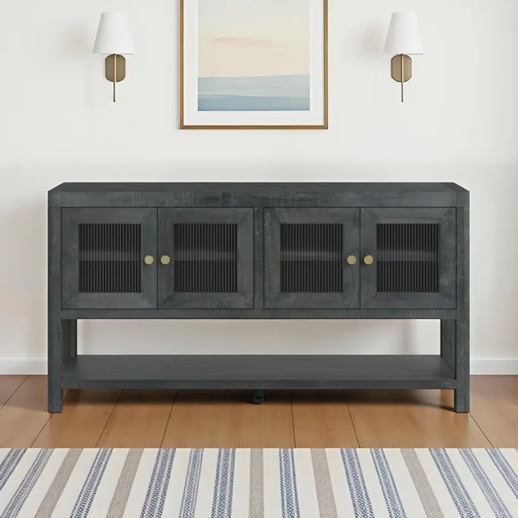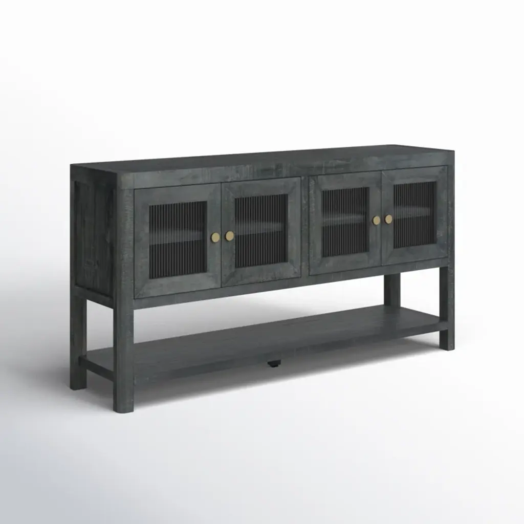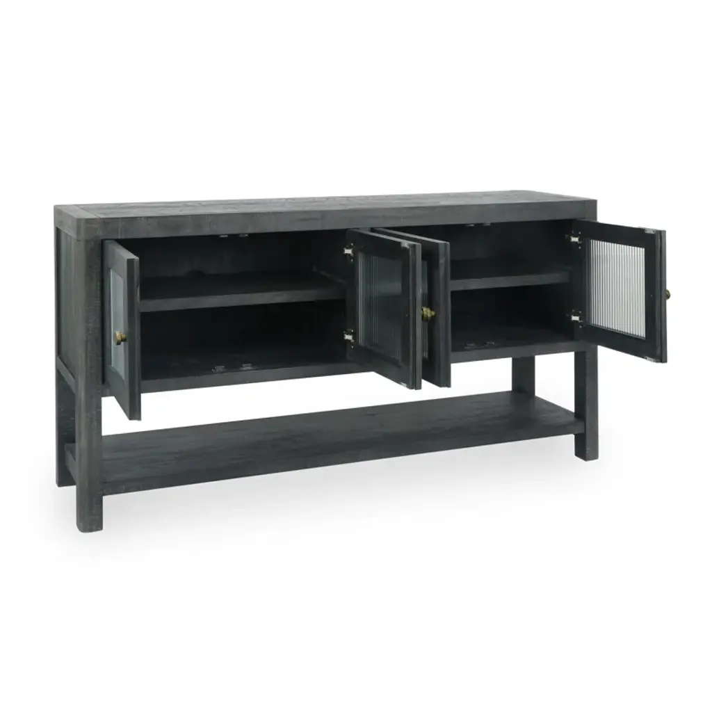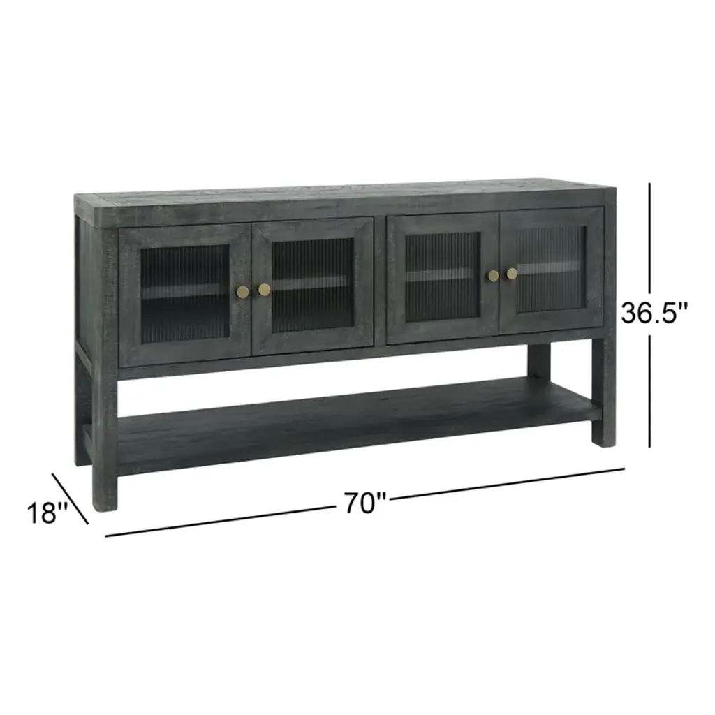 Crafted from reclaimed pine wood, this cabinet features the intriguing character of old-growth wood including variations in color, grain patterns, and historical markings, all of which give each piece a distinctive beauty. Fluted glass doors dress up the minimalist design, adding dimension and a touch of shine to the piece.