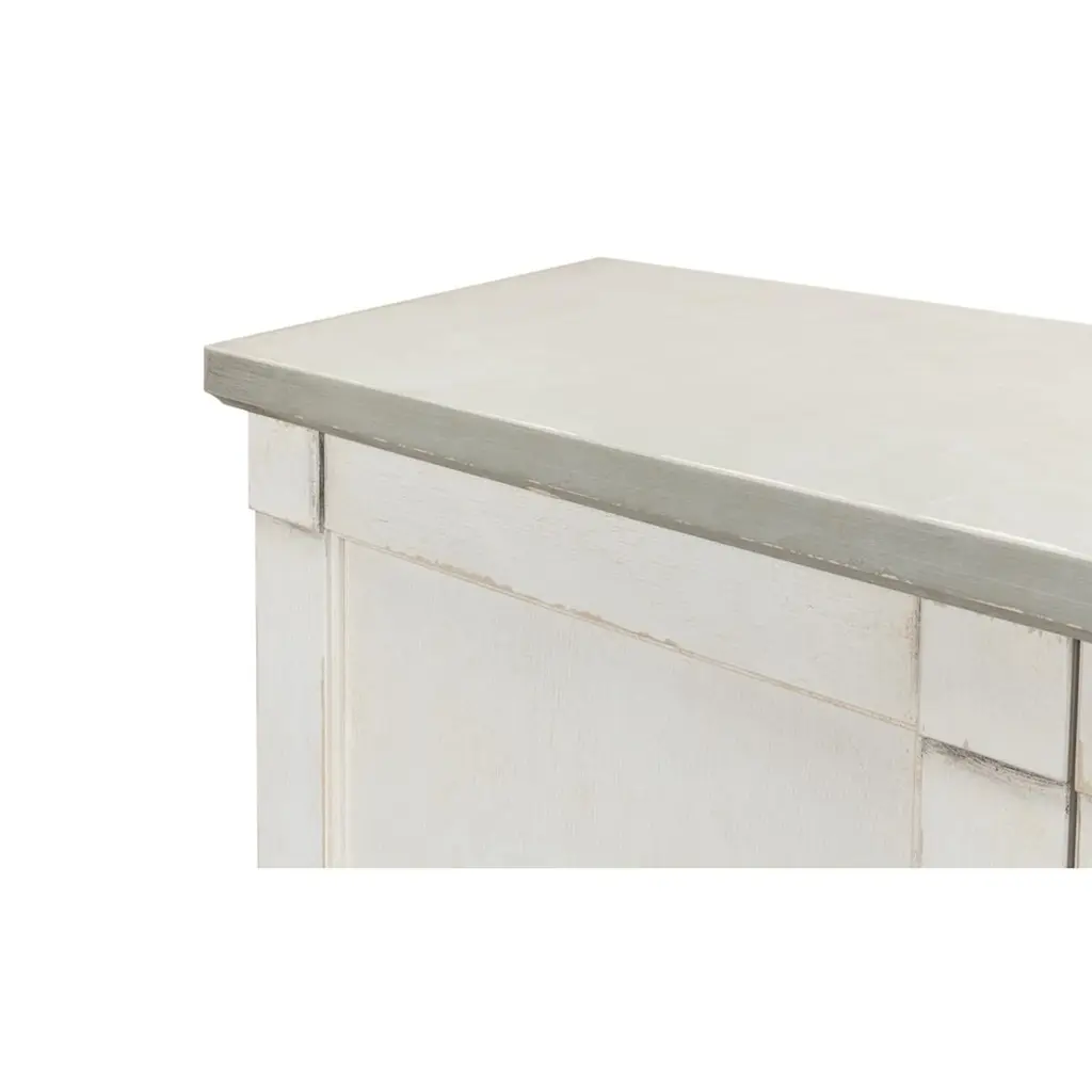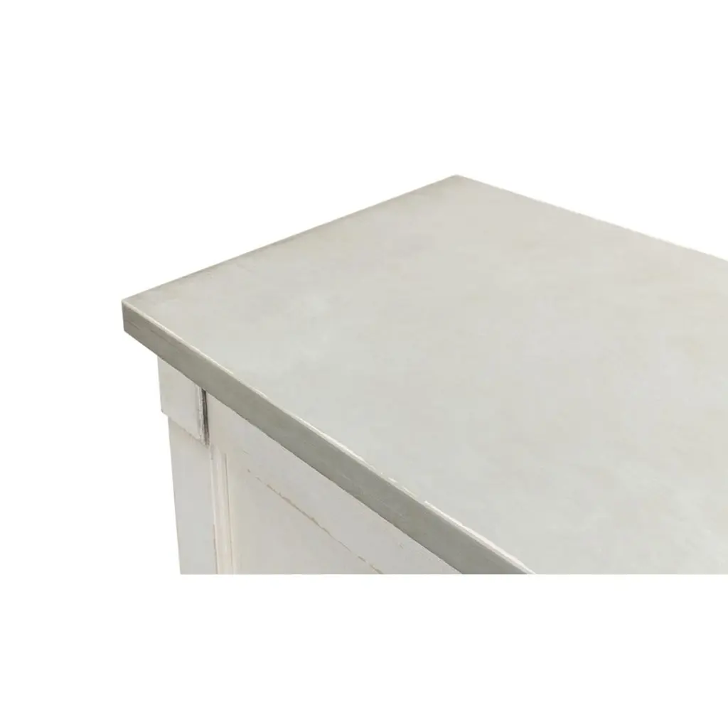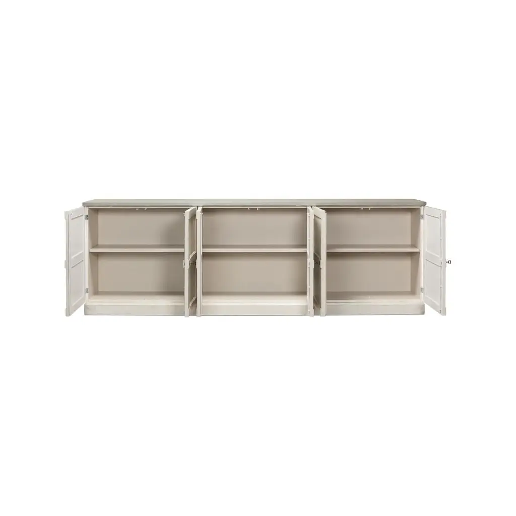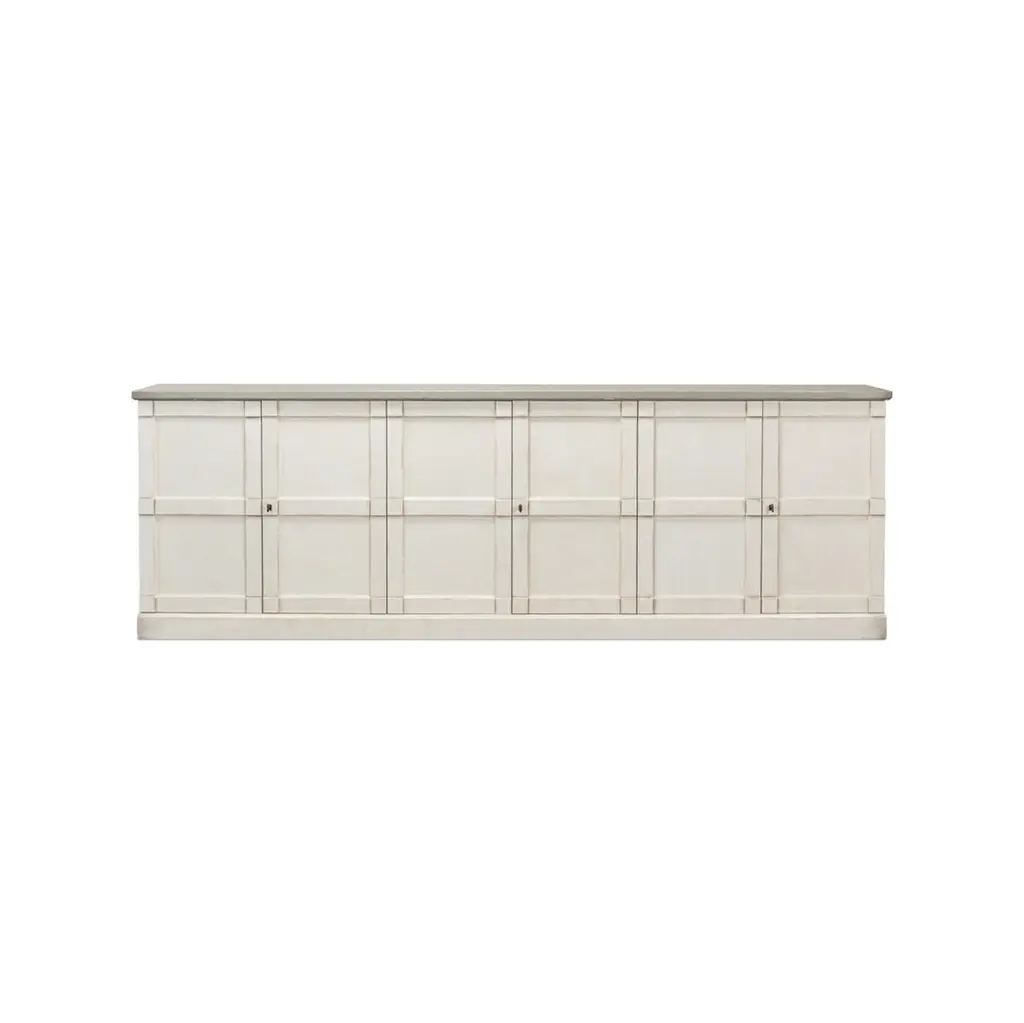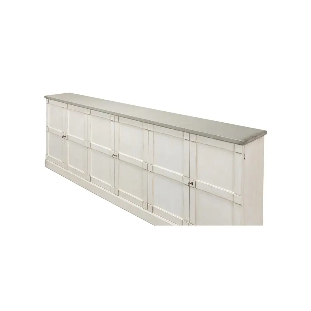 Made of pine finished in a stucco antique white paint that is lightly distressed and a light gray painted top. with six doors, a rectangular form and a perfect depth of 15". The doors open to a painted interior with shelves. The cabinet is raised on a square plinth base.Dimensions: 112" W x 15" D x 38" H
