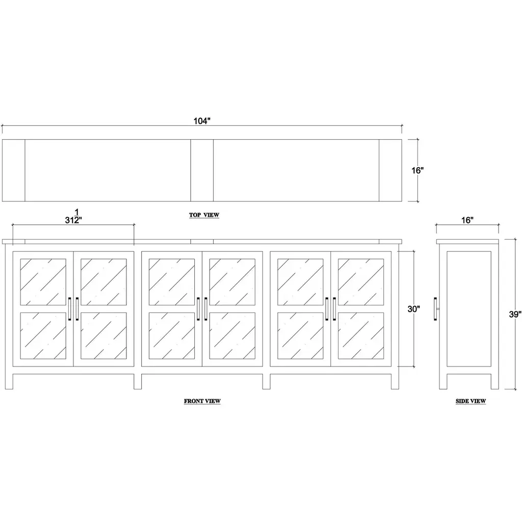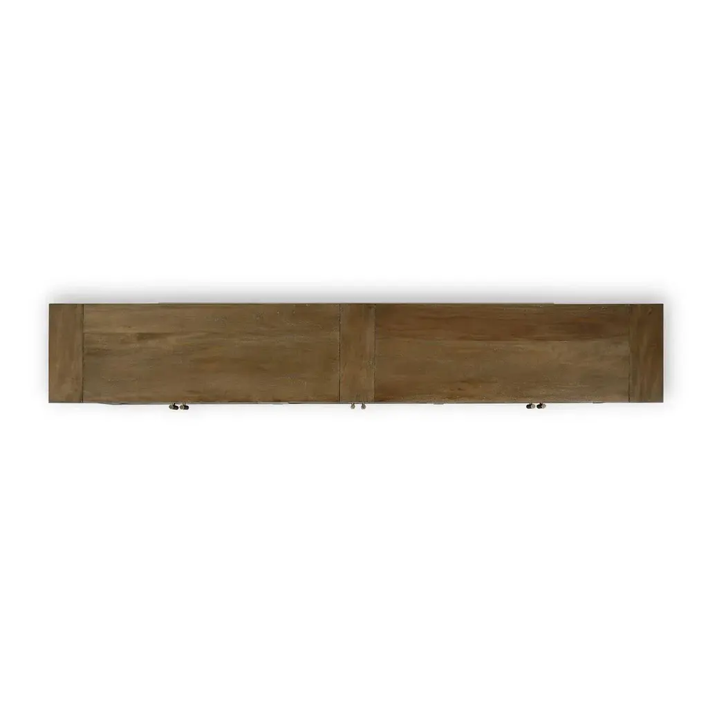 This elegant piece provides ample storage space while adding a touch of rustic charm to your living or dining area. Crafted from solid mahogany and finished in our straw wash exterior, this long cabinet features six glass-paneled doors. The interior, hand-painted in our white harvest finish, includes shelves for organized storage and stylish display of your favorite items. Accented with stylish metal handles, the sideboard exudes a refined touch that enhances its rustic appeal. With its combination of classic design and modern practicality, the Country Wood Sideboard with Glass Doors is a beautiful and functional addition to any home. Dimensions: 104" W x 16" D x 39" H