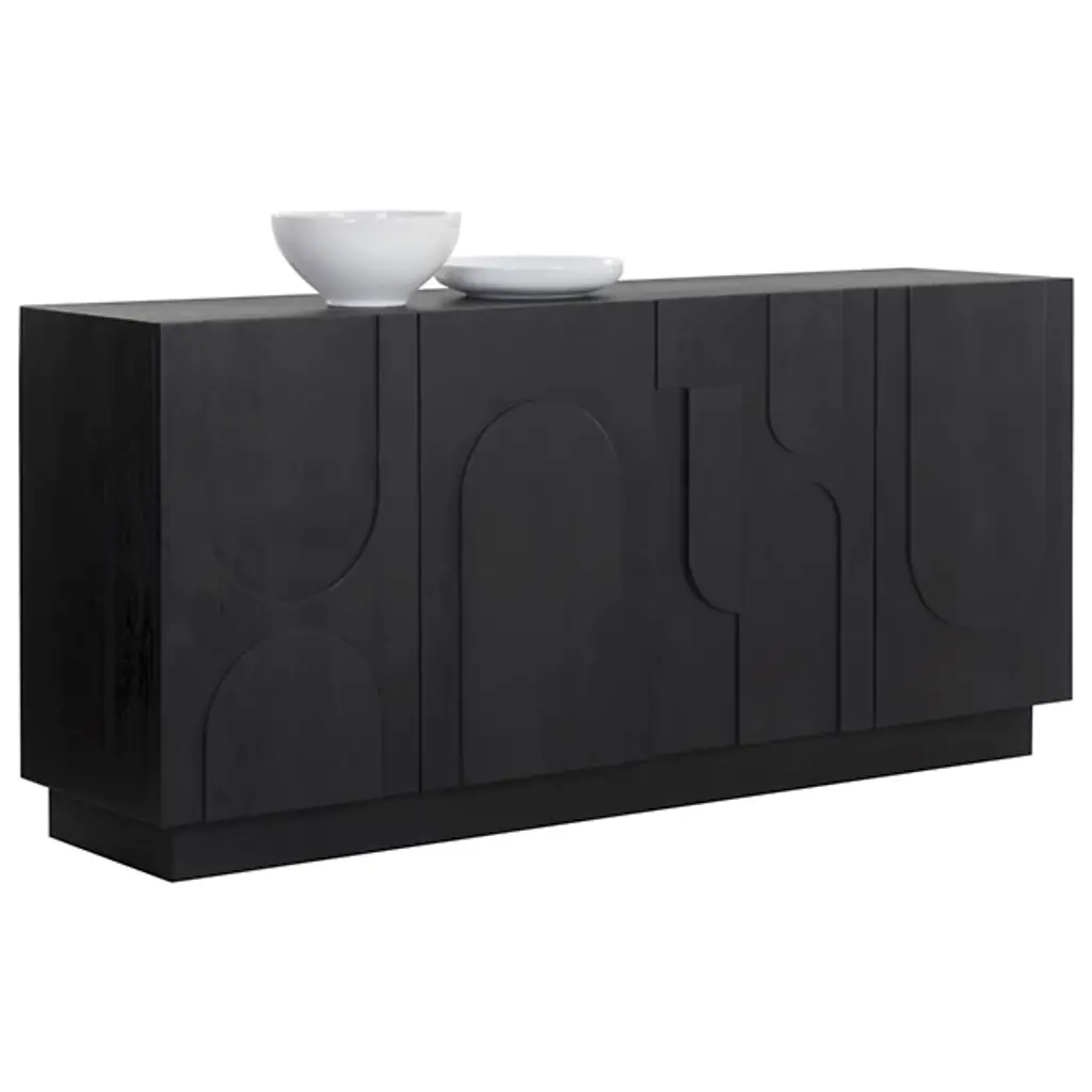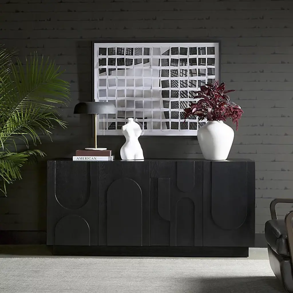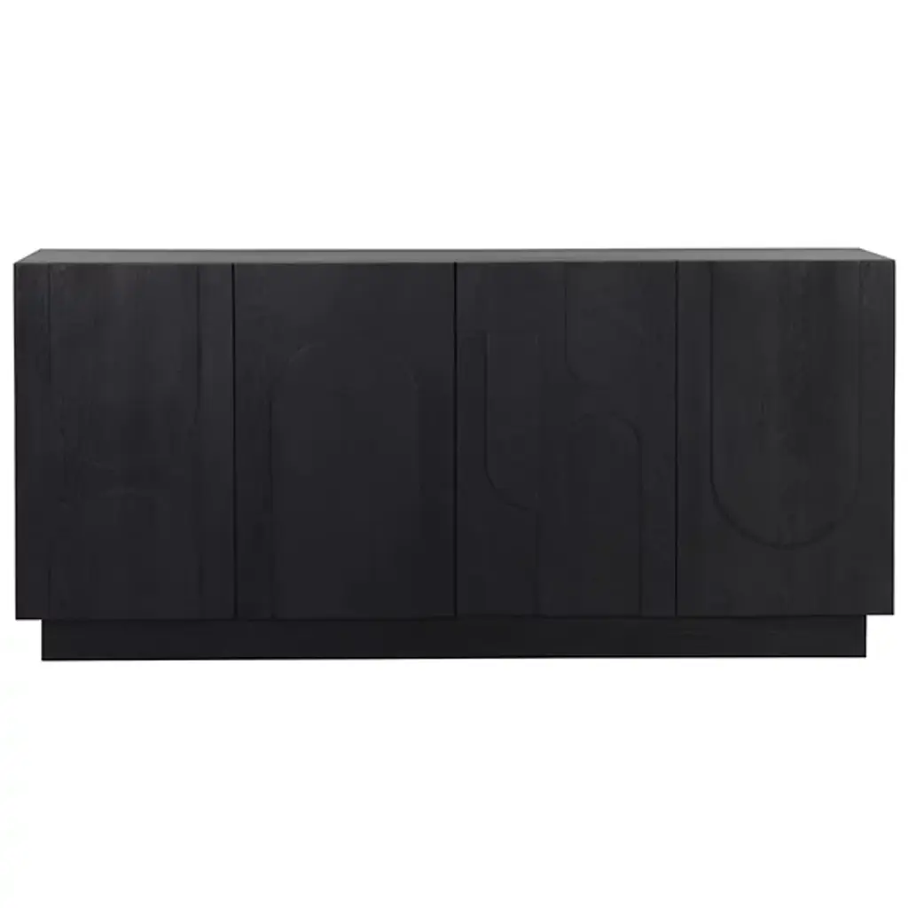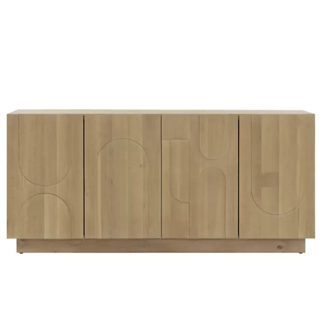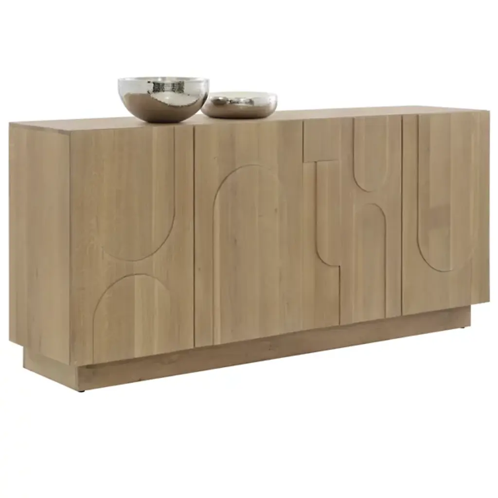 The Cove Sideboard from Sunpan reimagines Scandinavian minimalism through artisanal Indian craftsmanship. Each piece is handcrafted from solid oak wood, displaying unique grain patterns and natural character marks that celebrate its organic beauty. The rustic finish complements four soft-close cabinets with slight finger grooves, while the chamfered back adds appealing interest. The blocky yet refined construction offers a testament to refined storage where mid-century aesthetics meet contemporary function.